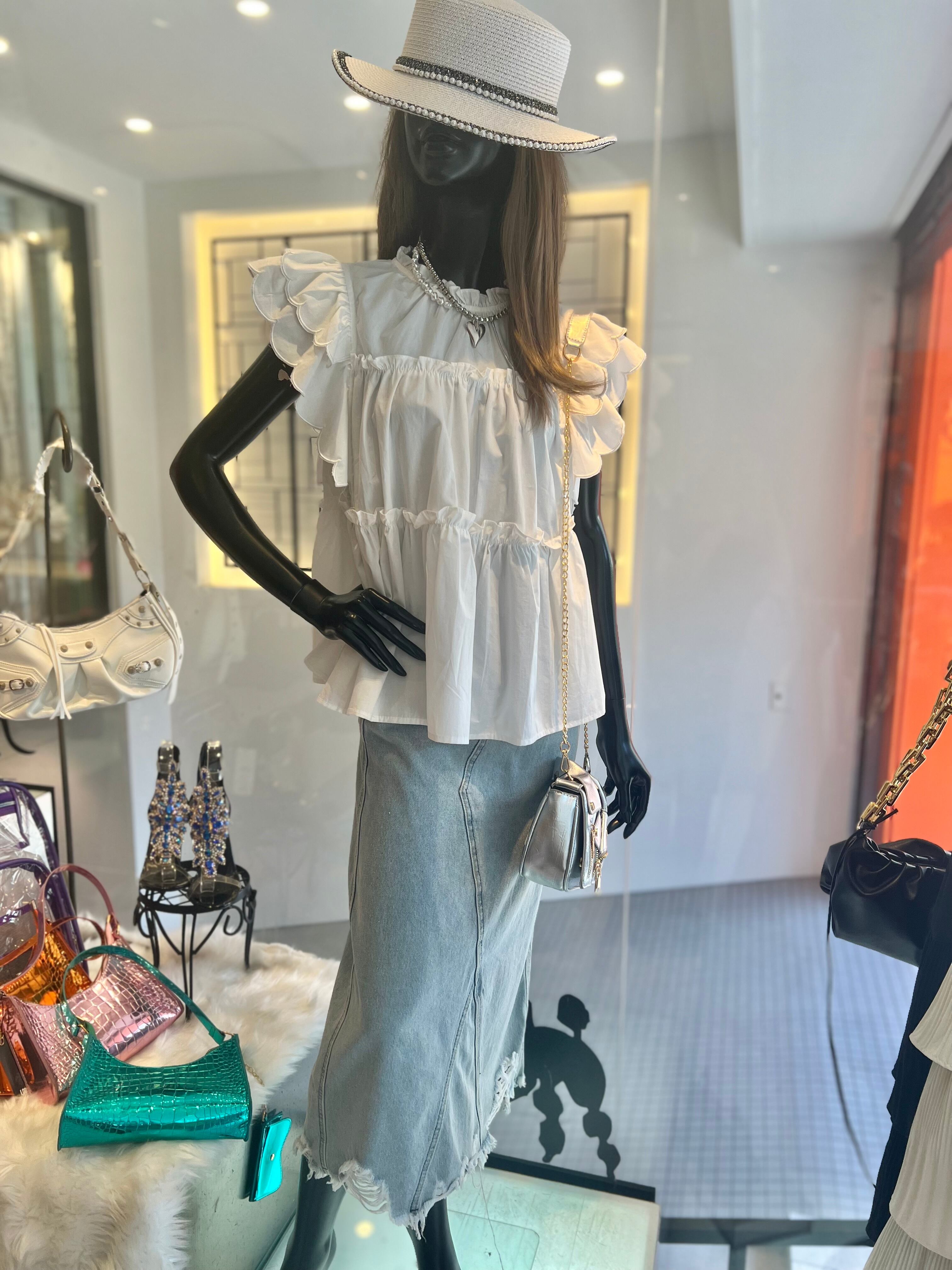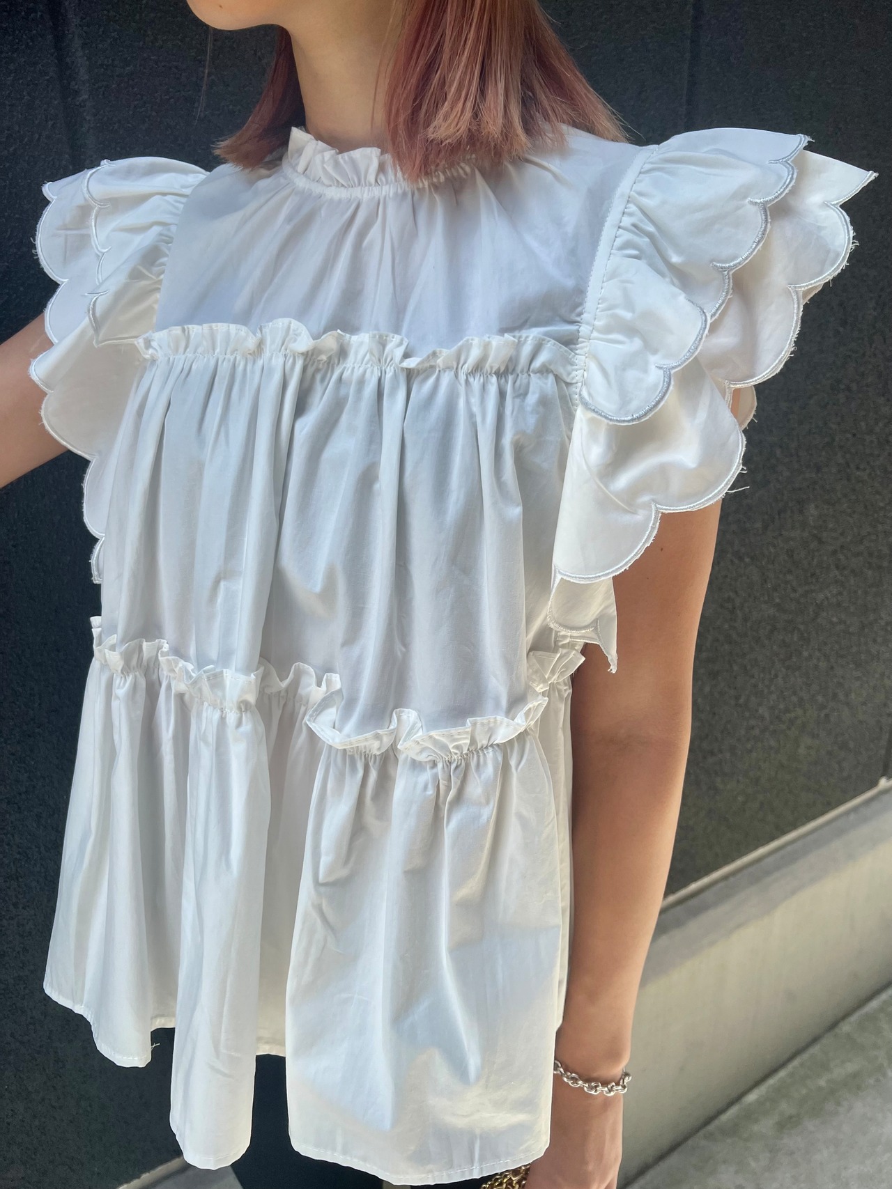 可愛らしいデザインが魅力のフリルスリーブギャザーデザイントップス。