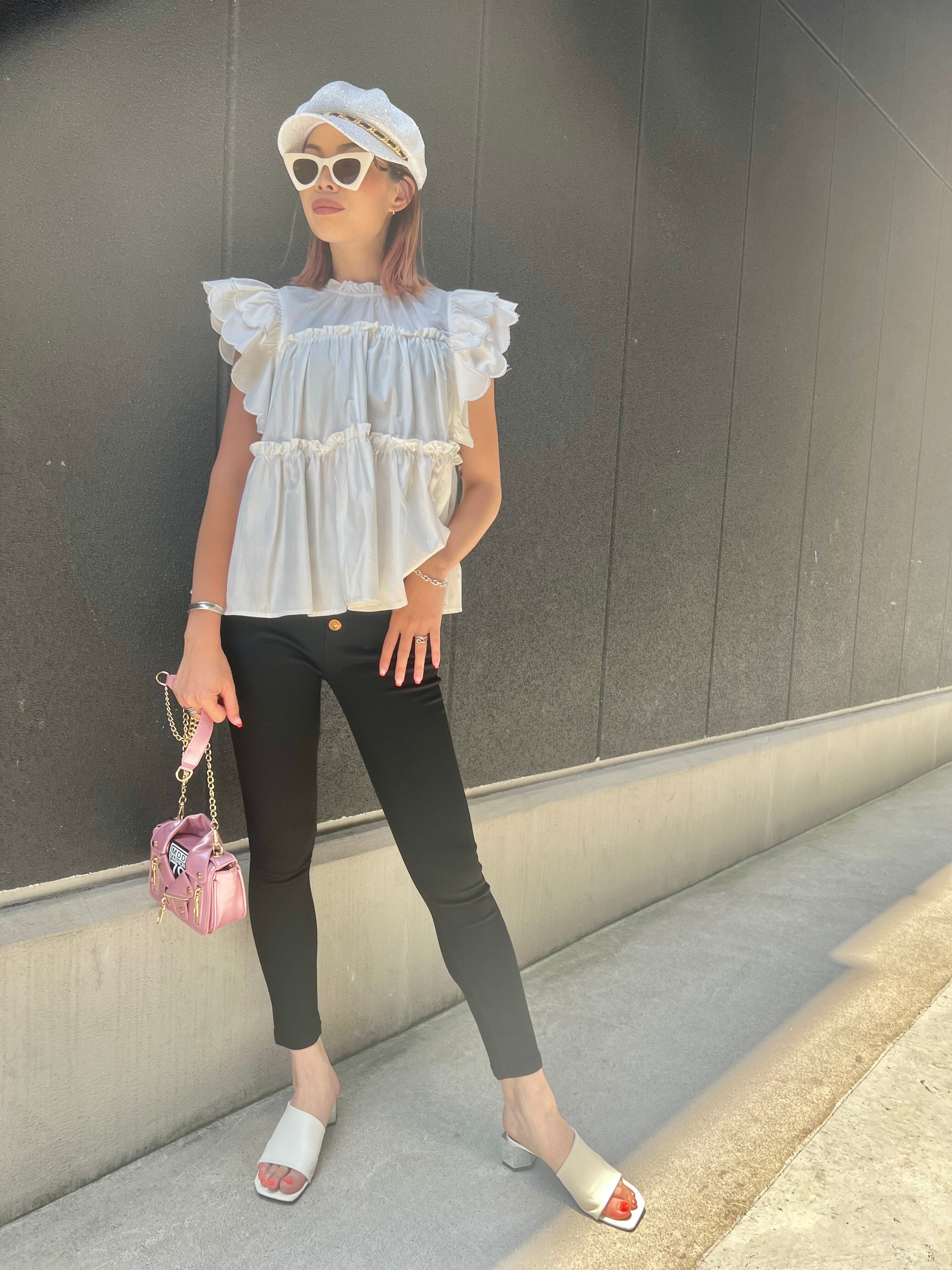 フリルとギャザーの組み合わせが、女性らしさを引き立てると同時に、
