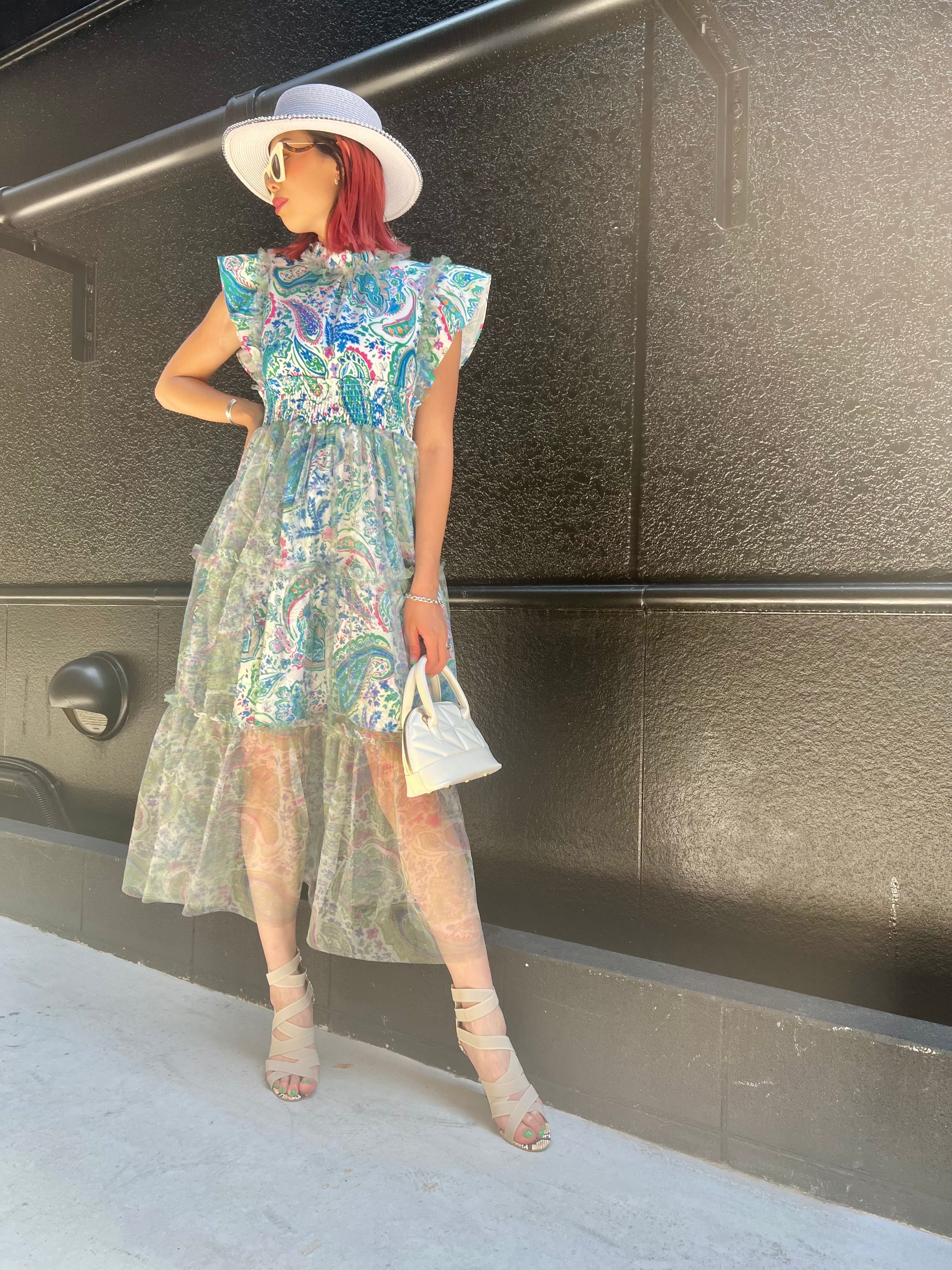 チュールと切り替えデザインが印象的なペイズリー柄ワンピースです。