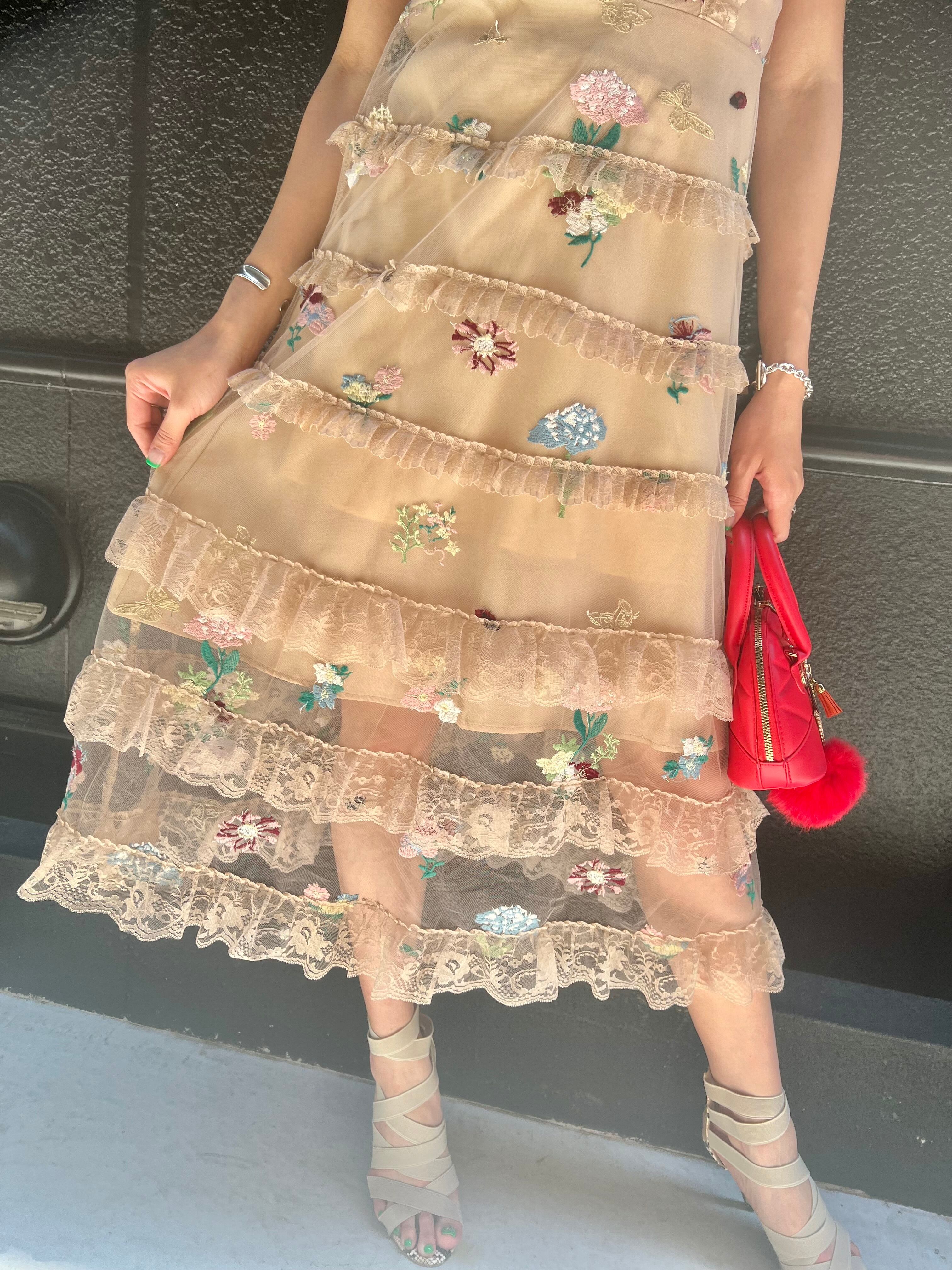 刺繍が美しく施されたデザインで、ふんわりとしたチュールスカートが上品な印象を与えます。結婚式や二次会などのパーティーシーンにぴったりの一着です。