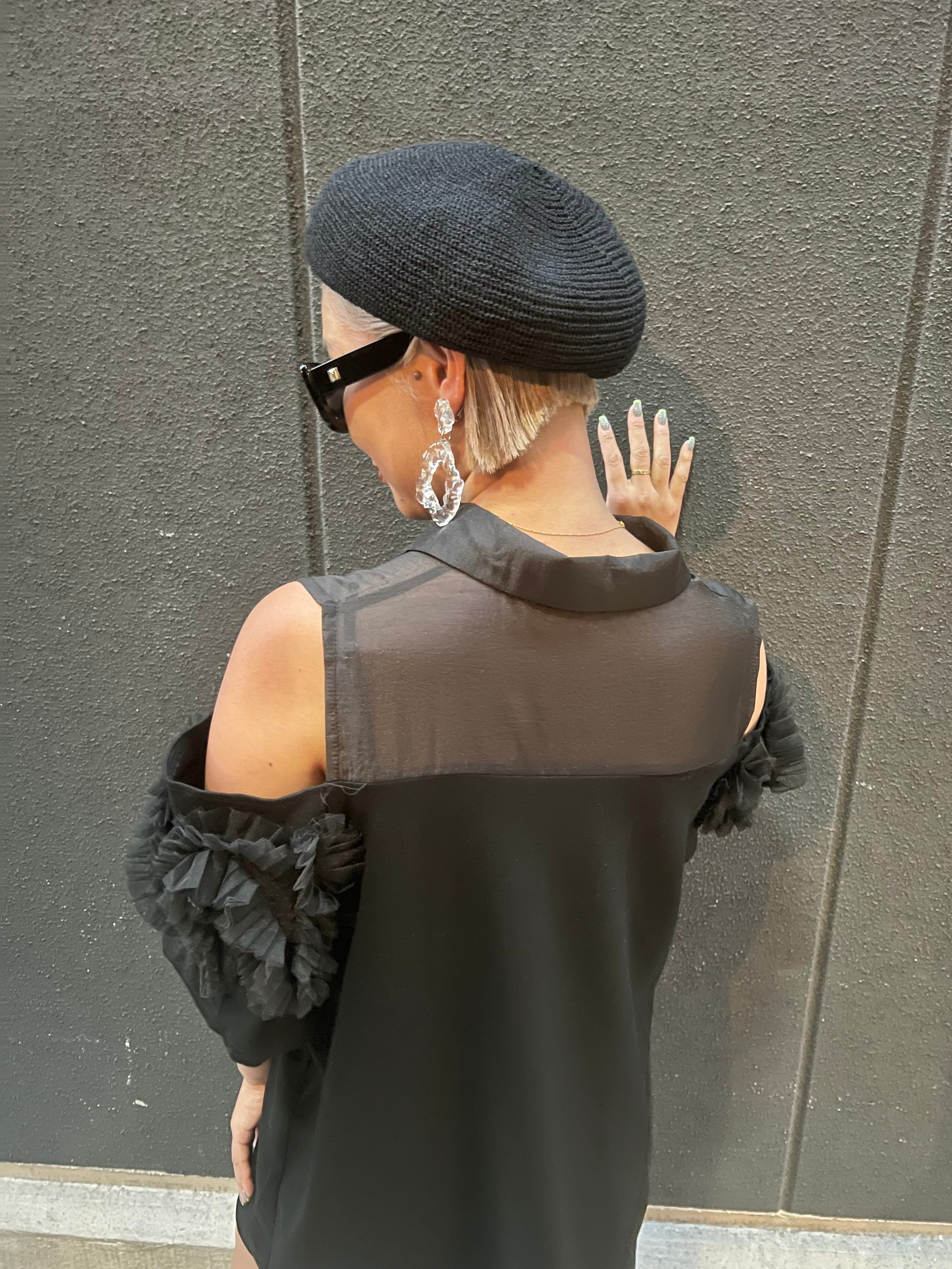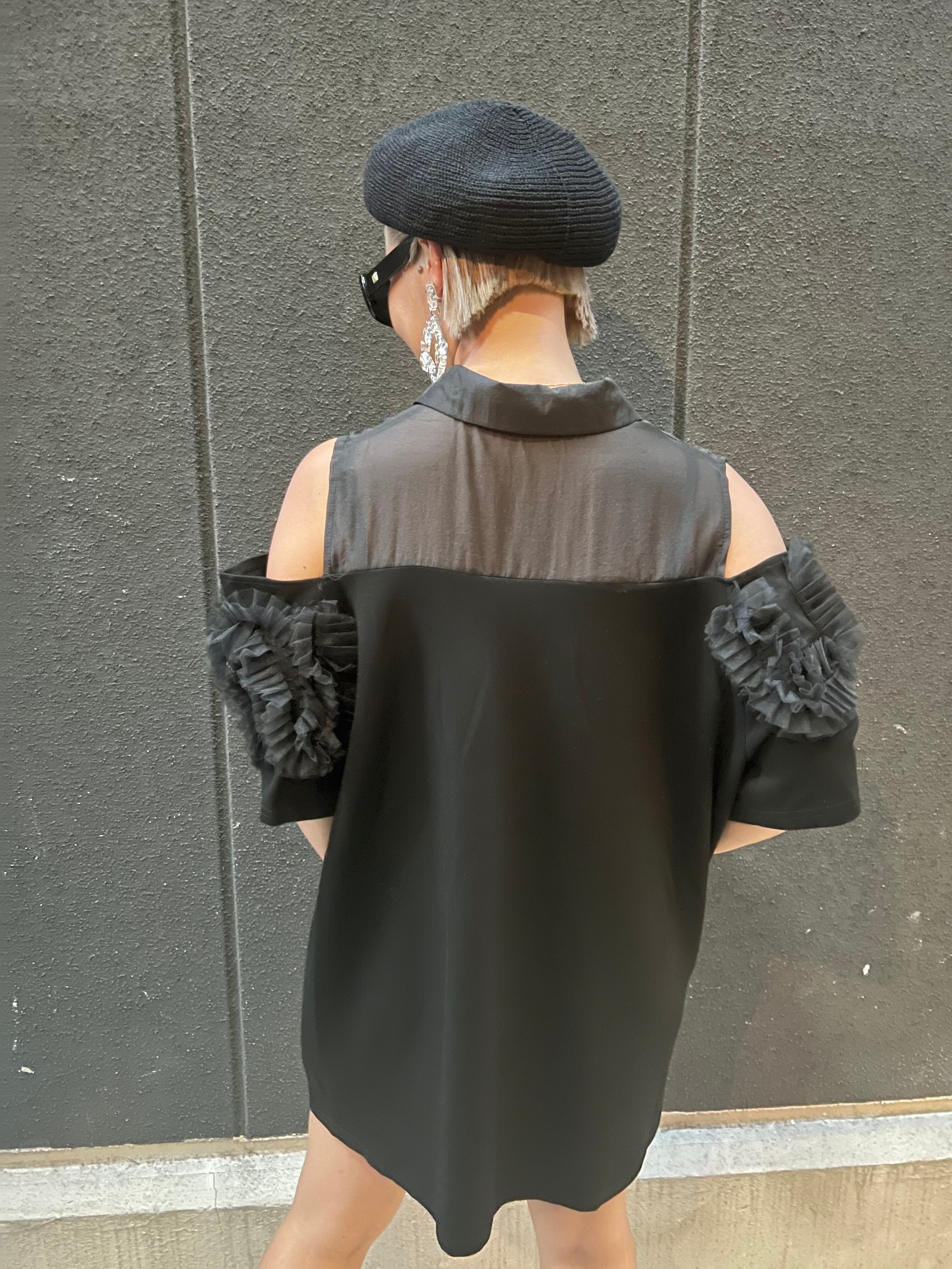 tulle frill change open shoulder shirt one-piece ワンピース シャツワンピ チュール フリル オープンショルダー ミニワンピ
