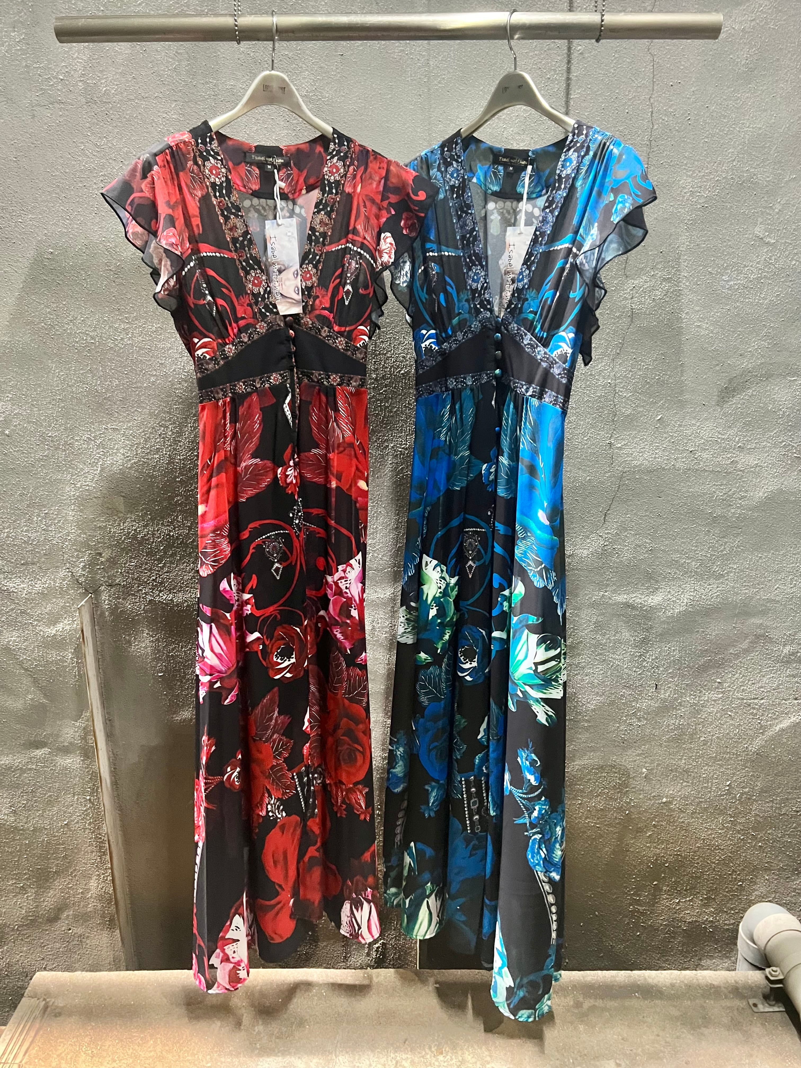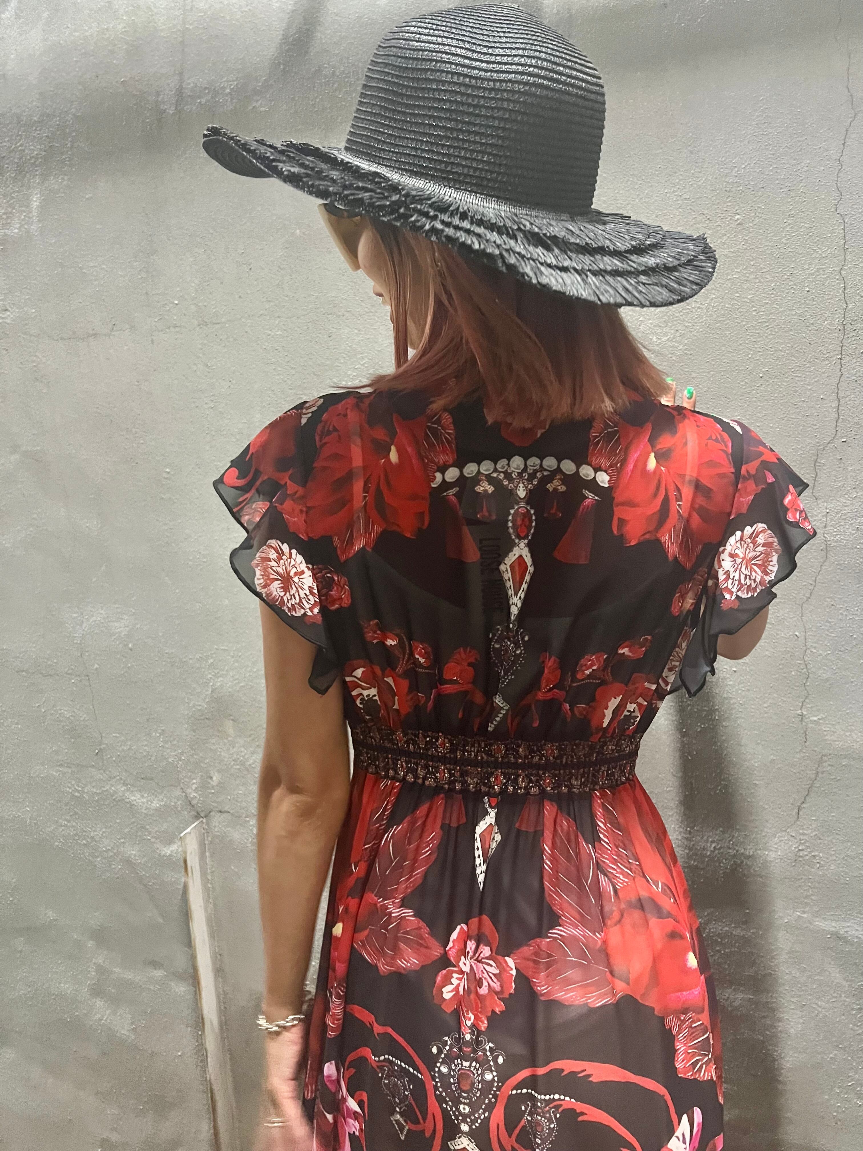 flower print deep V-neck frill sleeve one-piece ワンピース シフォン 花柄 Vネック フリル ドレス 二次会 パーティー