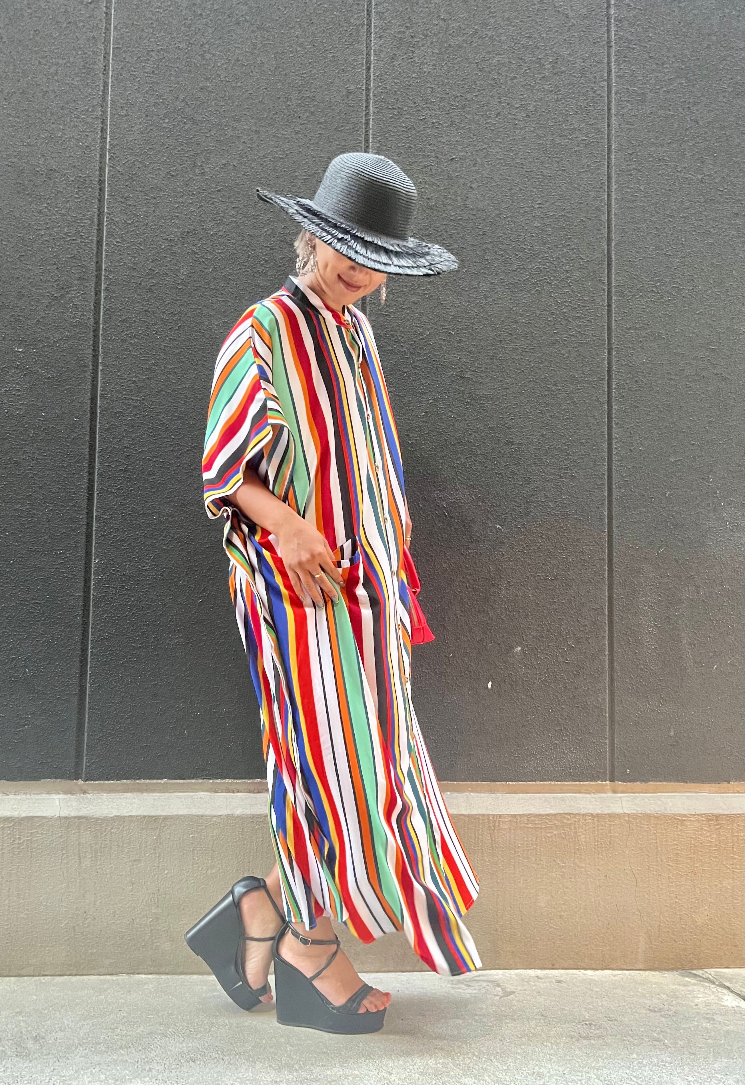ストライプ柄が華やかで、マルチカラーでさらに目を引く一着です♪