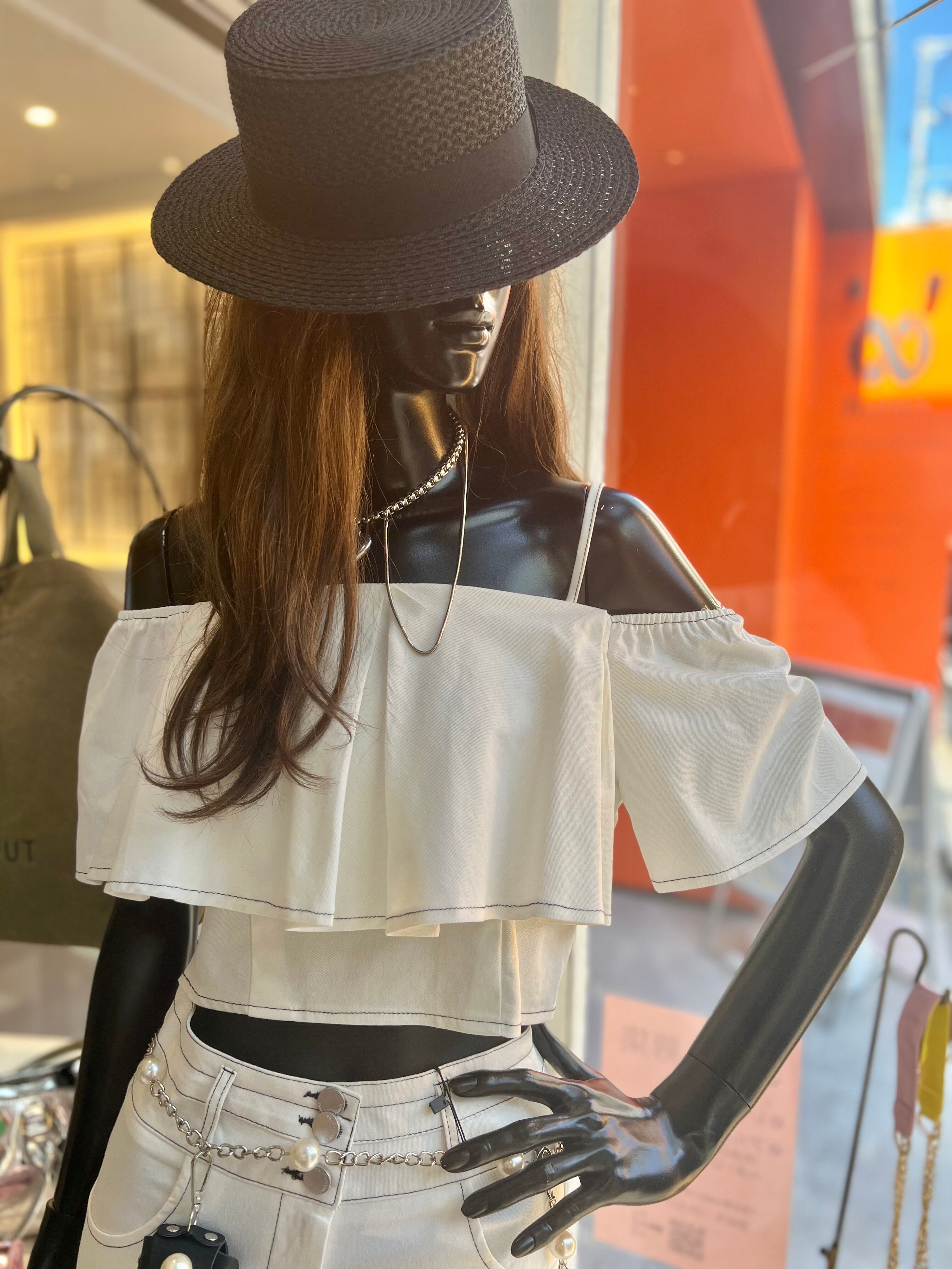 オフショルダー風のトップスに、ショート丈のパンツがセットになった2Pセットです。トレンド感溢れるオフショルダーデザインが華やかさを演出し、女性らしい魅力を引き立てます。
