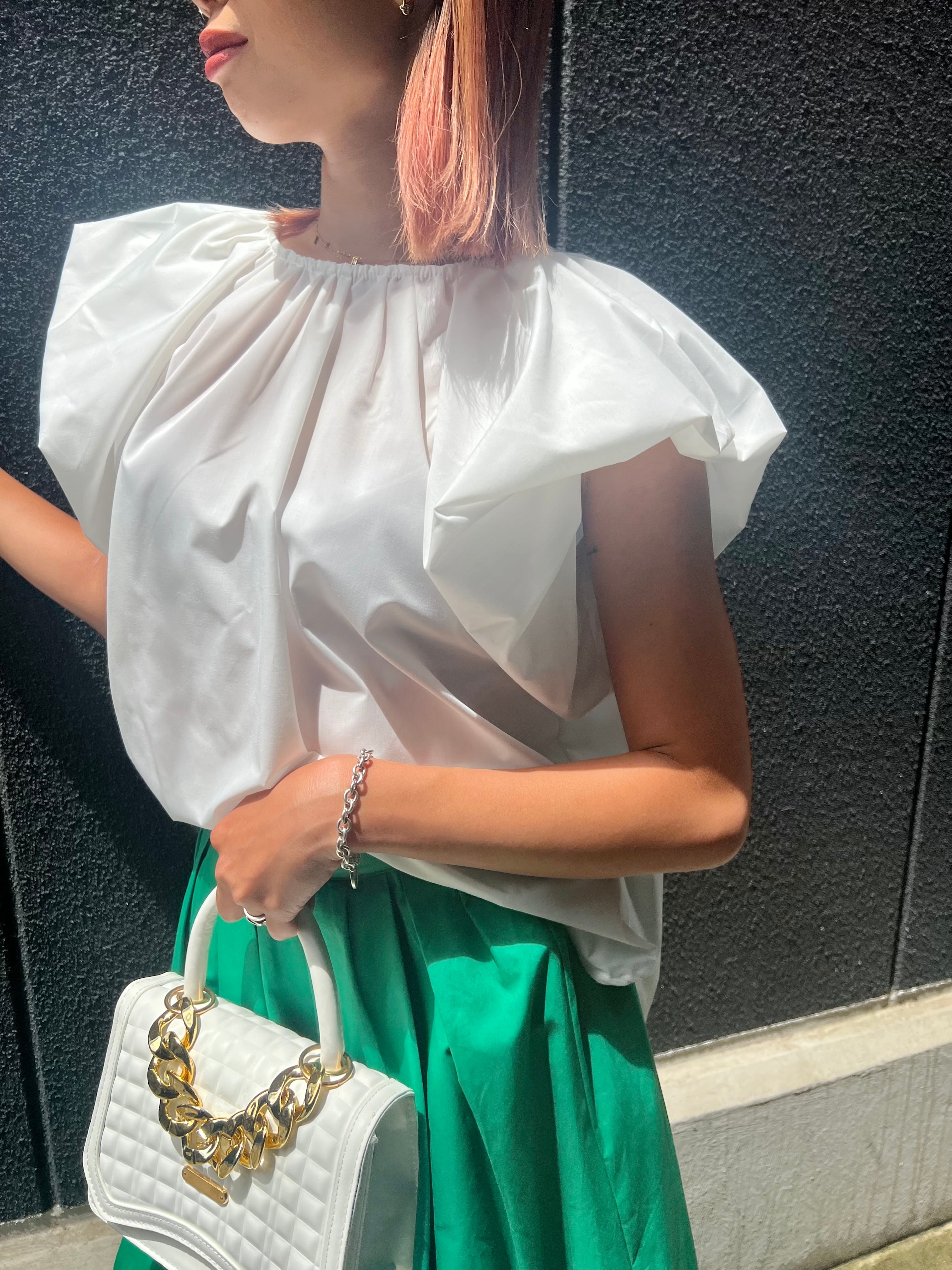 シンプルなバルーンスリーブ・ギャザーネック・トップス。