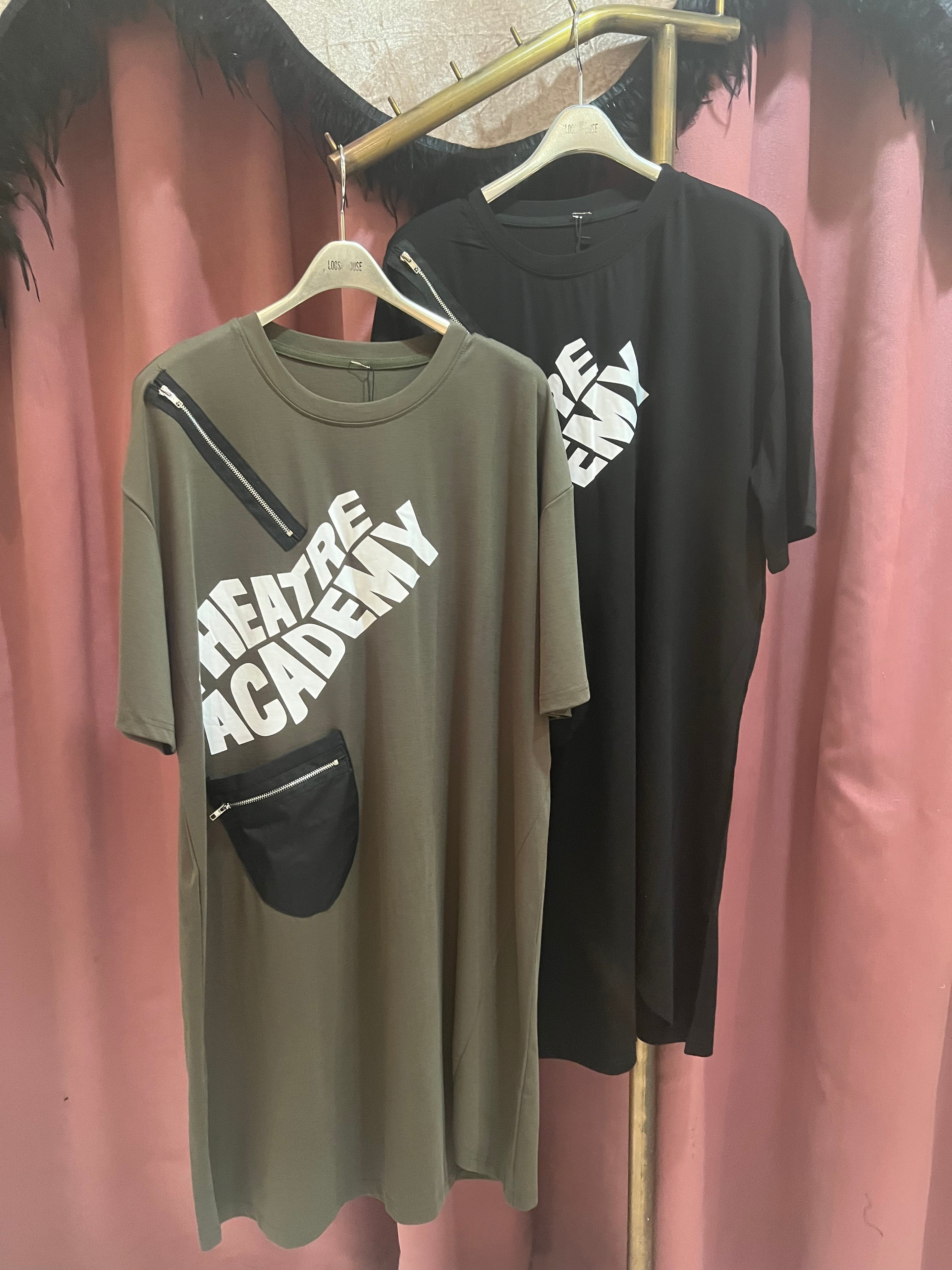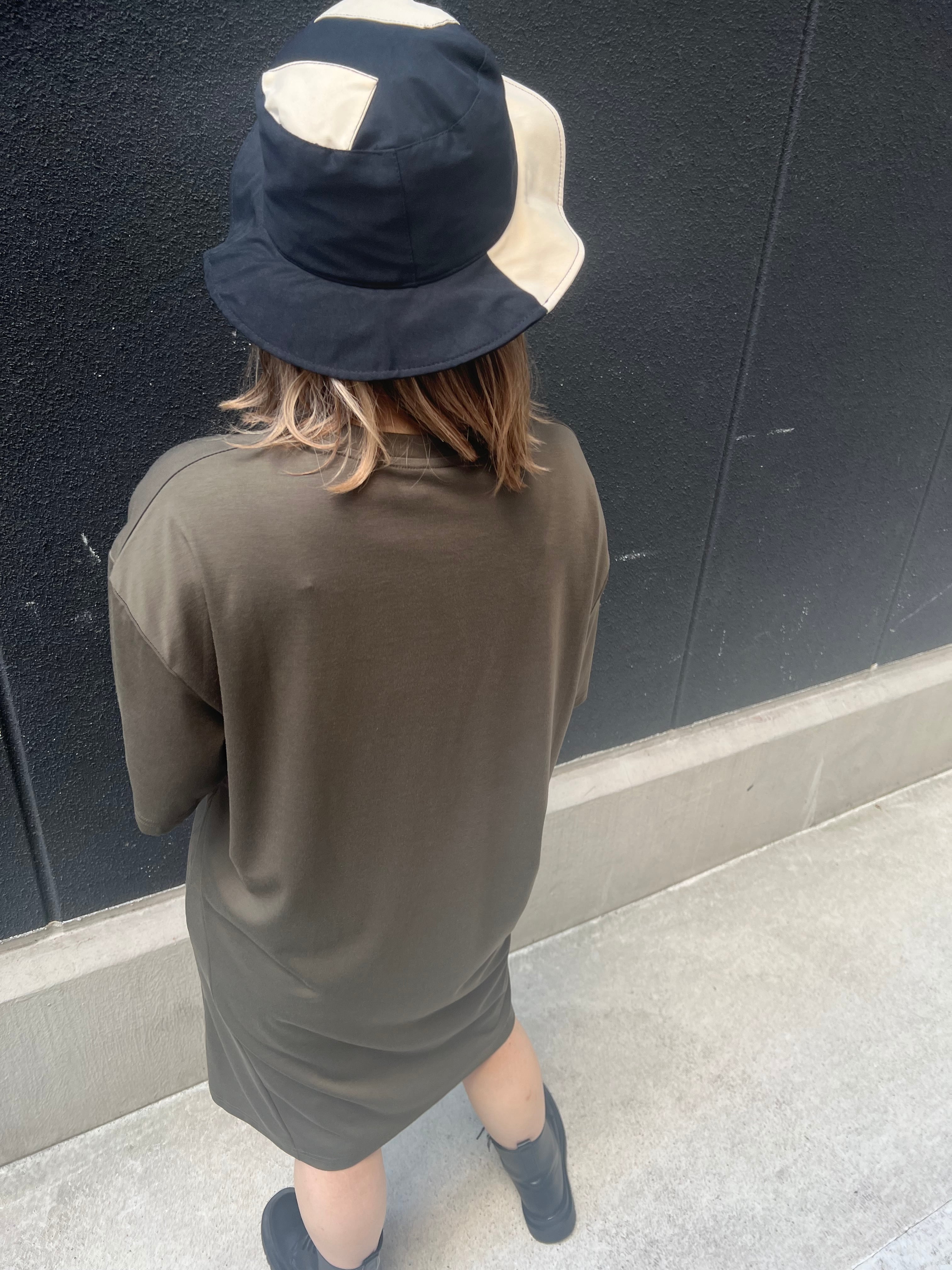 Tシャツとチュニックが一体化したようなTワンピースは、カジュアルなスタイルにぴったり。異素材の組み合わせによる遊び心のあるポケットとジッパーがアクセントになっています。