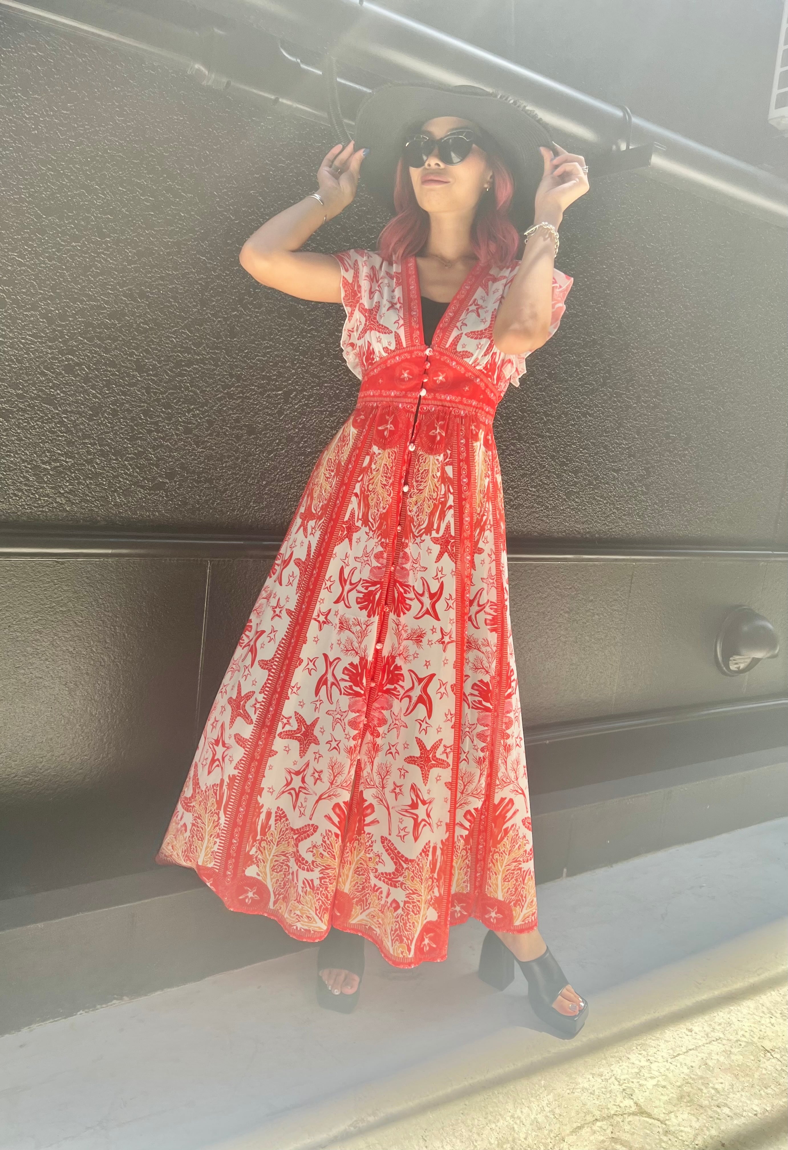 starfish print V-neck frill sleeve long one-piece ワンピース ワンピ ロングワンピ シフォン ヒトデ 海 ビーチ リゾート