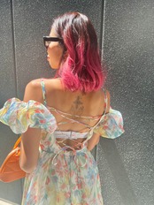 オーガンジー素材は軽やかで透け感があり、夏らしい涼しげなスタイルにピッタリ。