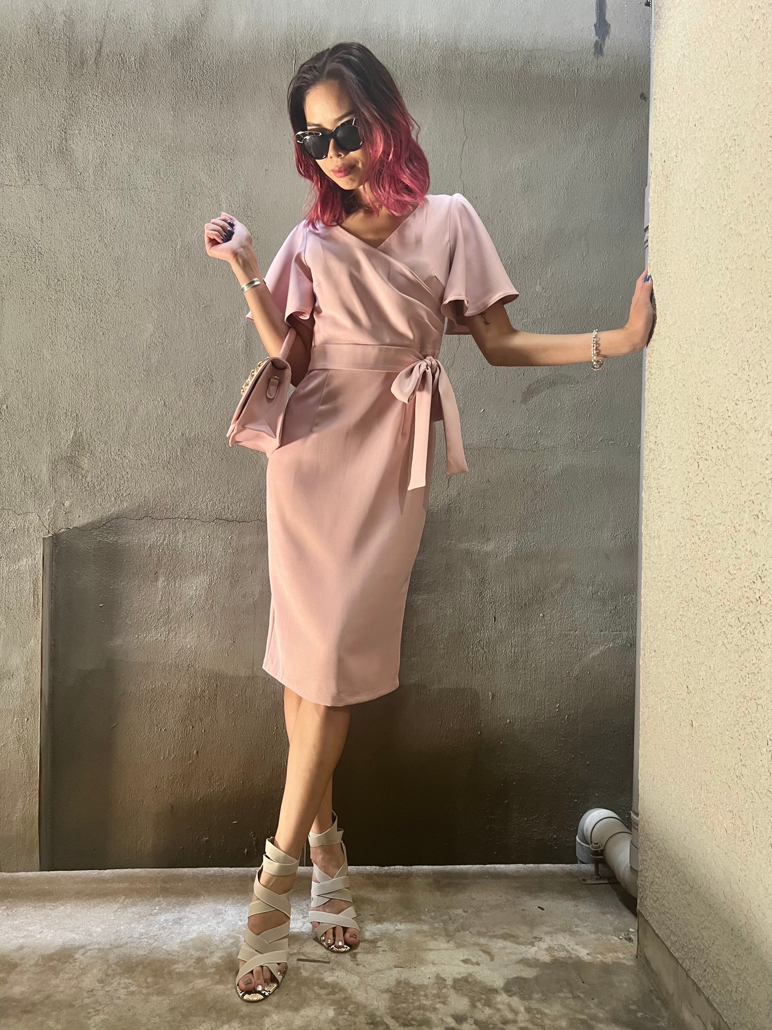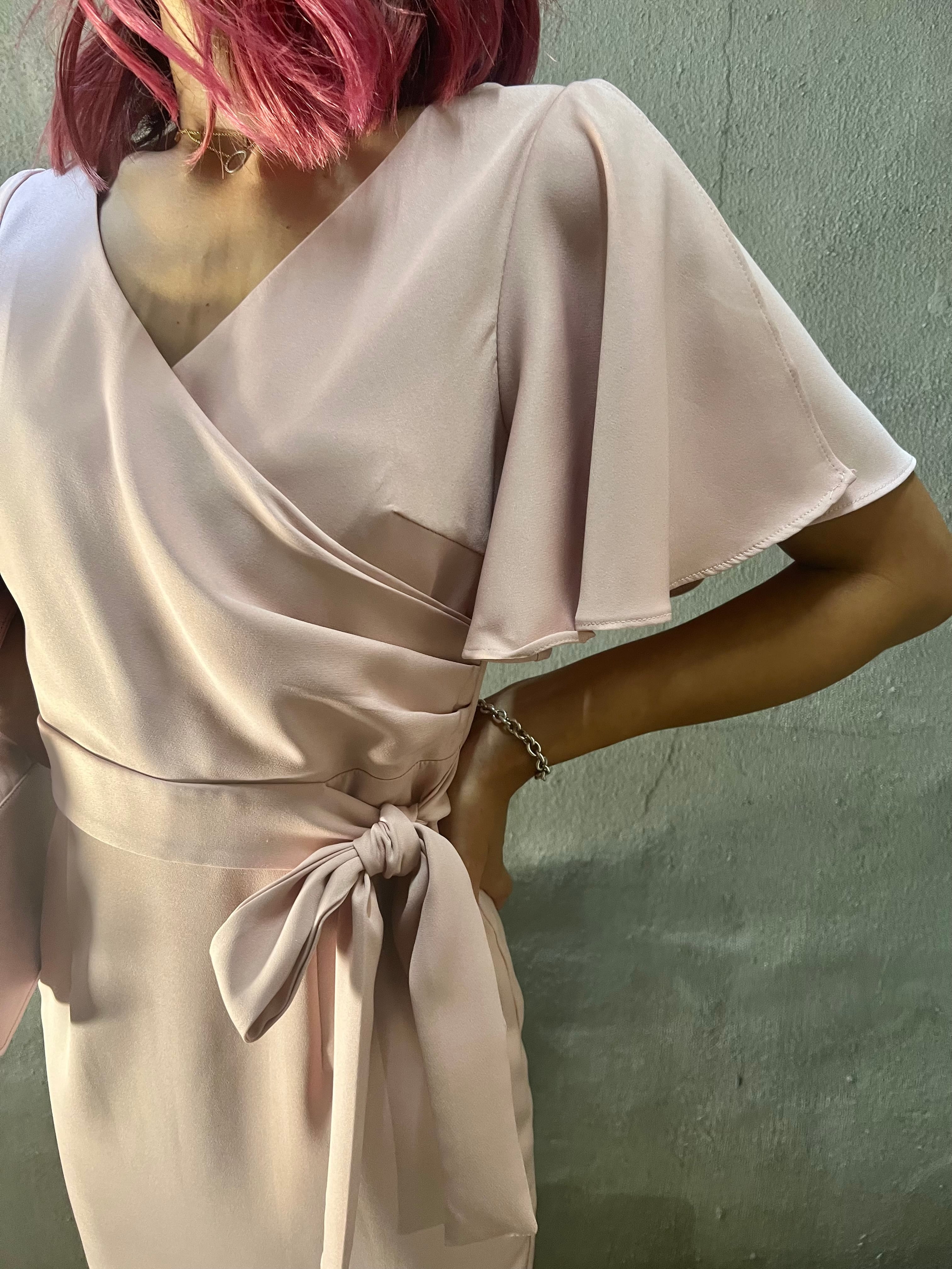 flare sleeve cache-coeur change tight one-piece ワンピース ワンピ ドレス 結婚式 二次会 パーティー ピンク フレアスリーブ カシュクール