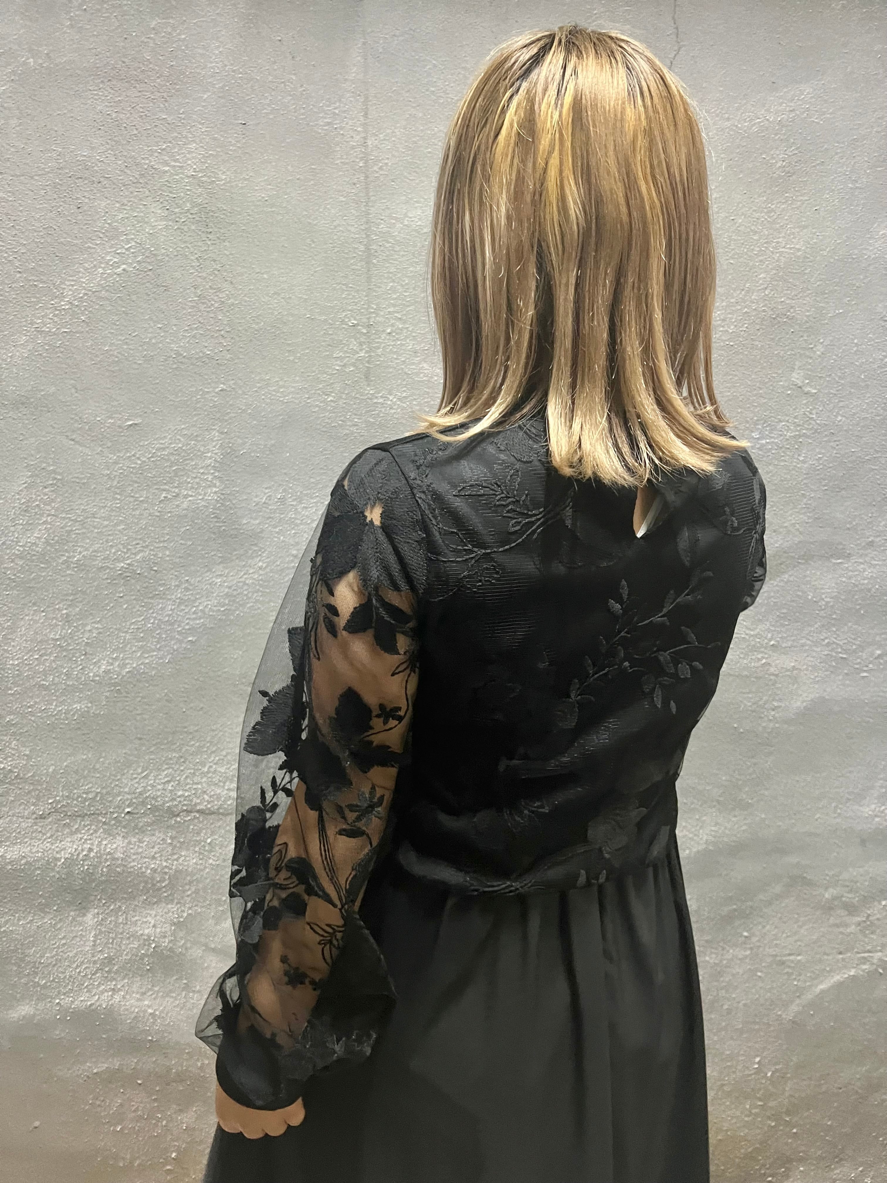 透け感のあるレース素材が、優雅で上品な印象を演出します。