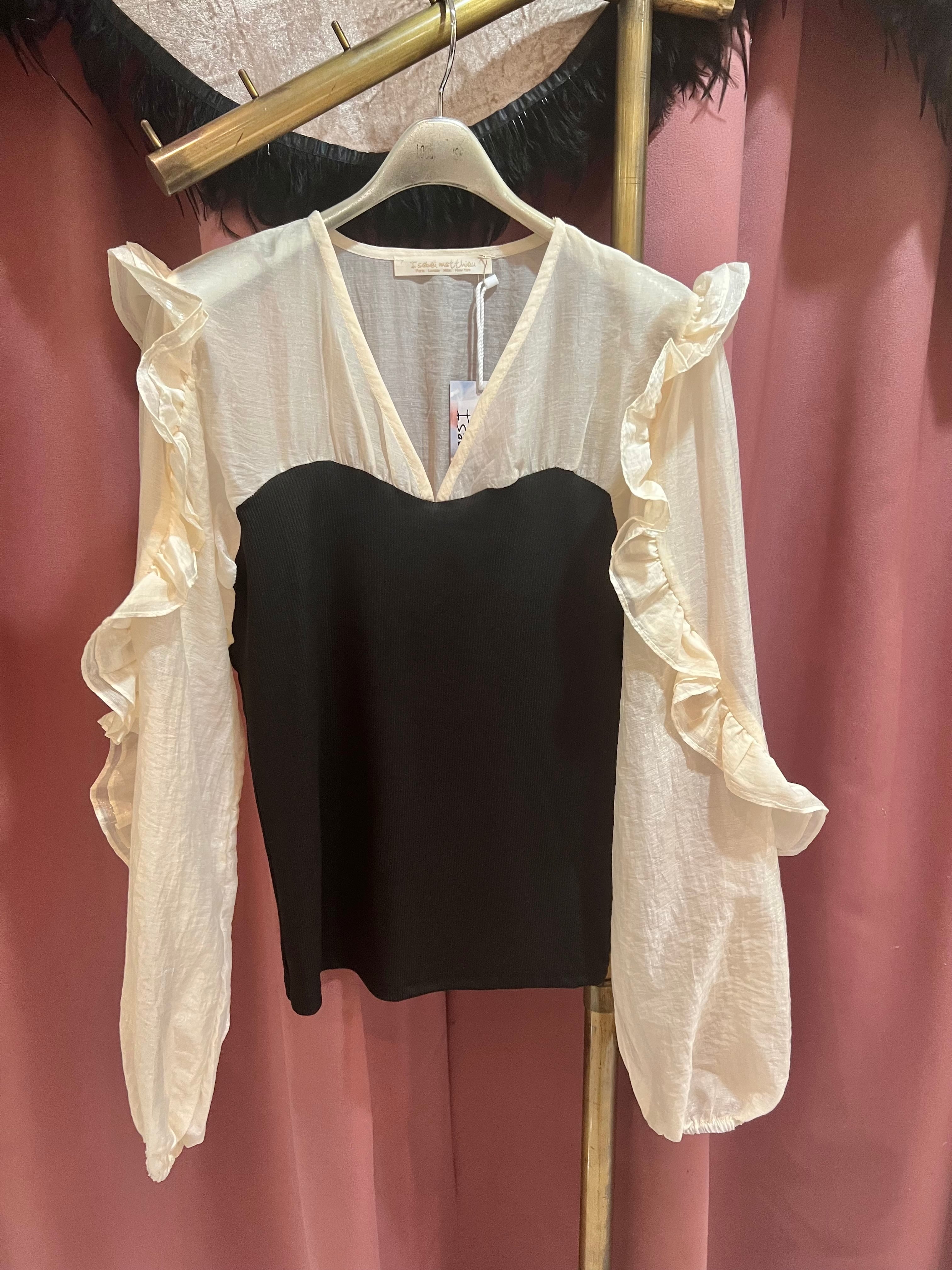 chiffon frill different fabrics docking tops トップス デザイントップス シフォン バイカラー フリル きれいめ
