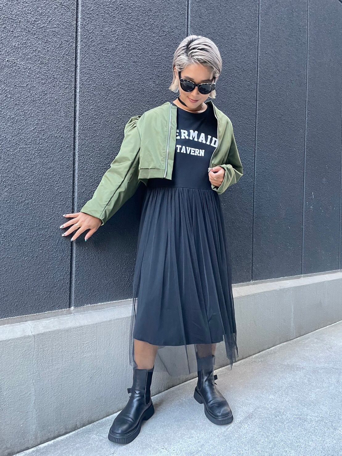 チュールカバーデザインがオシャレなアクセントになり、大人カジュアルなスタイリングを演出します。白黒のバイカラープリントが、シンプルながらも個性的な雰囲気を醸し出します。膝下までのロング丈なので、リラックス感ある着心地でありながらも女性らしいシルエットにも見せてくれます。