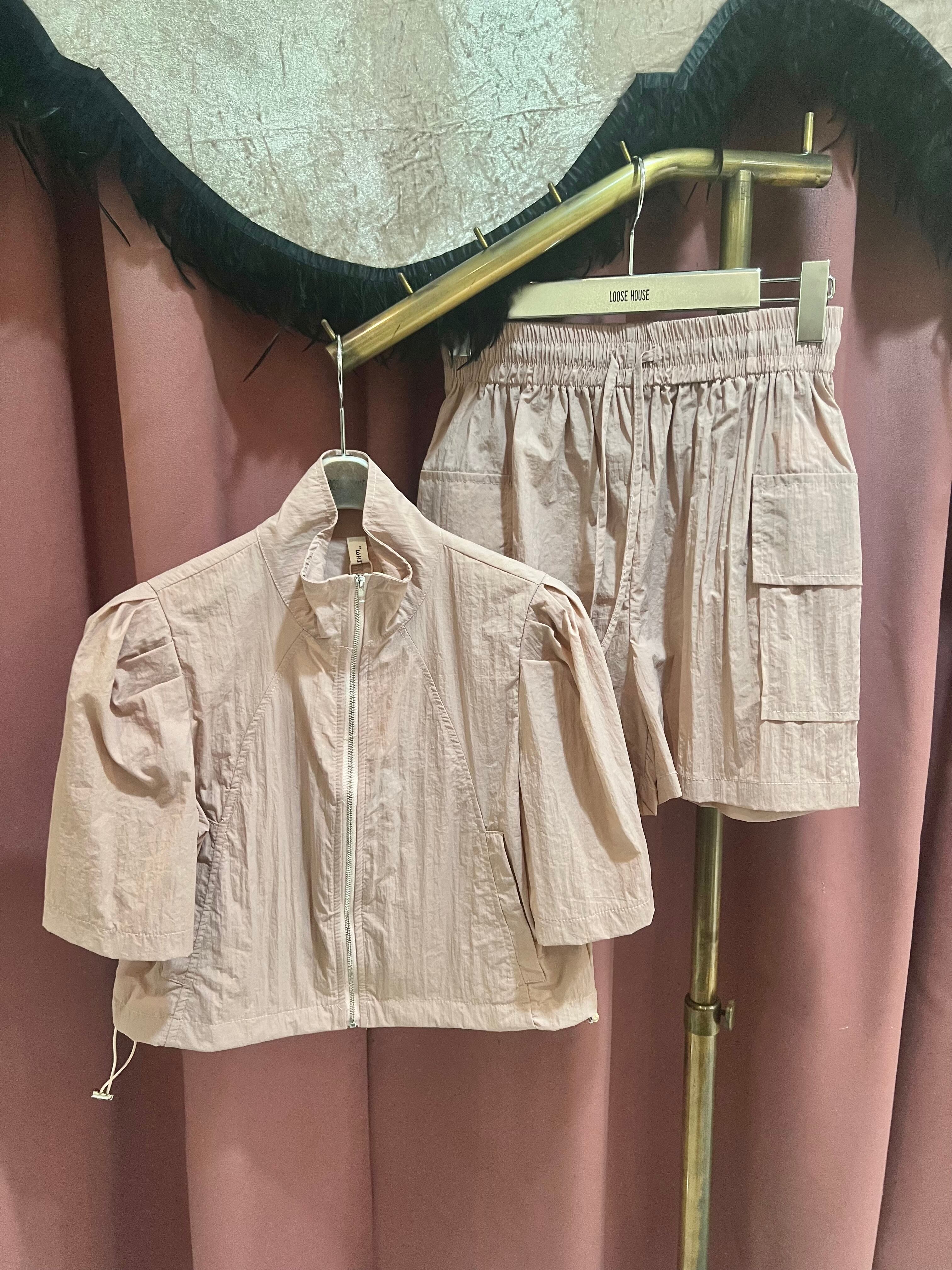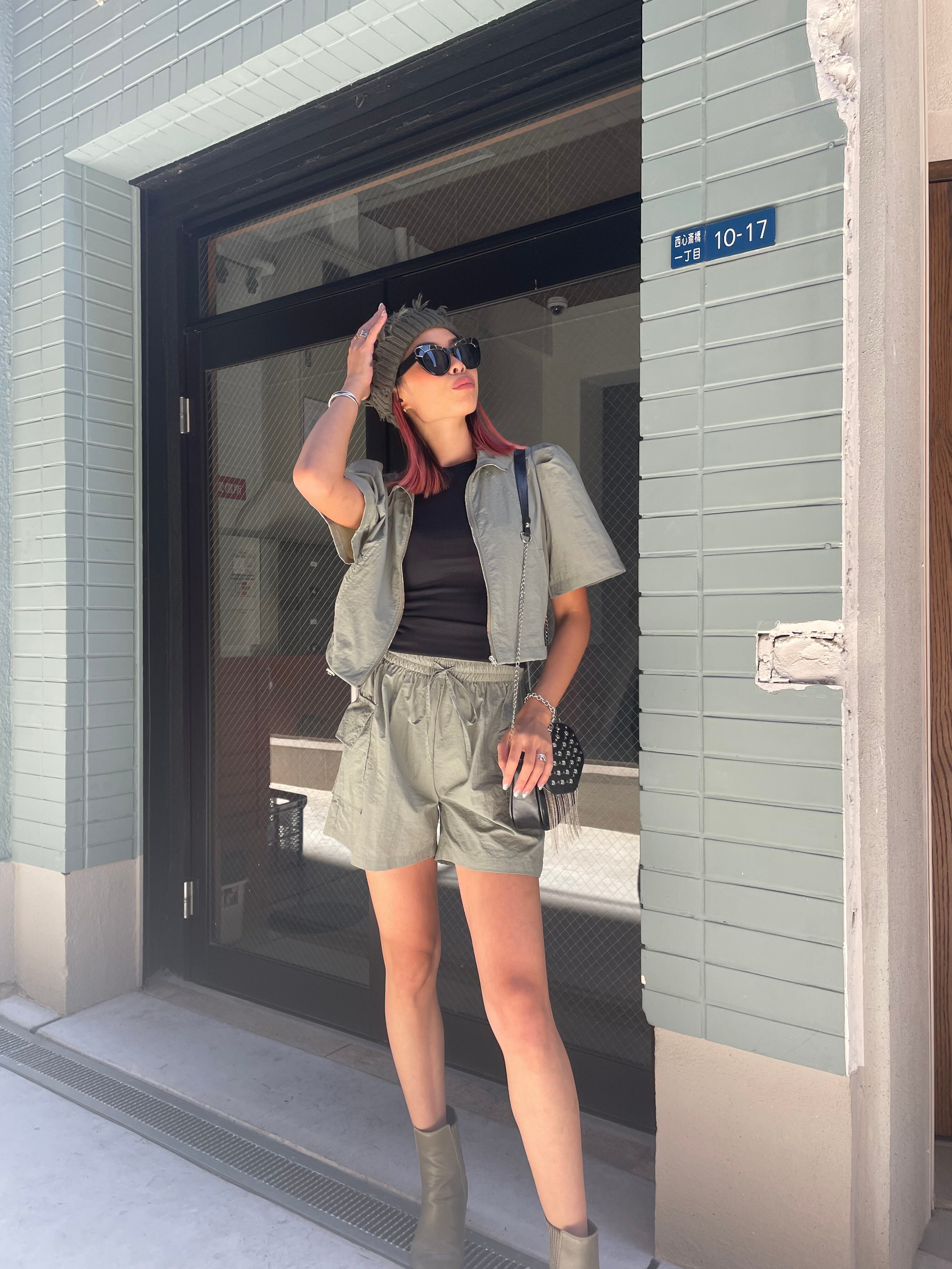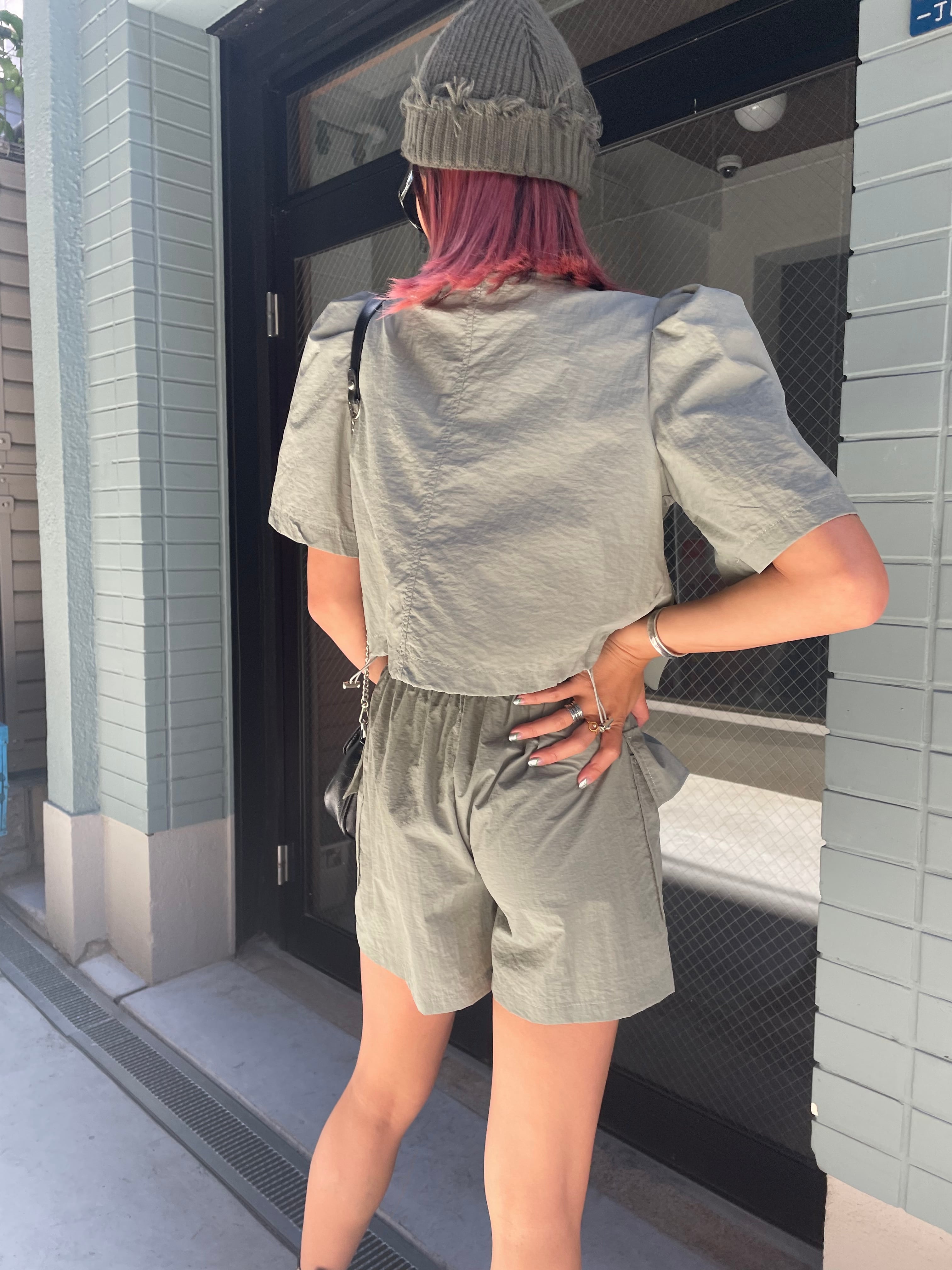 シャカシャカ素材のブルゾンとショートパンツがセットになっており、スポーツやアウトドア、カジュアルなシーンにぴったりのスタイリングが楽しめます。