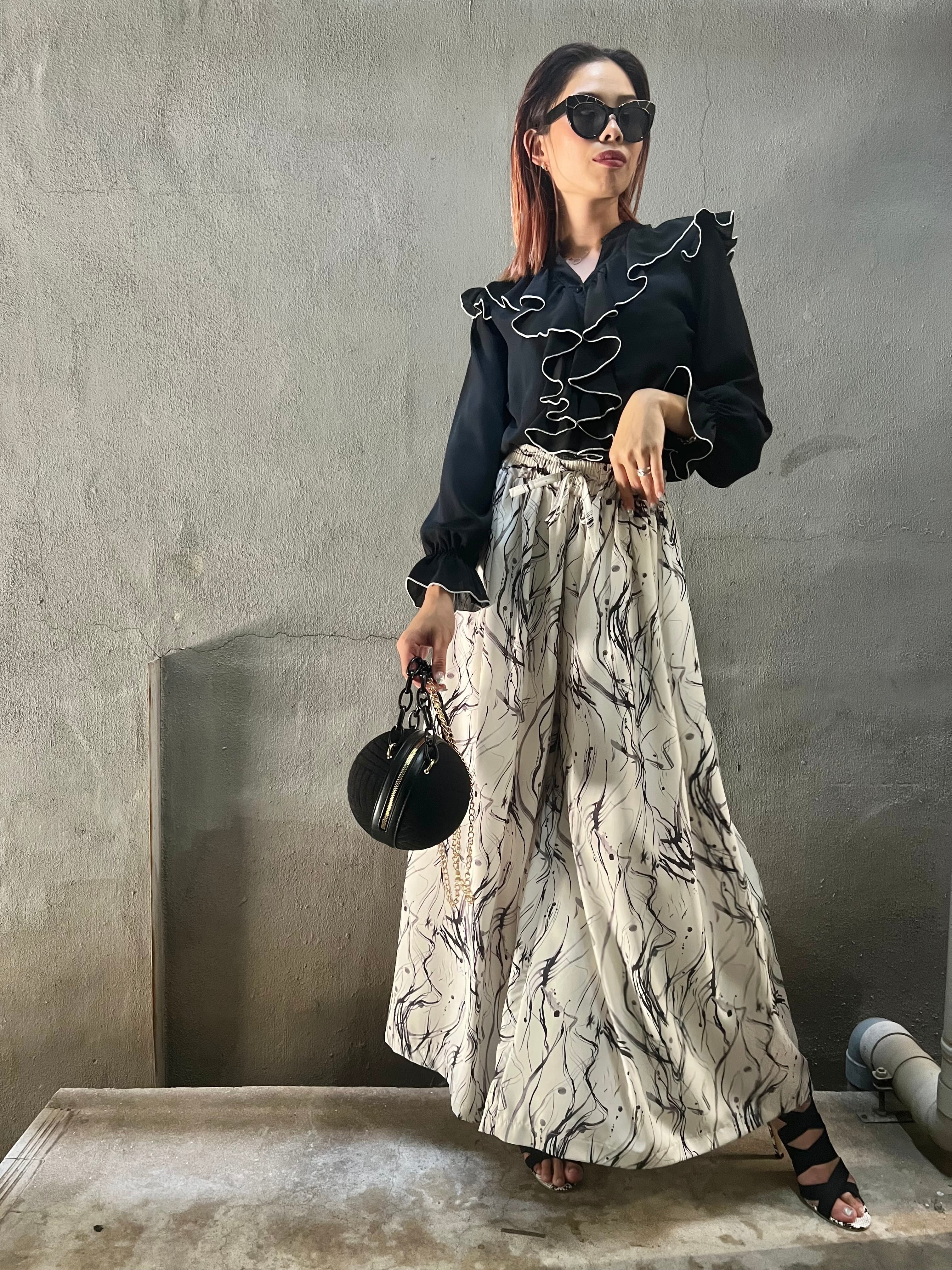 bi-color print wide flare long pants パンツ バイカラー 柄パンツ ロング丈 ワイドパンツ ゴムウエスト