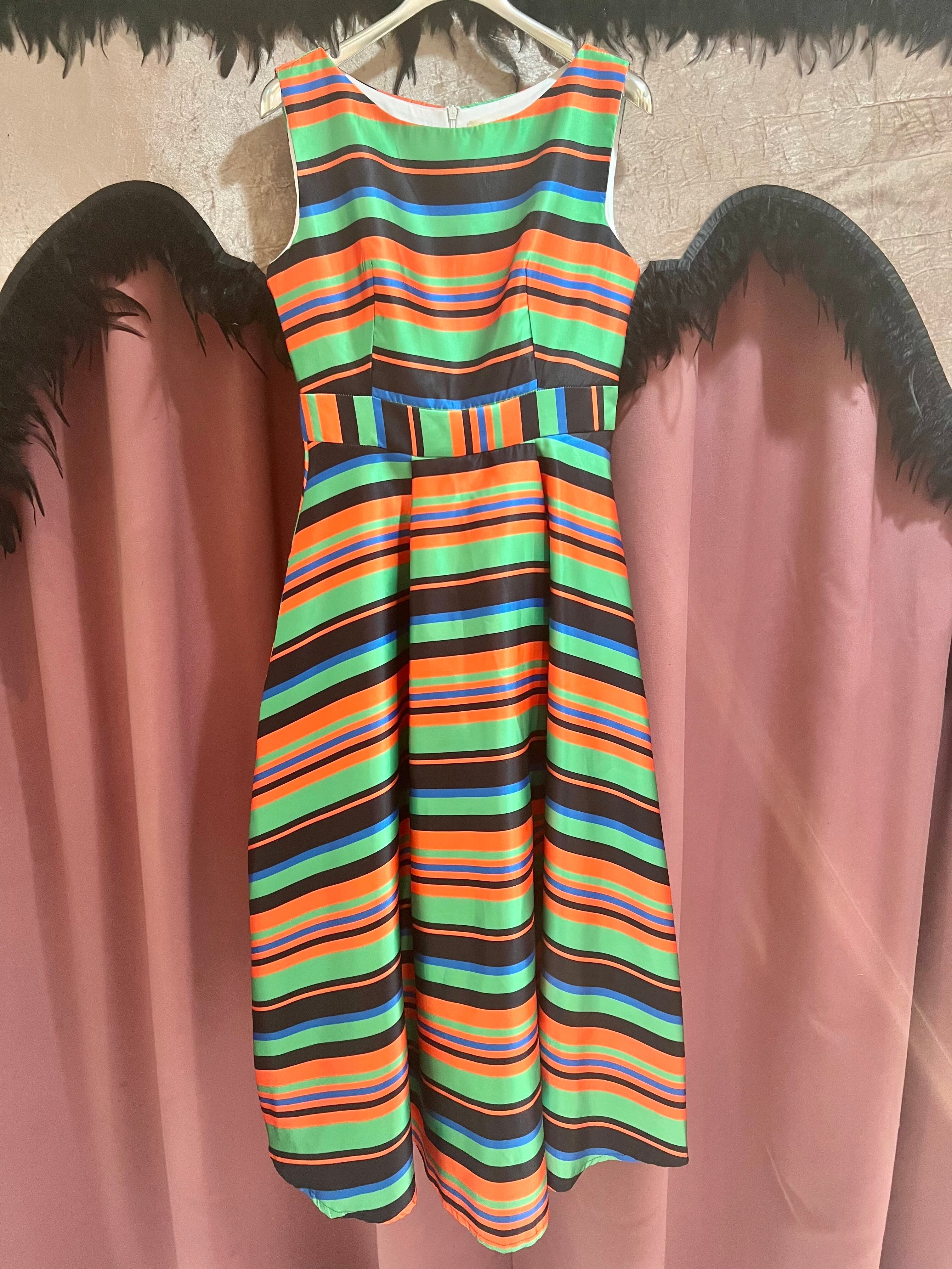 カラフルなボーダーデザインが目を引くフィット&フレアシルエットのワンピースです。