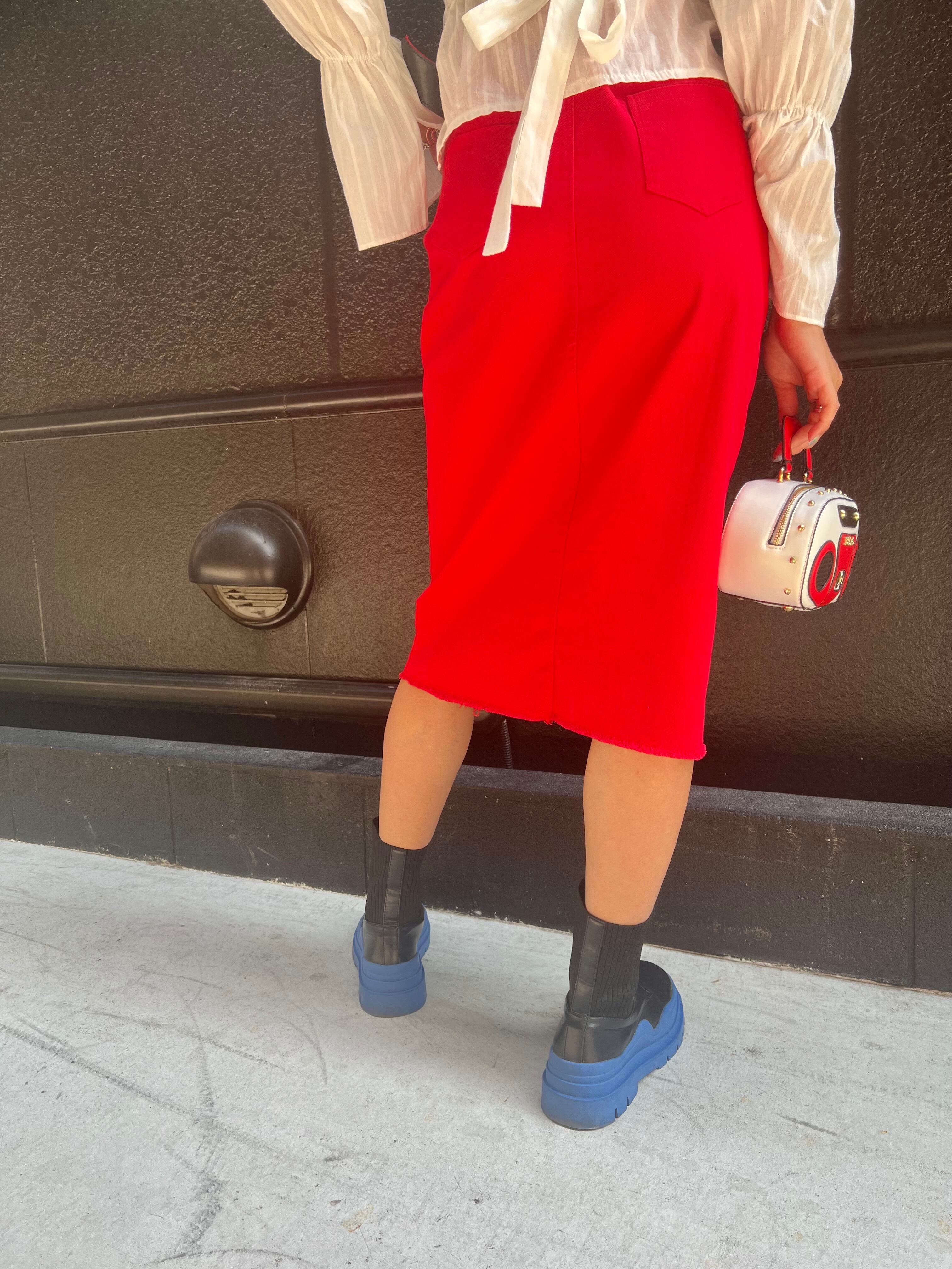red denim stretch tight skirt スカート タイトスカート デニム ストレッチ 細身 ベルト付