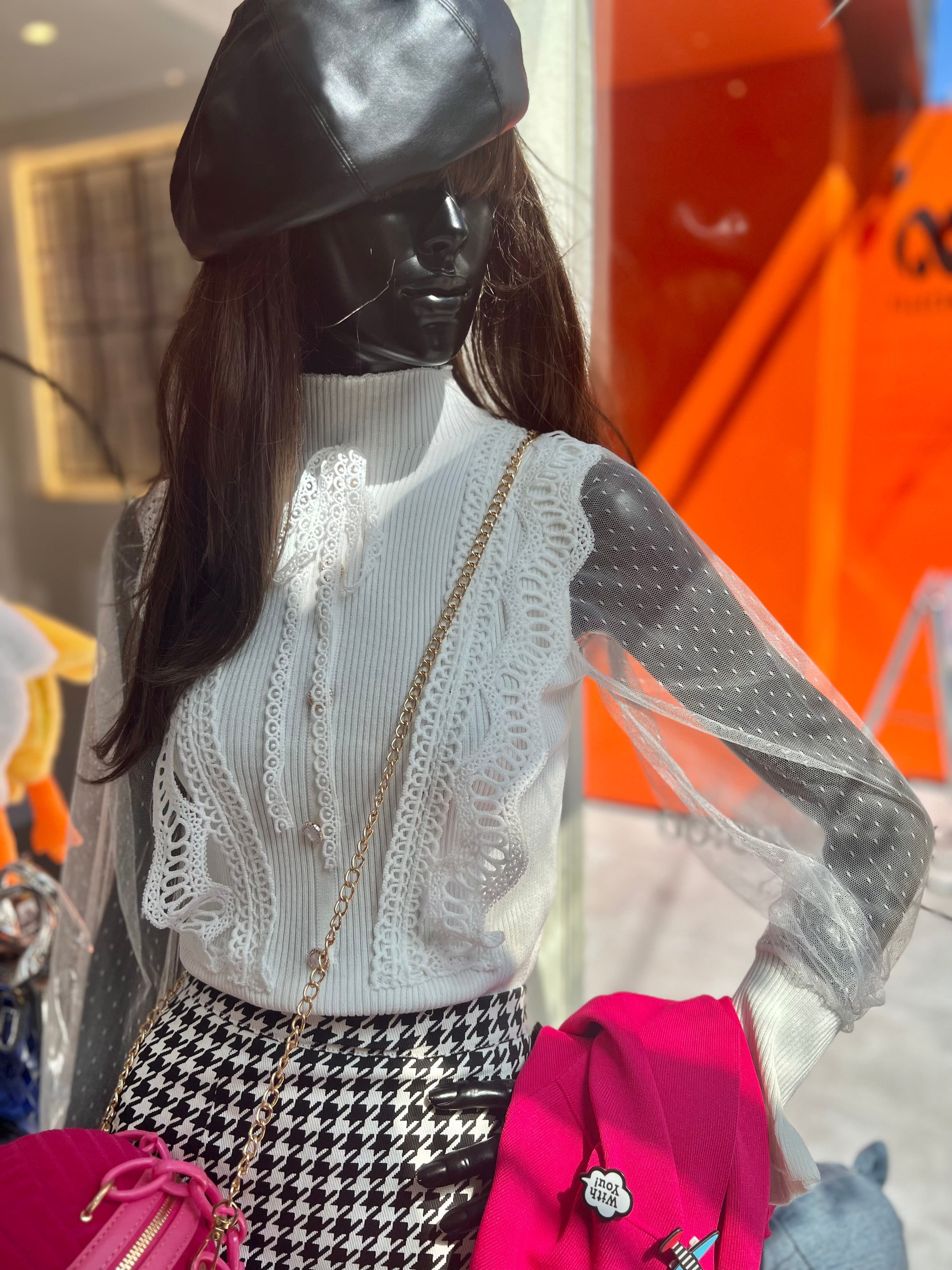 rib knit sheer sleeve lace tops トップス リブ ニット シアー きれいめ 可愛い