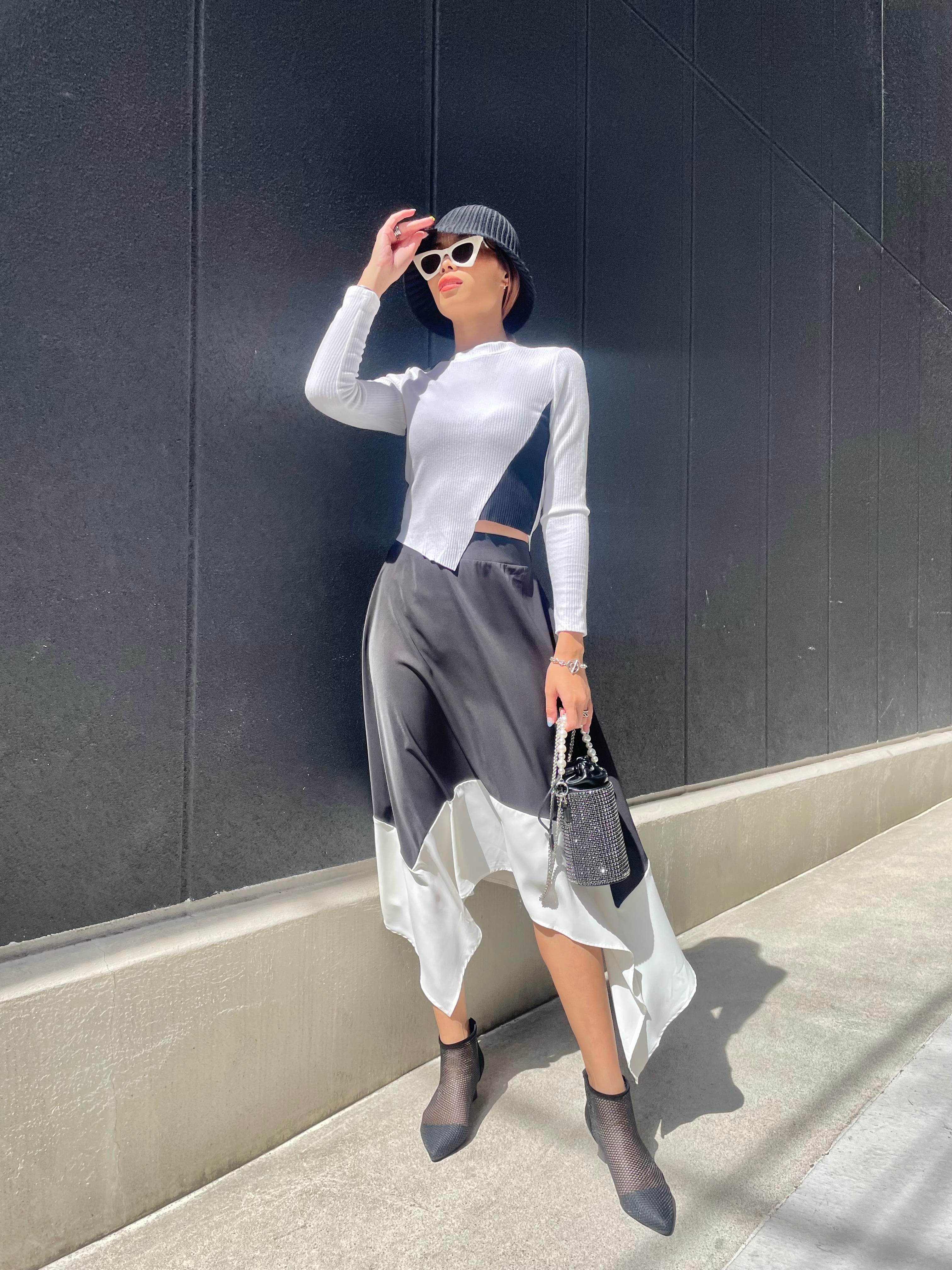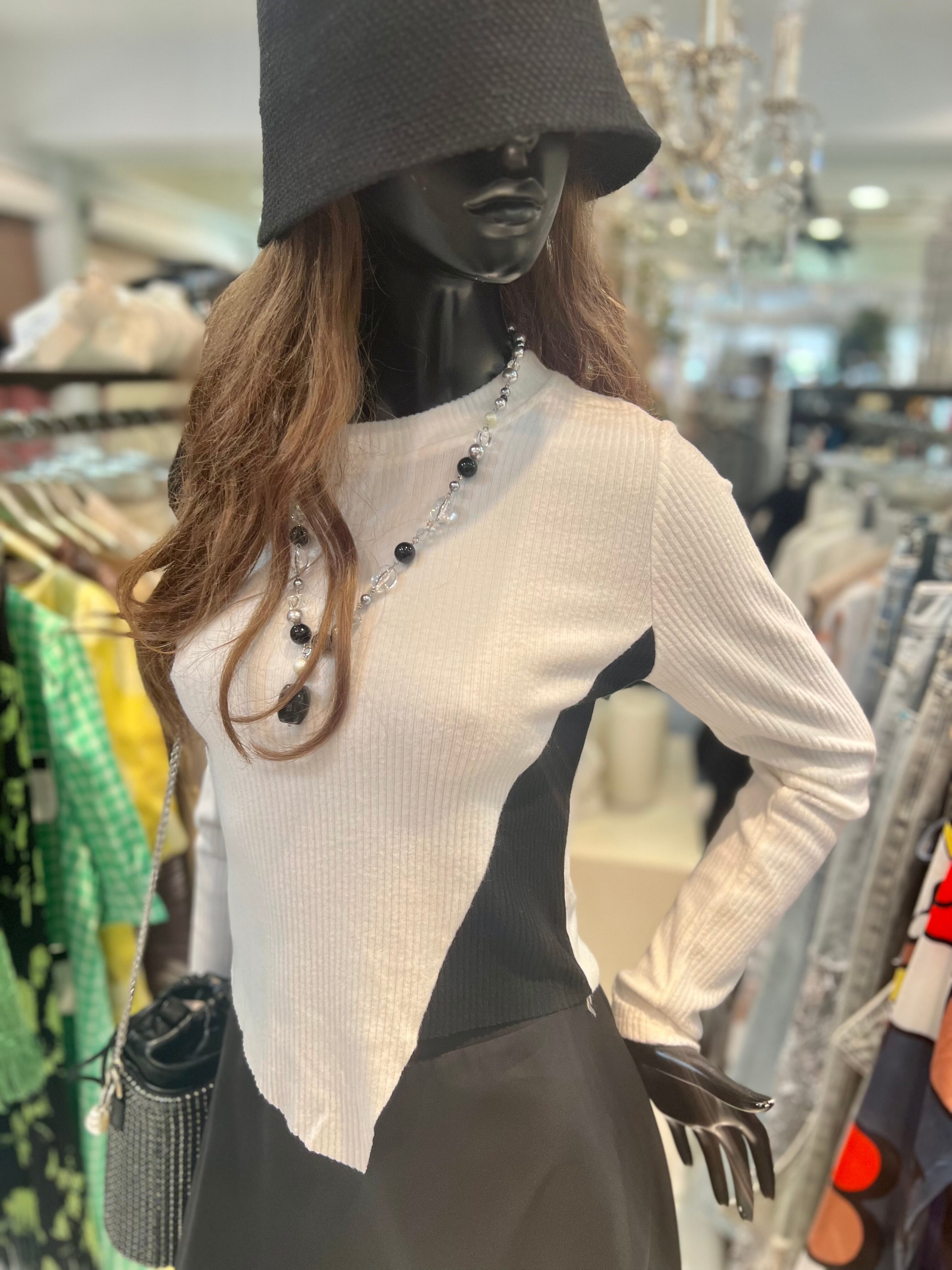 bi-color change asymmetry rib knit tops トップス ニット リブニット バイカラー 白黒 アシンメトリー タイトシルエット