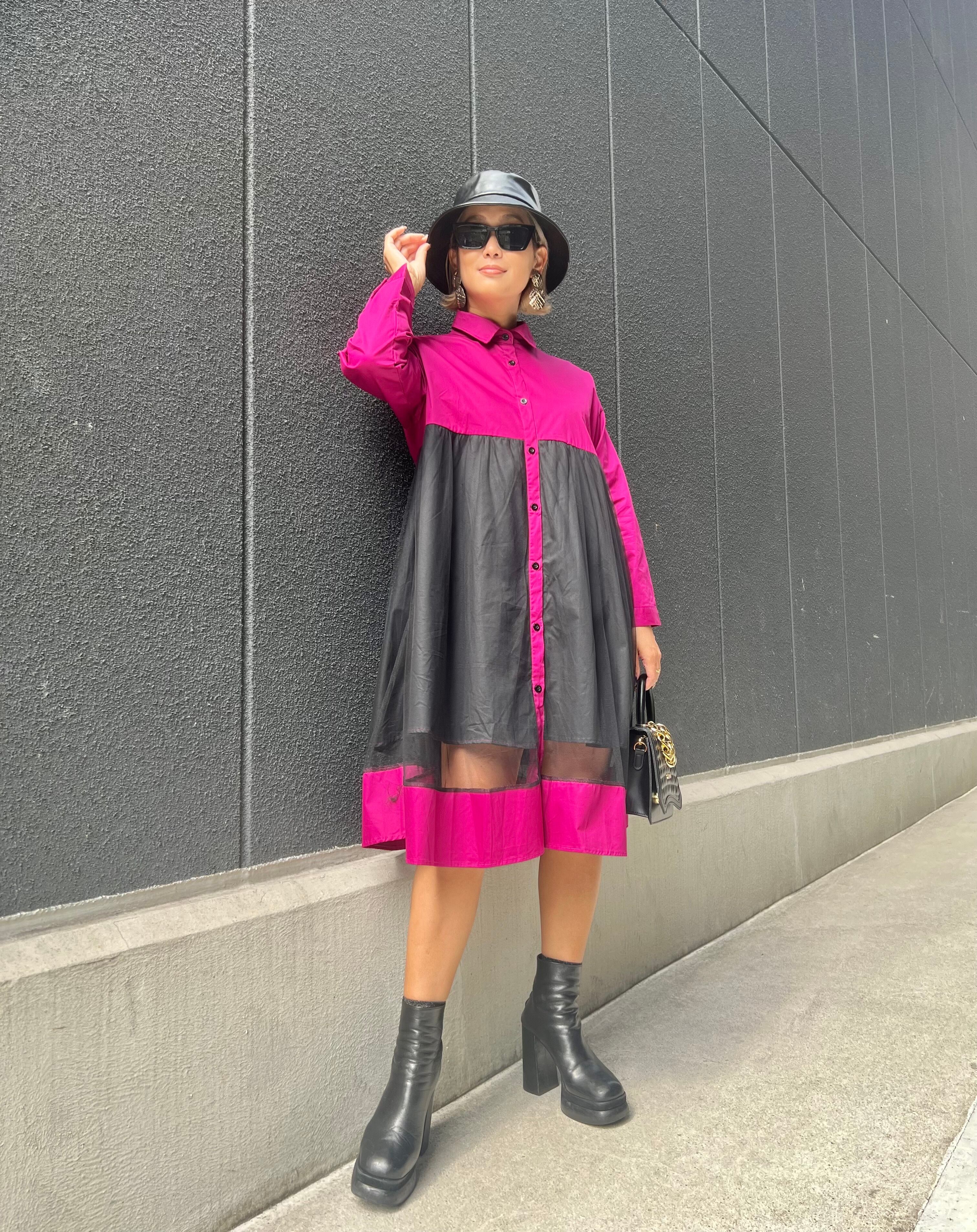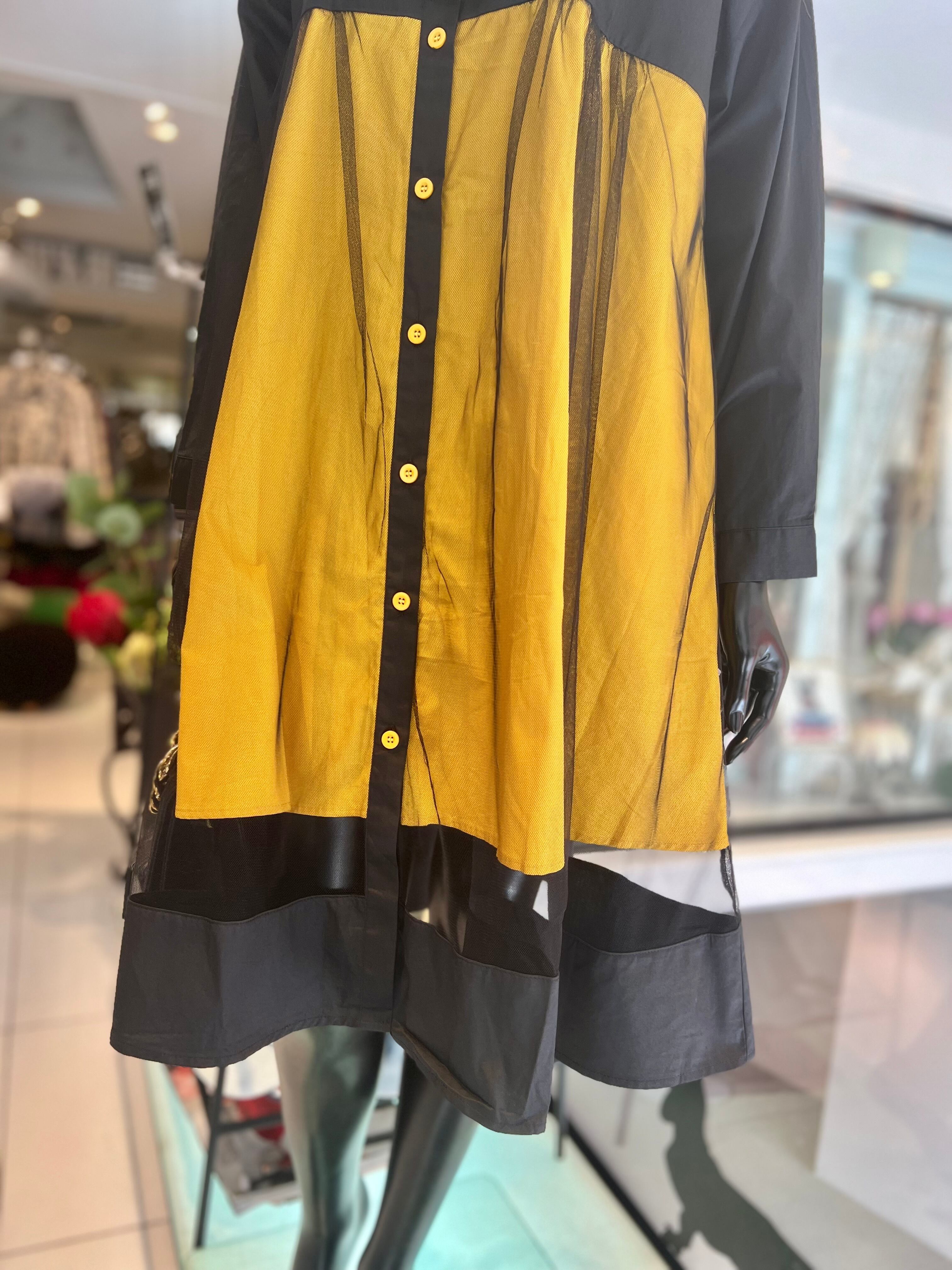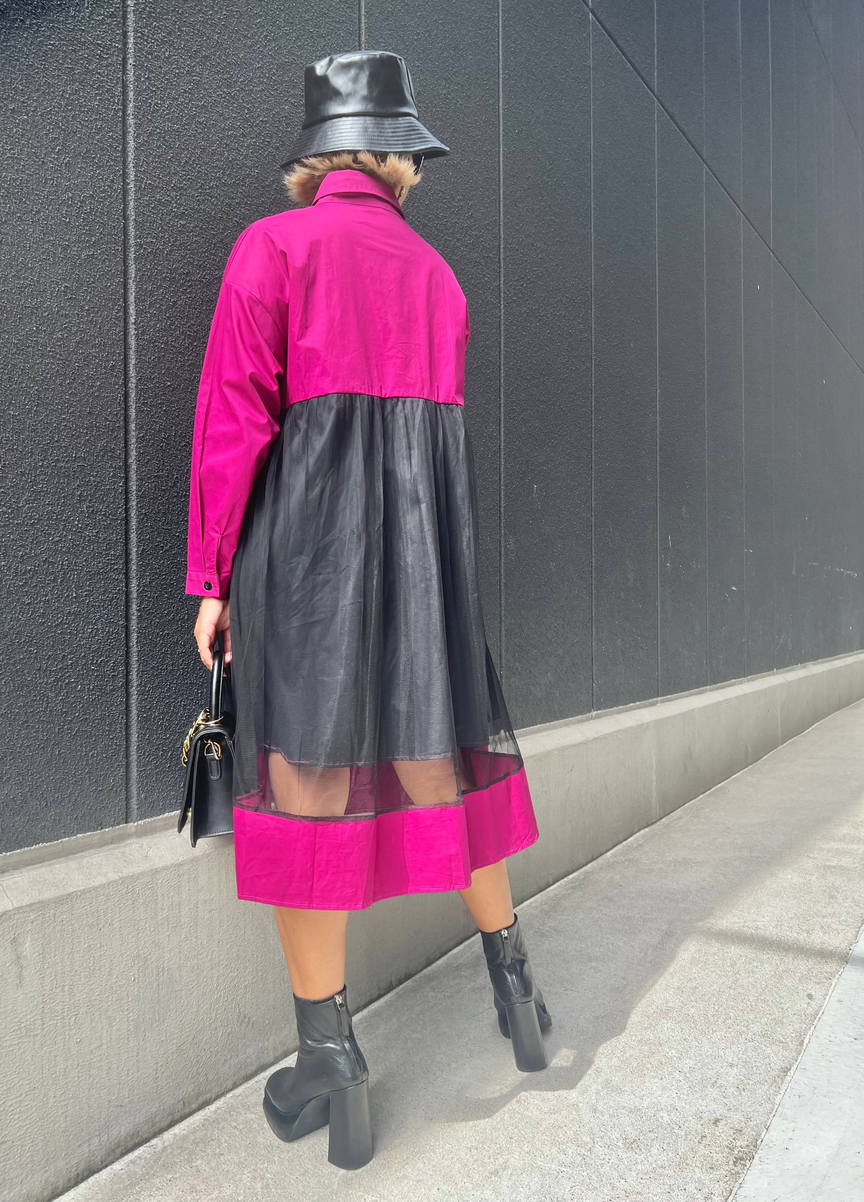シャツのデザインにチュール素材が重なった、個性的なワンピース。