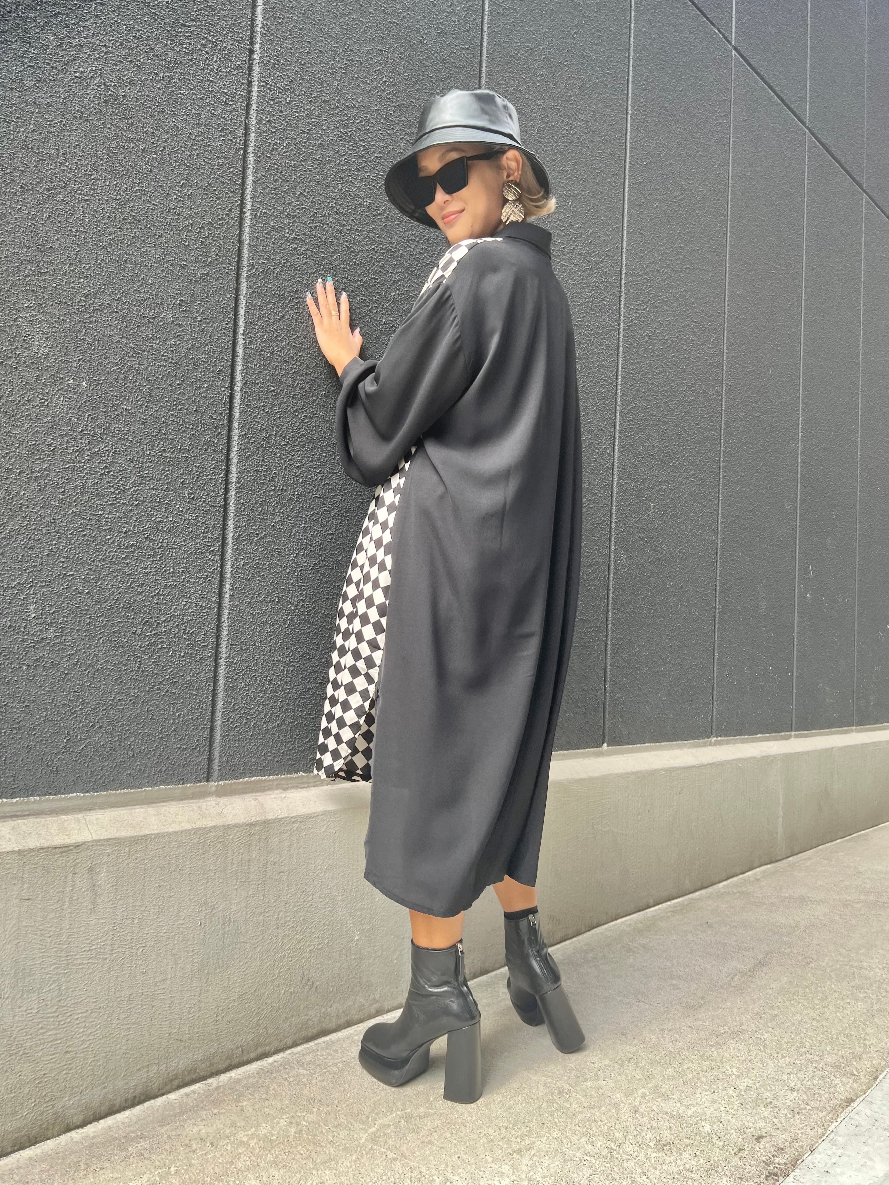 チェッカーフラッグをモチーフにしたアシンメトリーなデザインが特徴のシャツワンピースです。