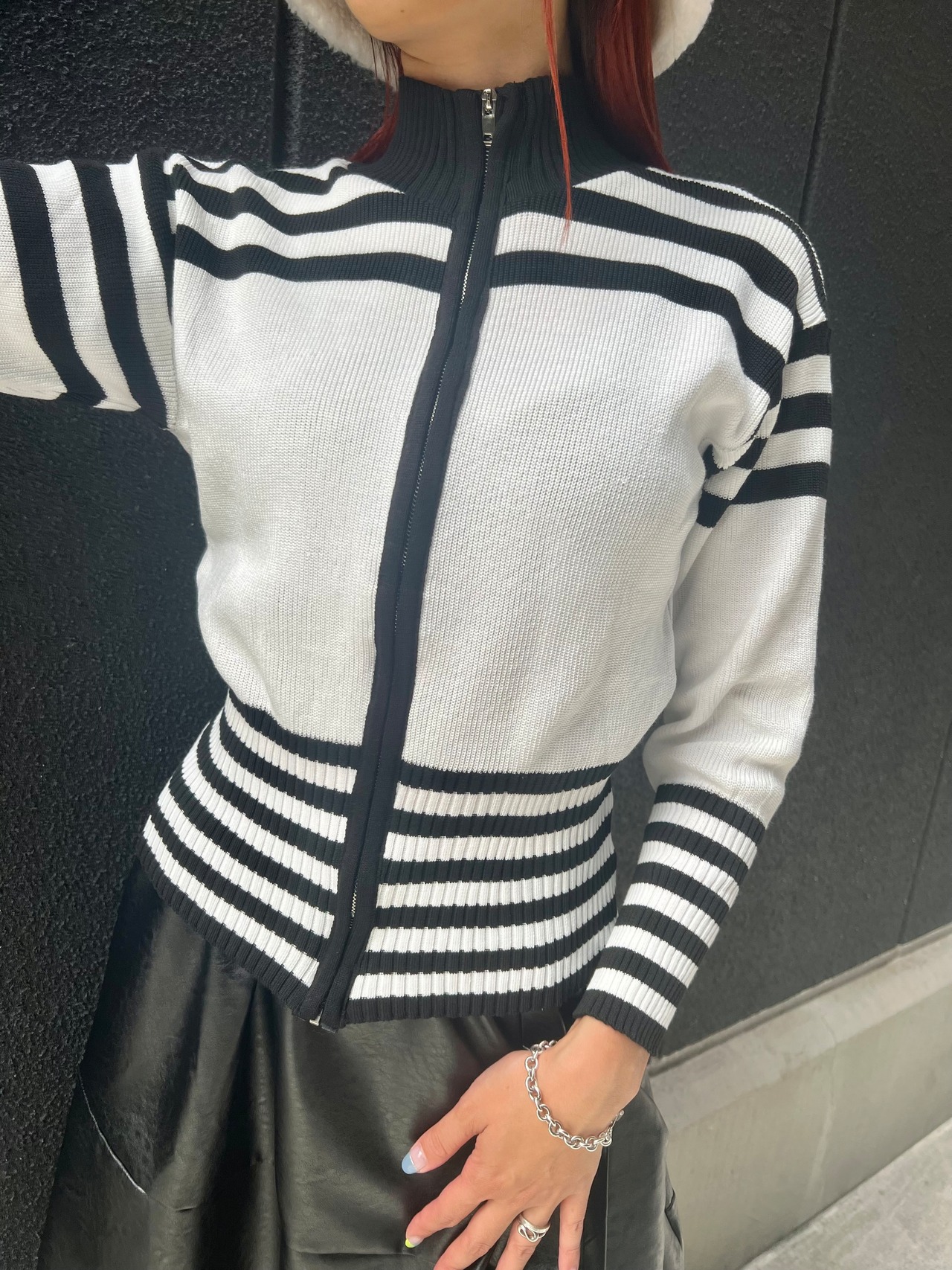 bi-color border knit tops トップス ニット ジャケット ジッパー ボーダー 白黒 バイカラー