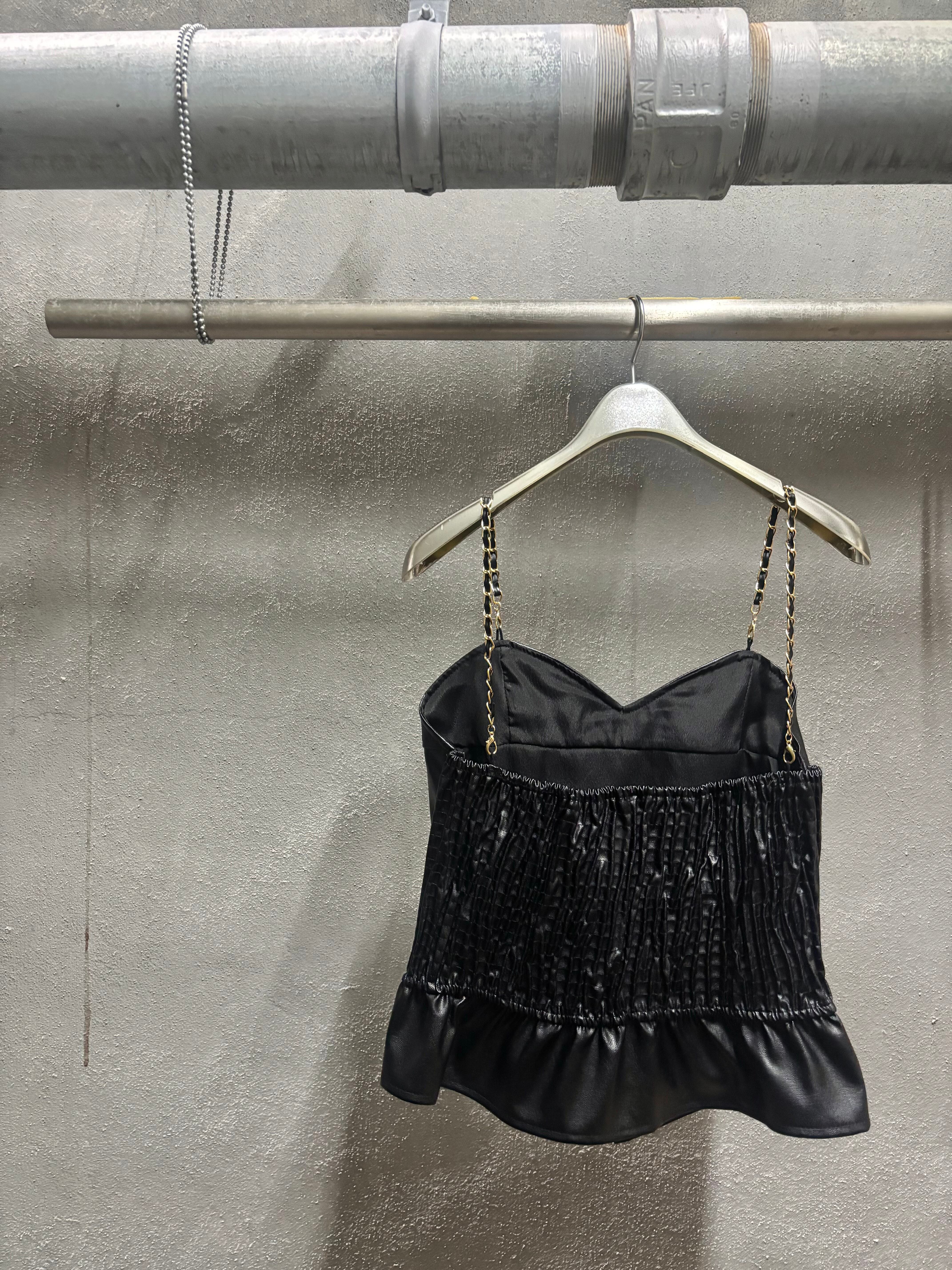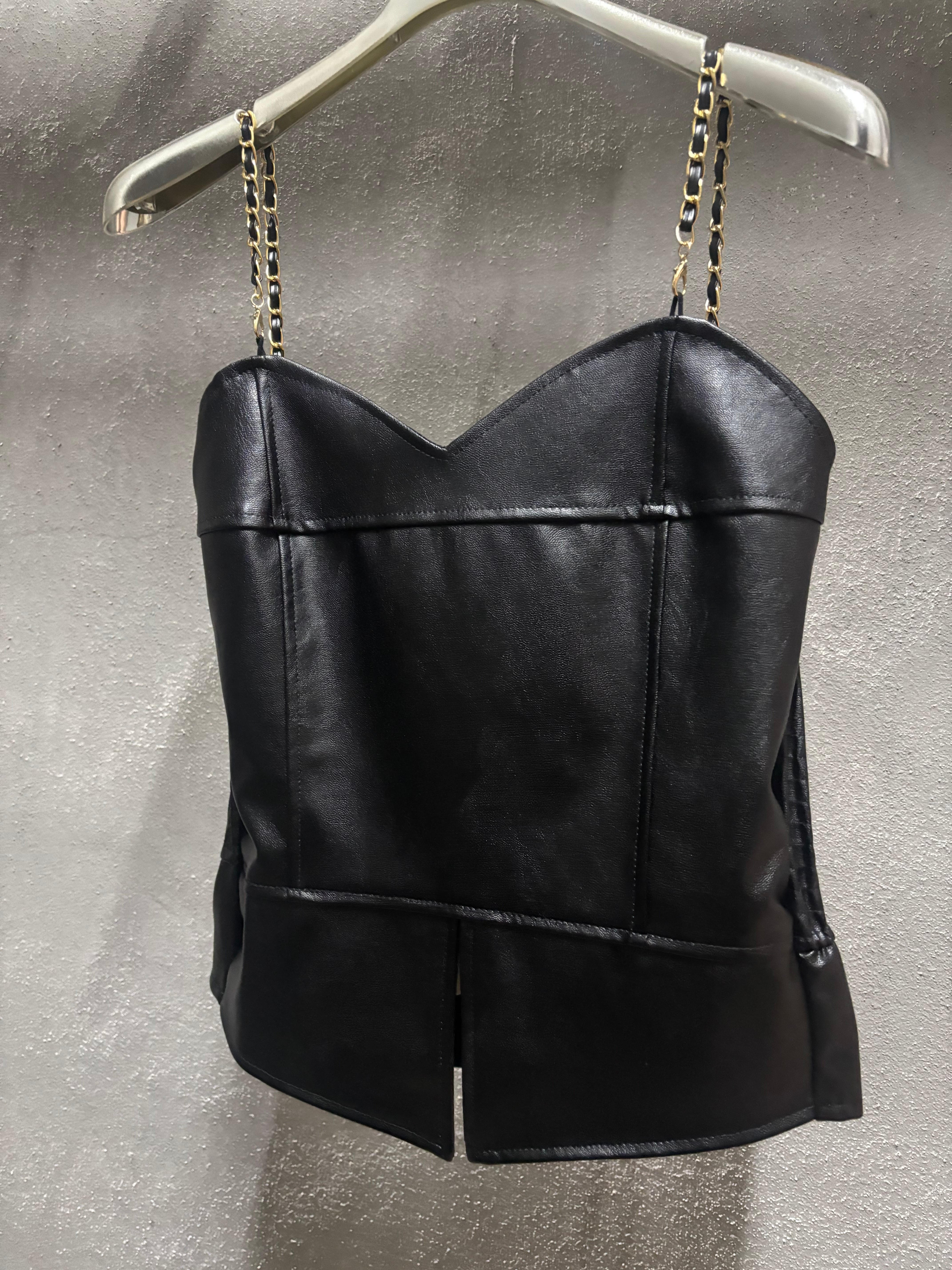エコレザー素材のキャミソールで、高級感漂うGOLDチェーンのストラップがポイントのトップスです♡