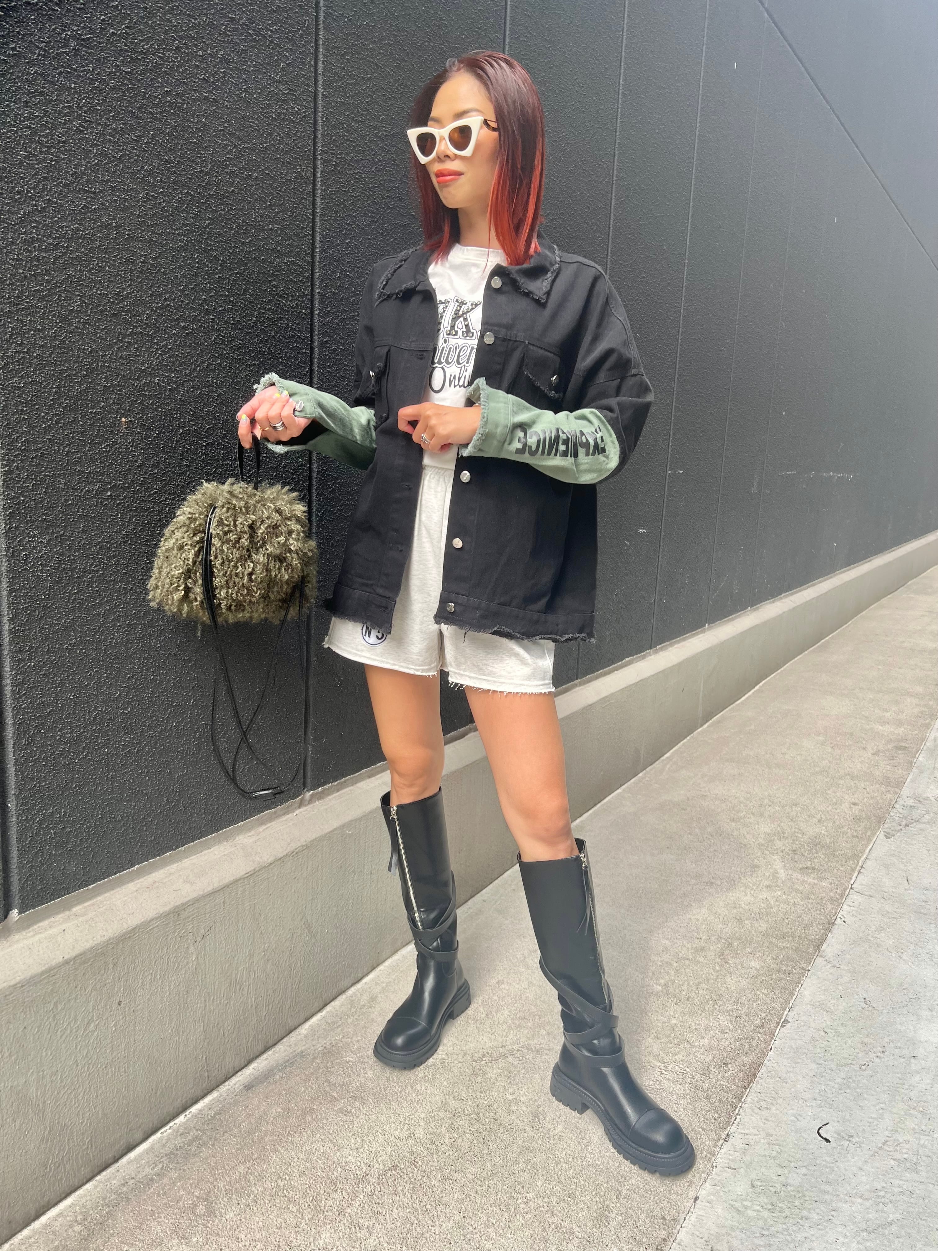 メンズライクな着こなしにぴったりなオーバーサイズのブラックデニムジャケット。