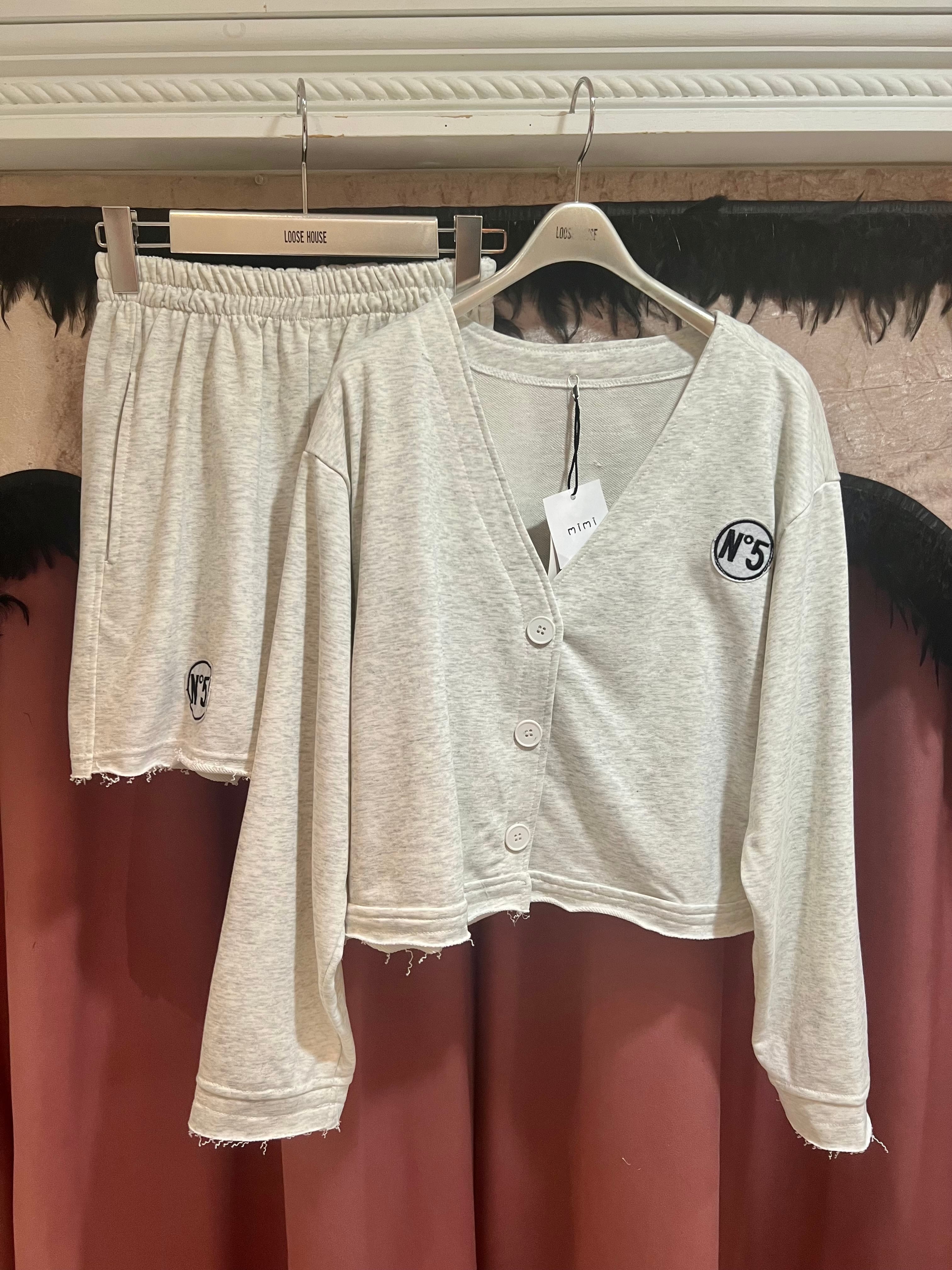 Vネックのカーディガンとショートパンツの2点セットで、ラフなスタイルを楽しめます。