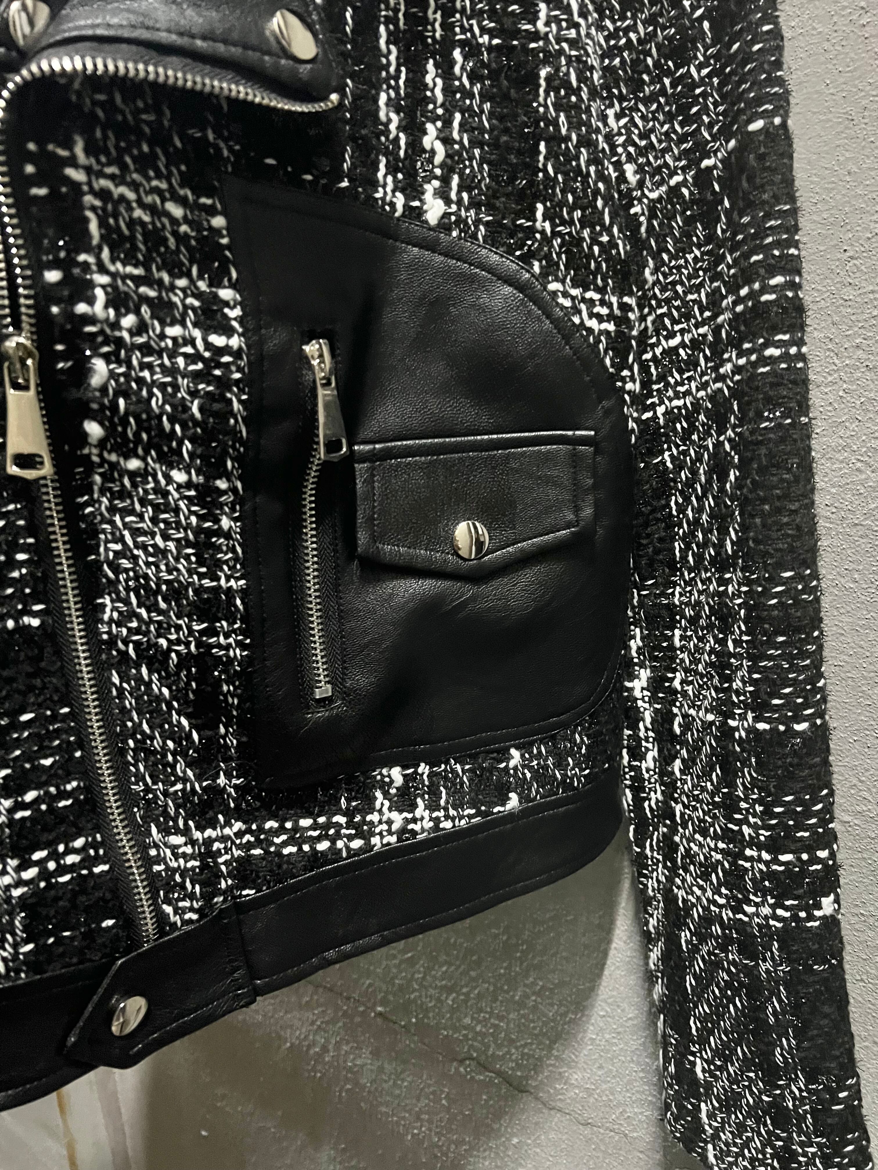 オシャレなデザインが魅力のチェックツィード×エコレザーライダースジャケット。