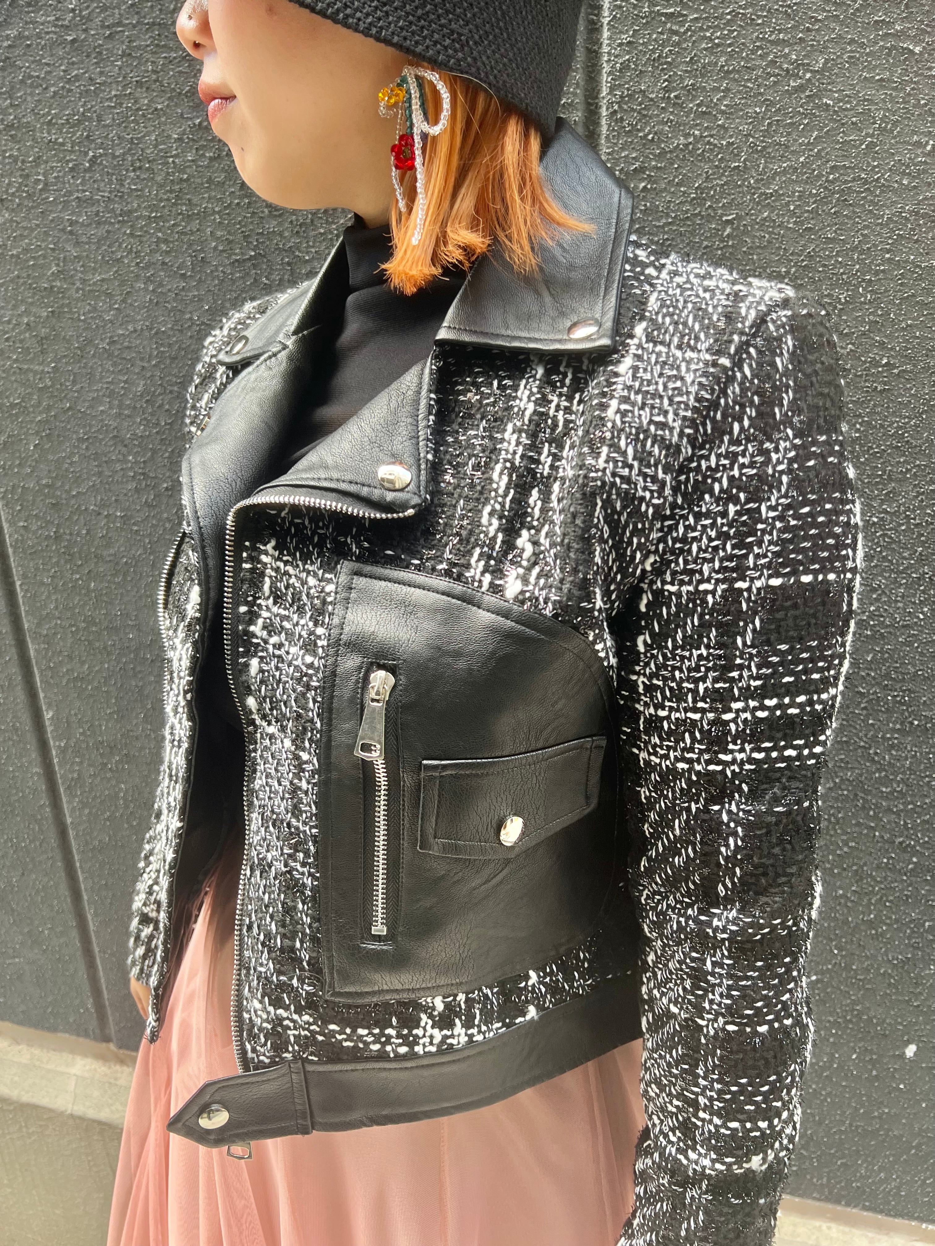 check tweed × eco leather riders jacket ジャケット ライダース 合皮 エコレザー ツィード