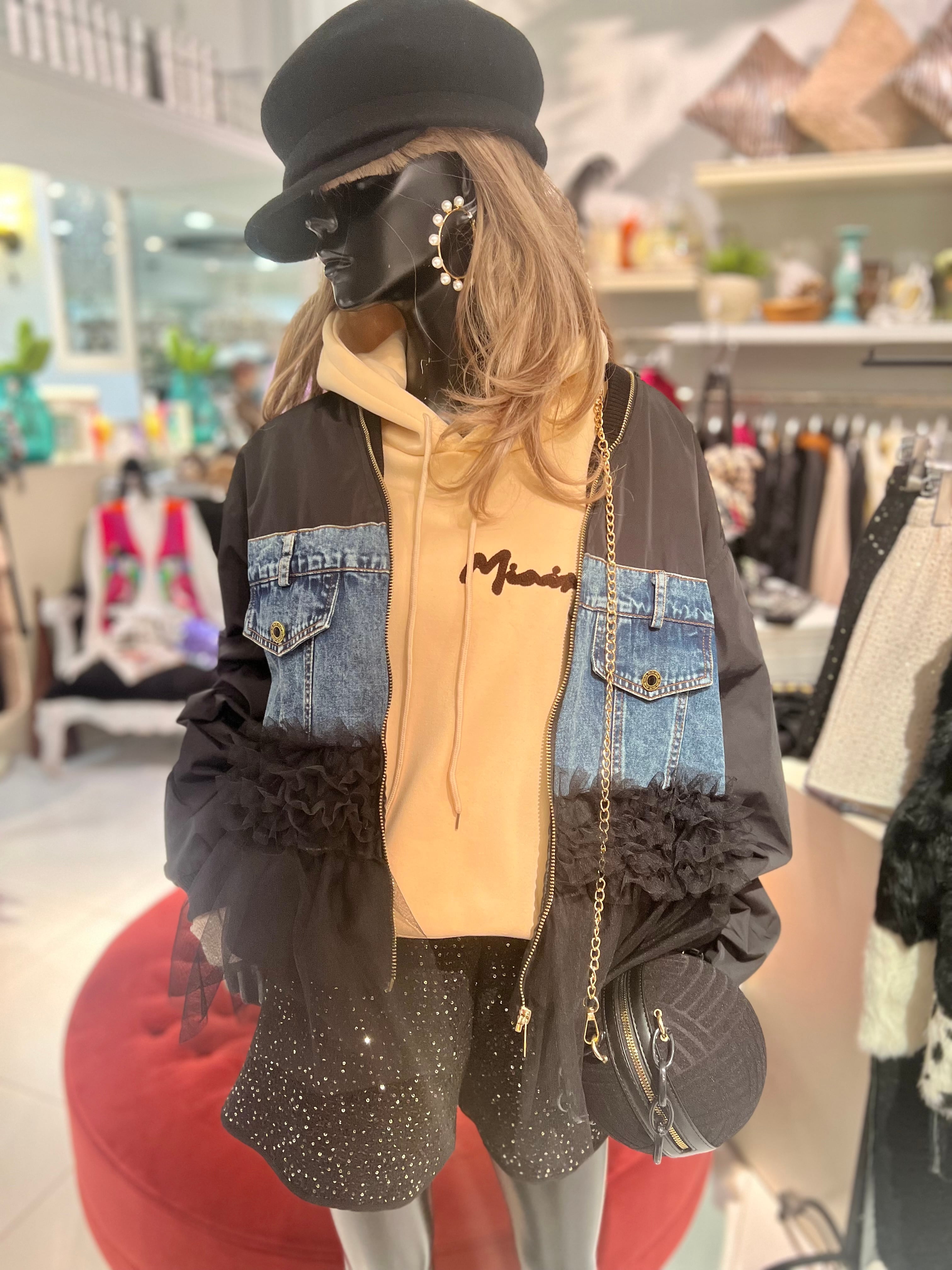デニムとチュールが絶妙に融合したこの一枚は、他のジャケットとは違う存在感を放ちます。