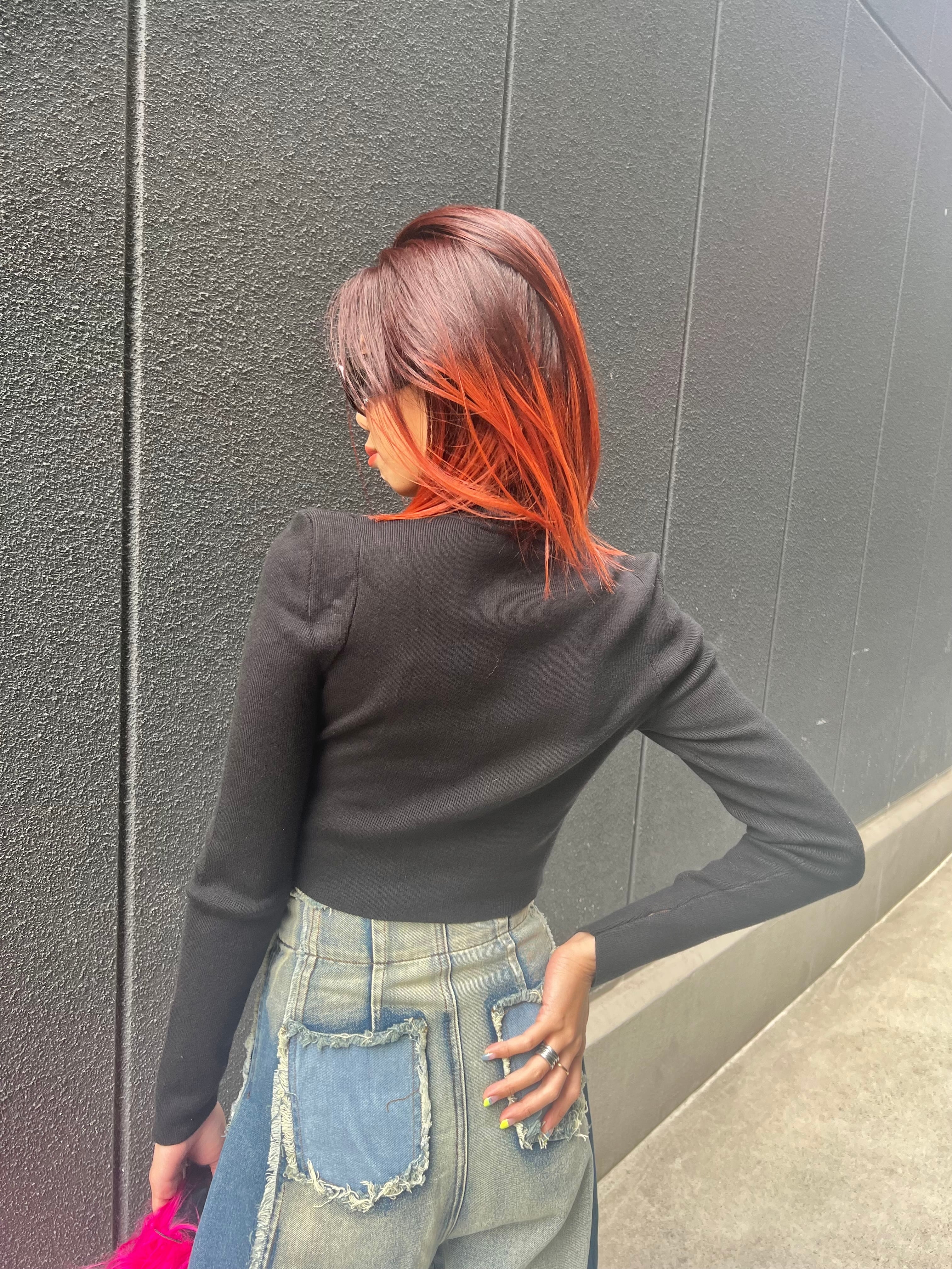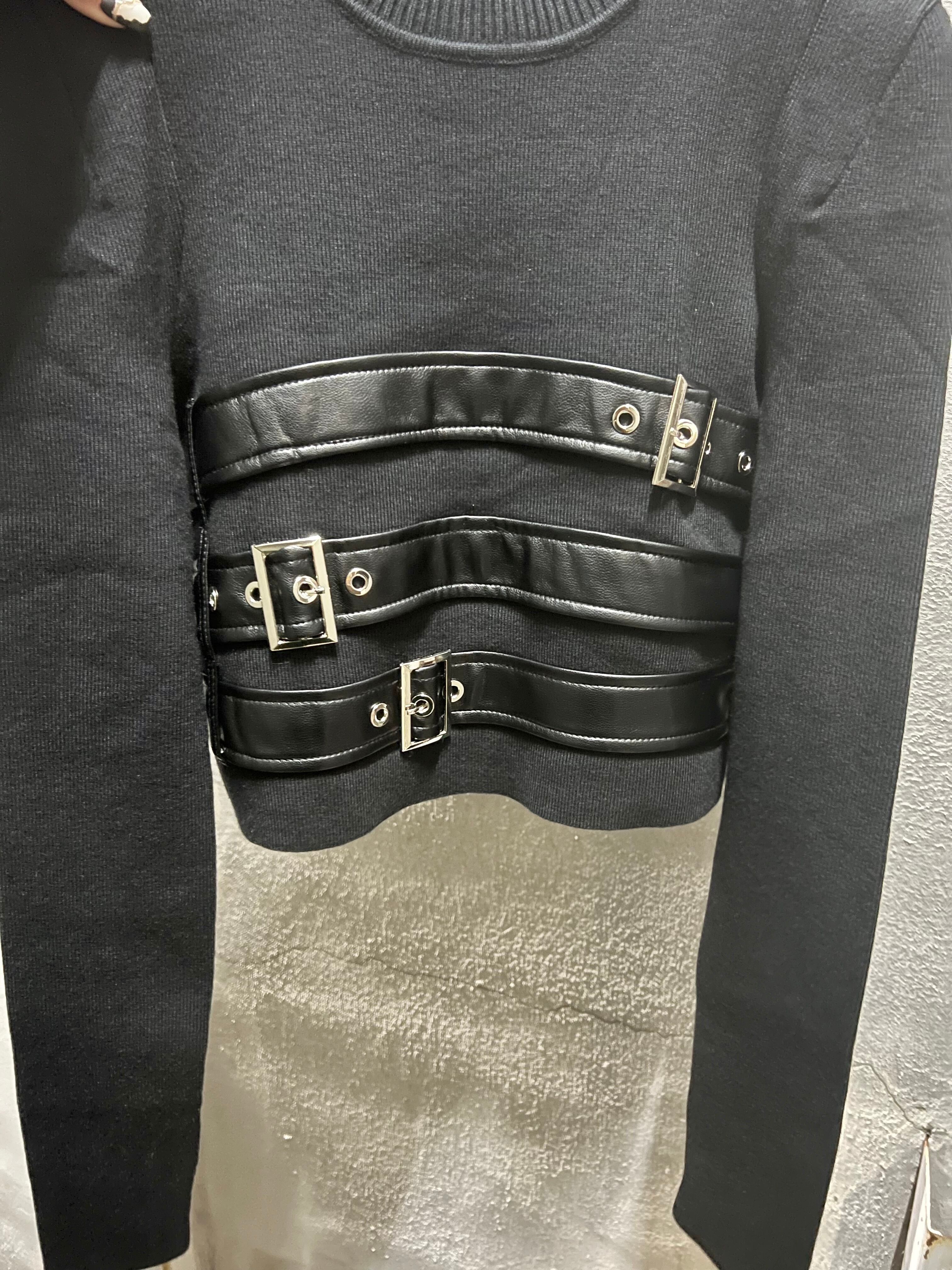 fake leather belt design knit tops トップス ニット ベルト 合皮 タイト 細身 ぴったりめ