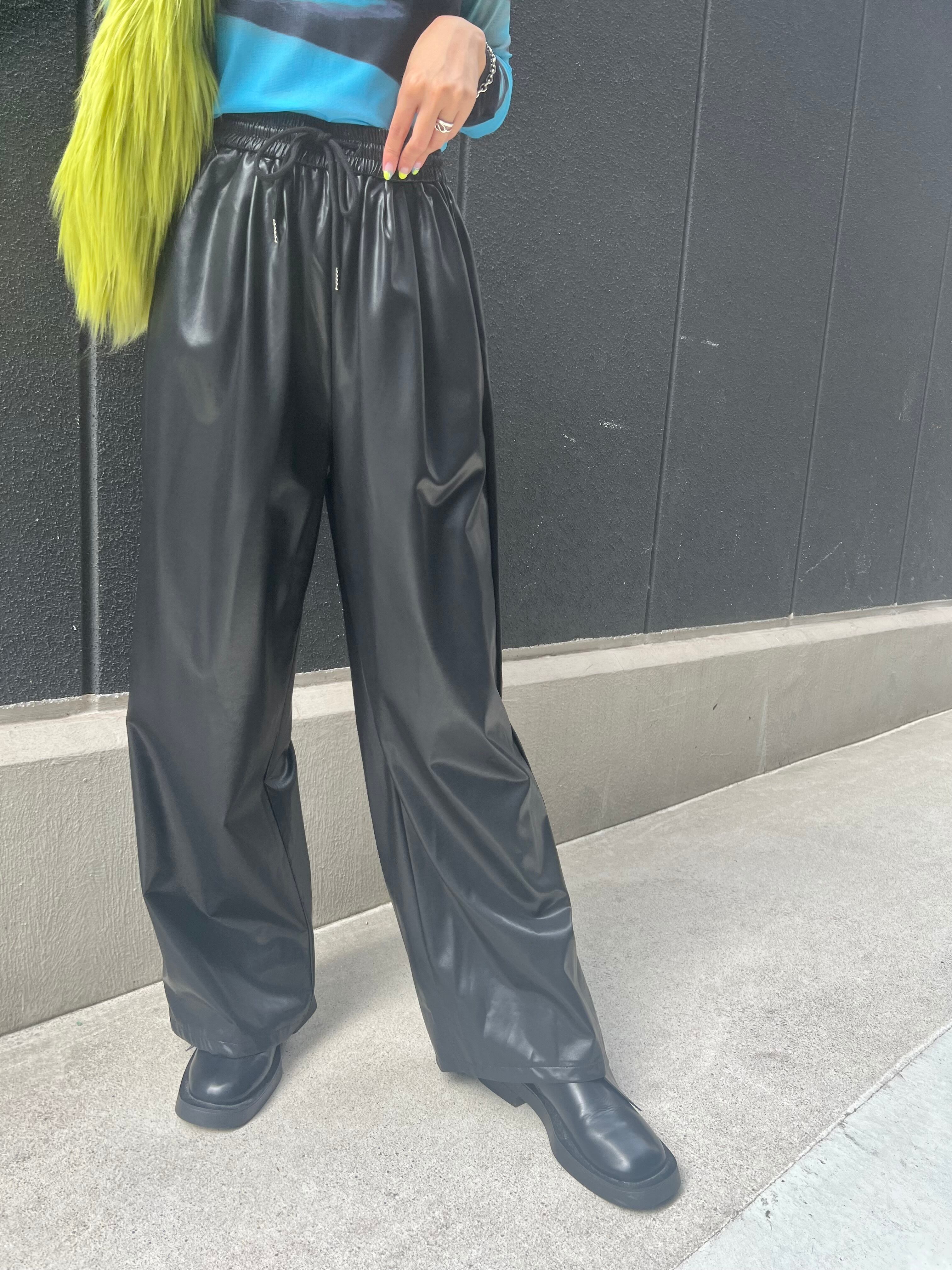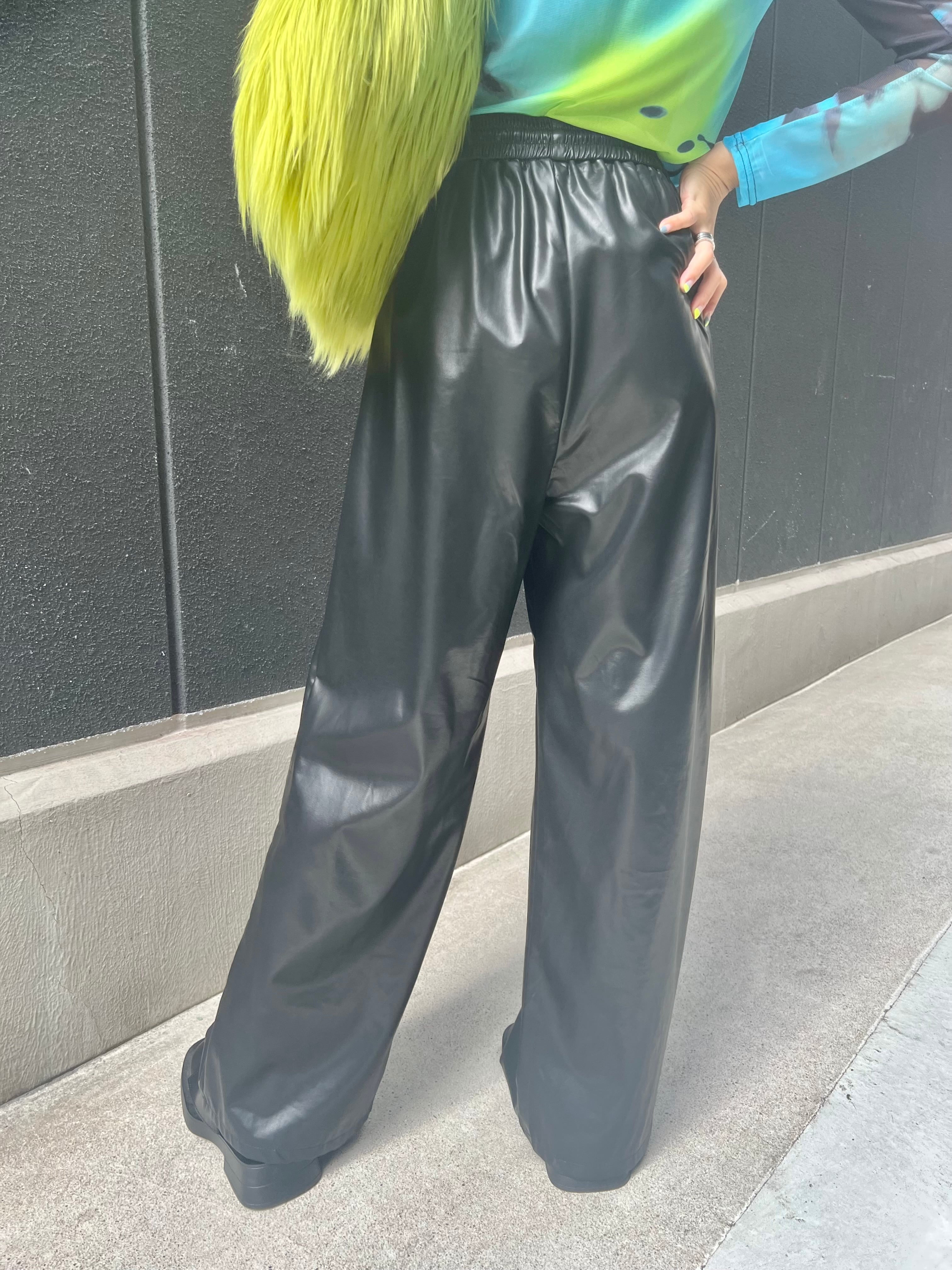 PU leather wide pants パンツ 合皮 レザー ゴムウエスト ワイドパンツ マットレザー