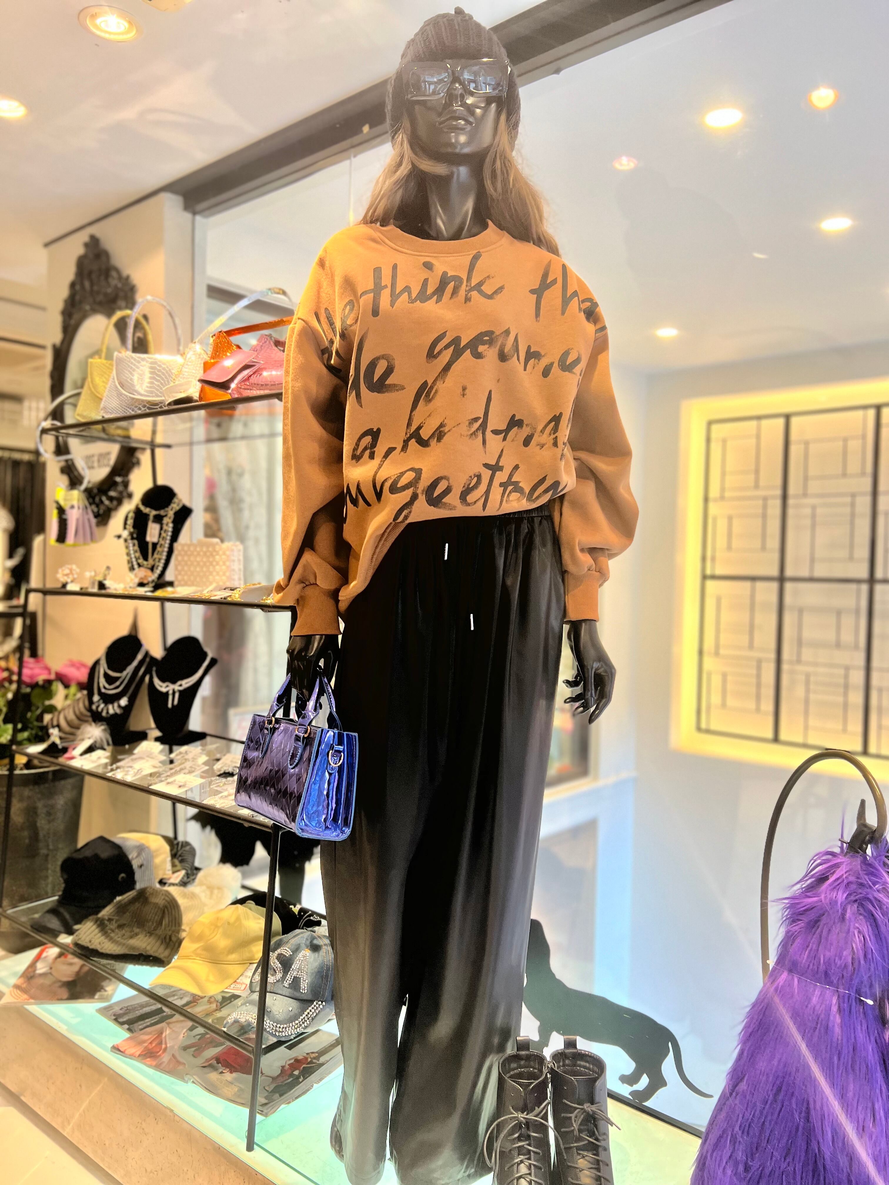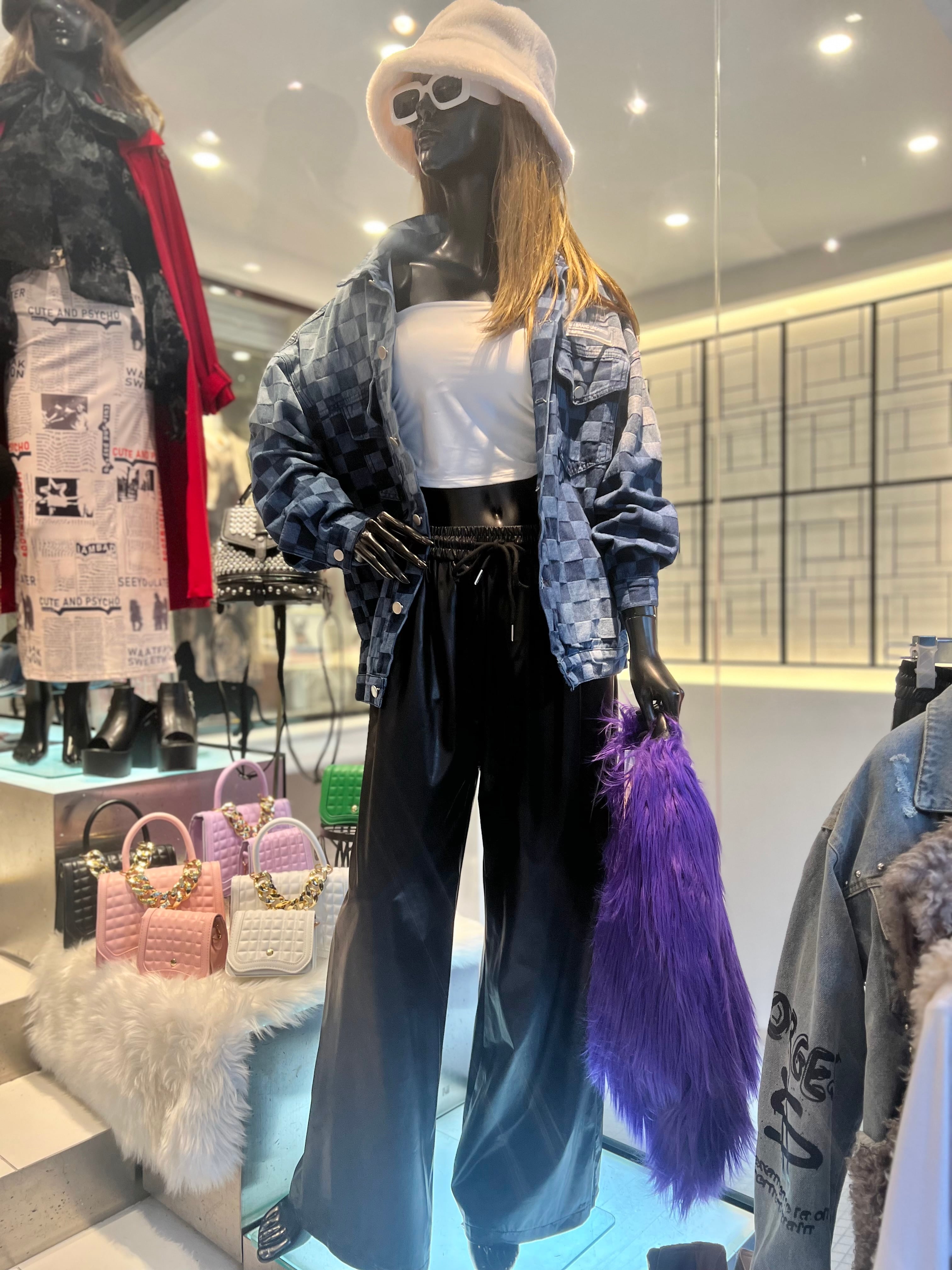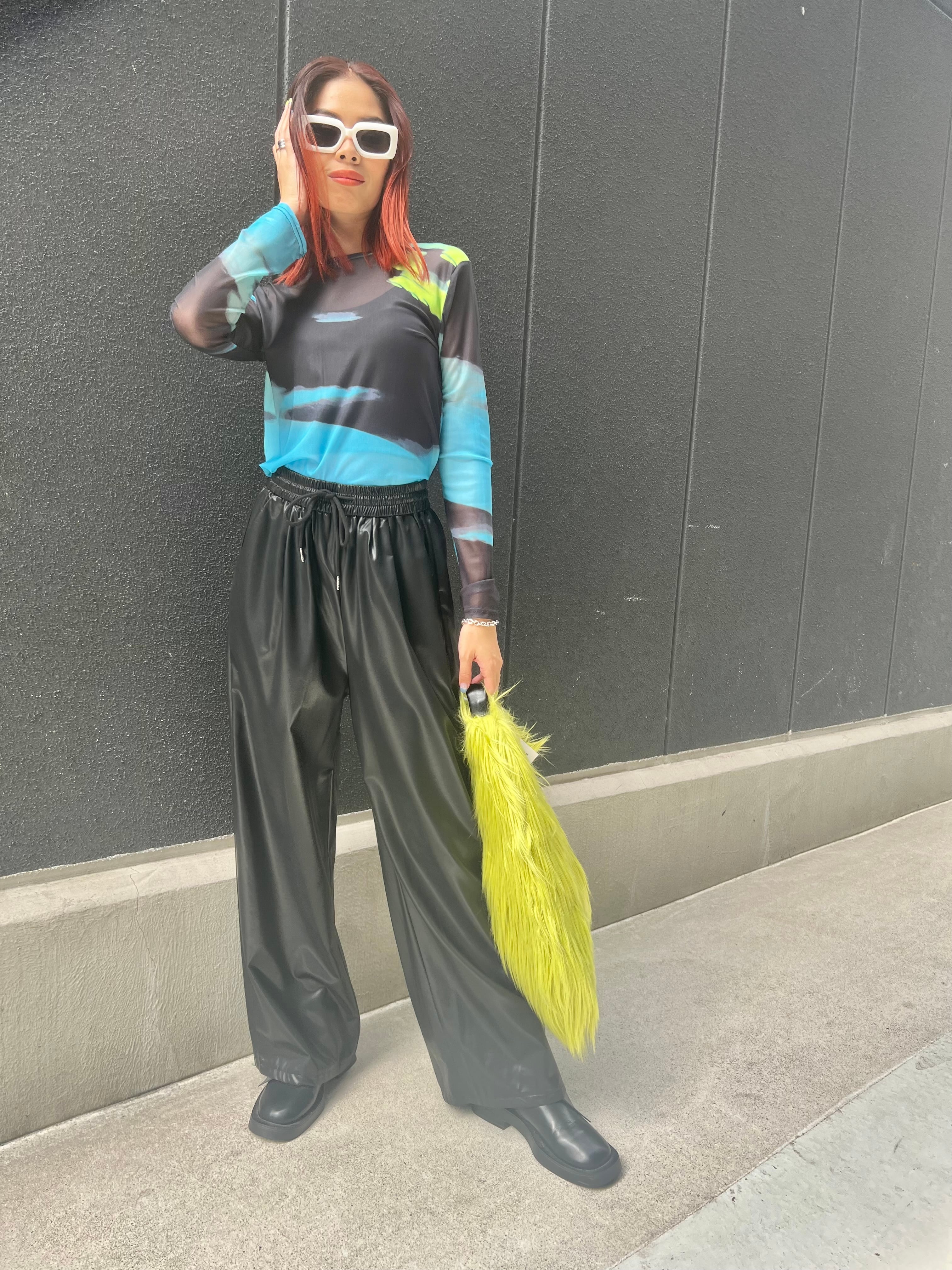 PUレザー素材のワイドパンツは、見た目のボリューム感と、長めのレングスでCOOLな印象を与えます。