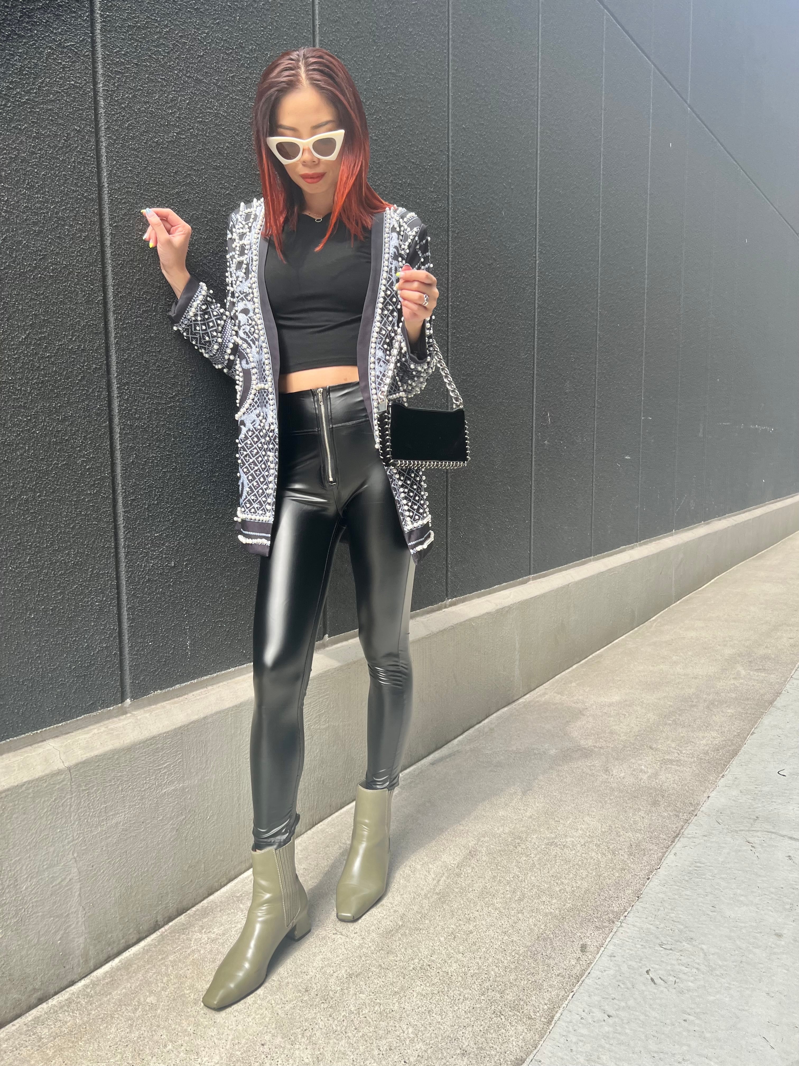 PU leather coating zip design stretch leggings パンツ レギンス レザー コーティング ジップ タイト