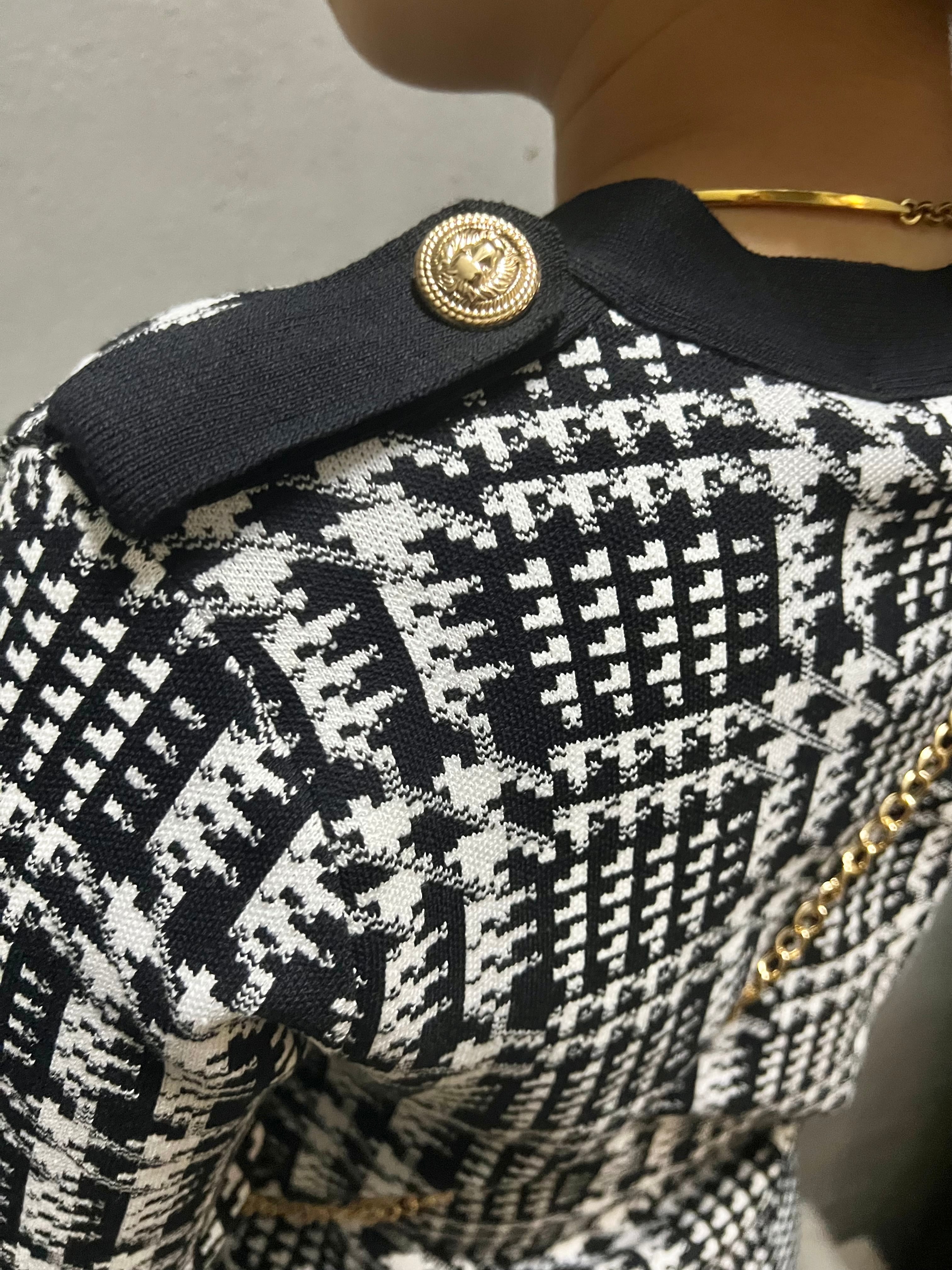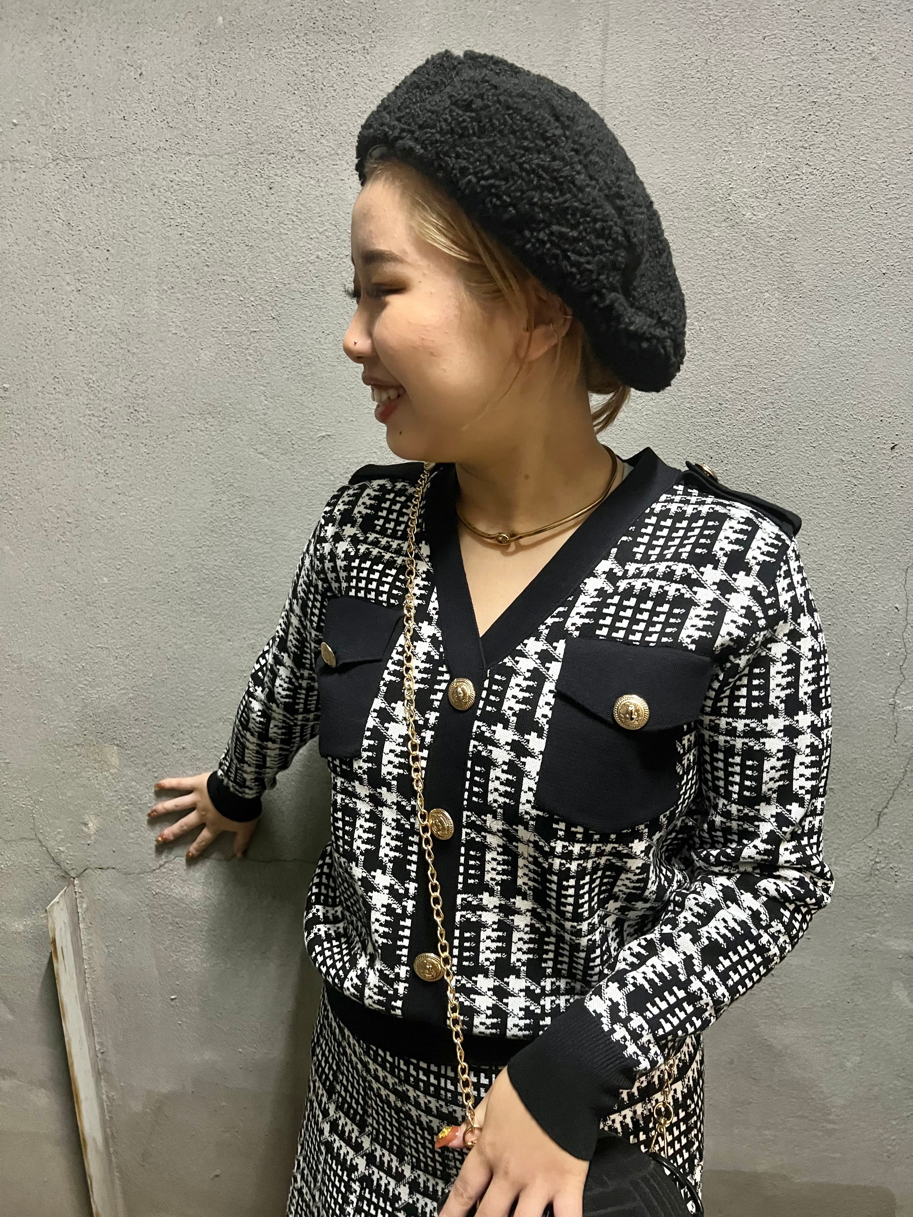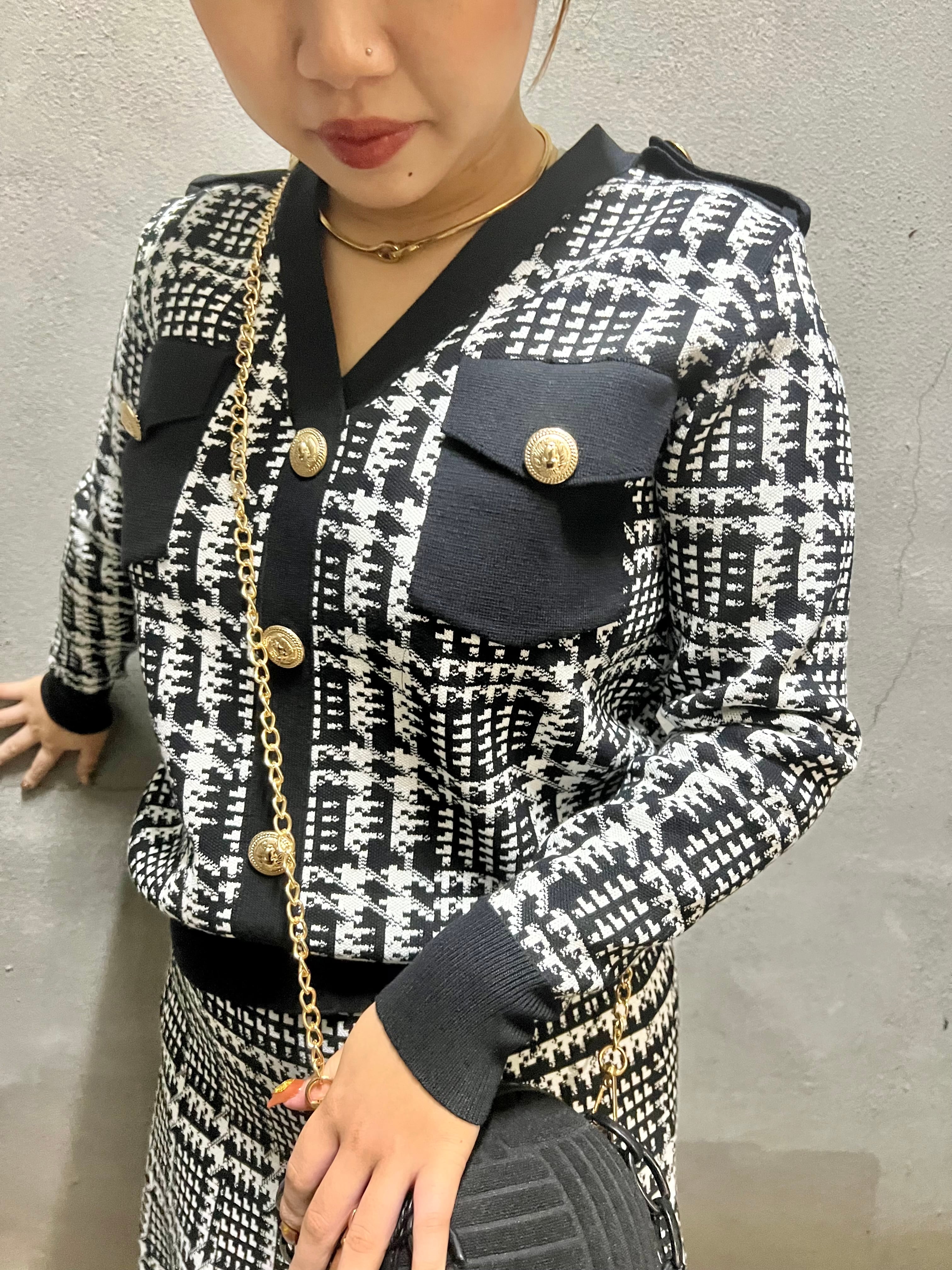 glen check knit gold button tops × skirt set up 2P セットアップ 2点セット トップス スカート チェック 金ボタン 大人可愛い