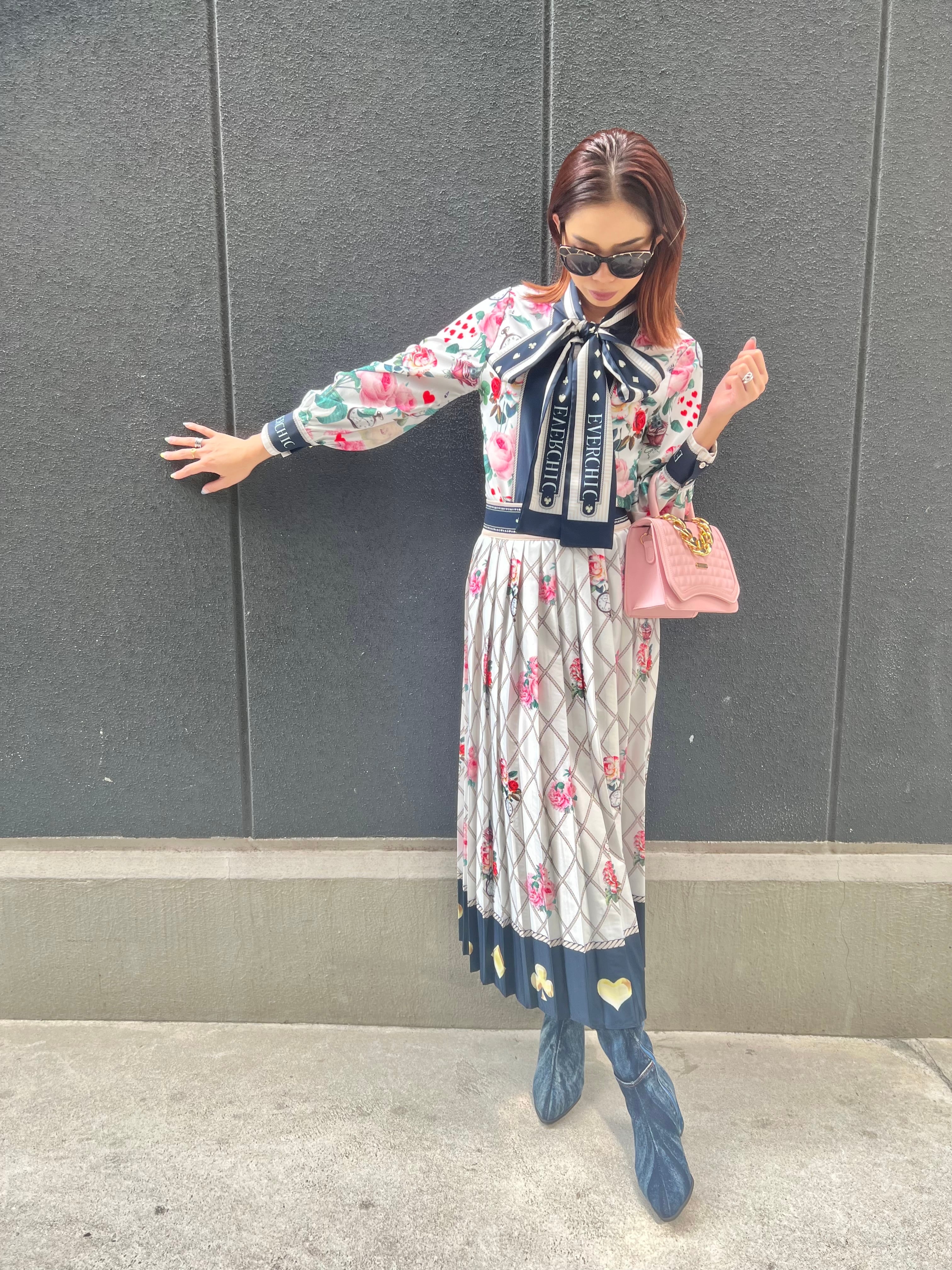 flower × watch print bow-tie blouse skirt set up セットアップ 2点セット ブラウス シャツ ボウタイ スカート 花柄