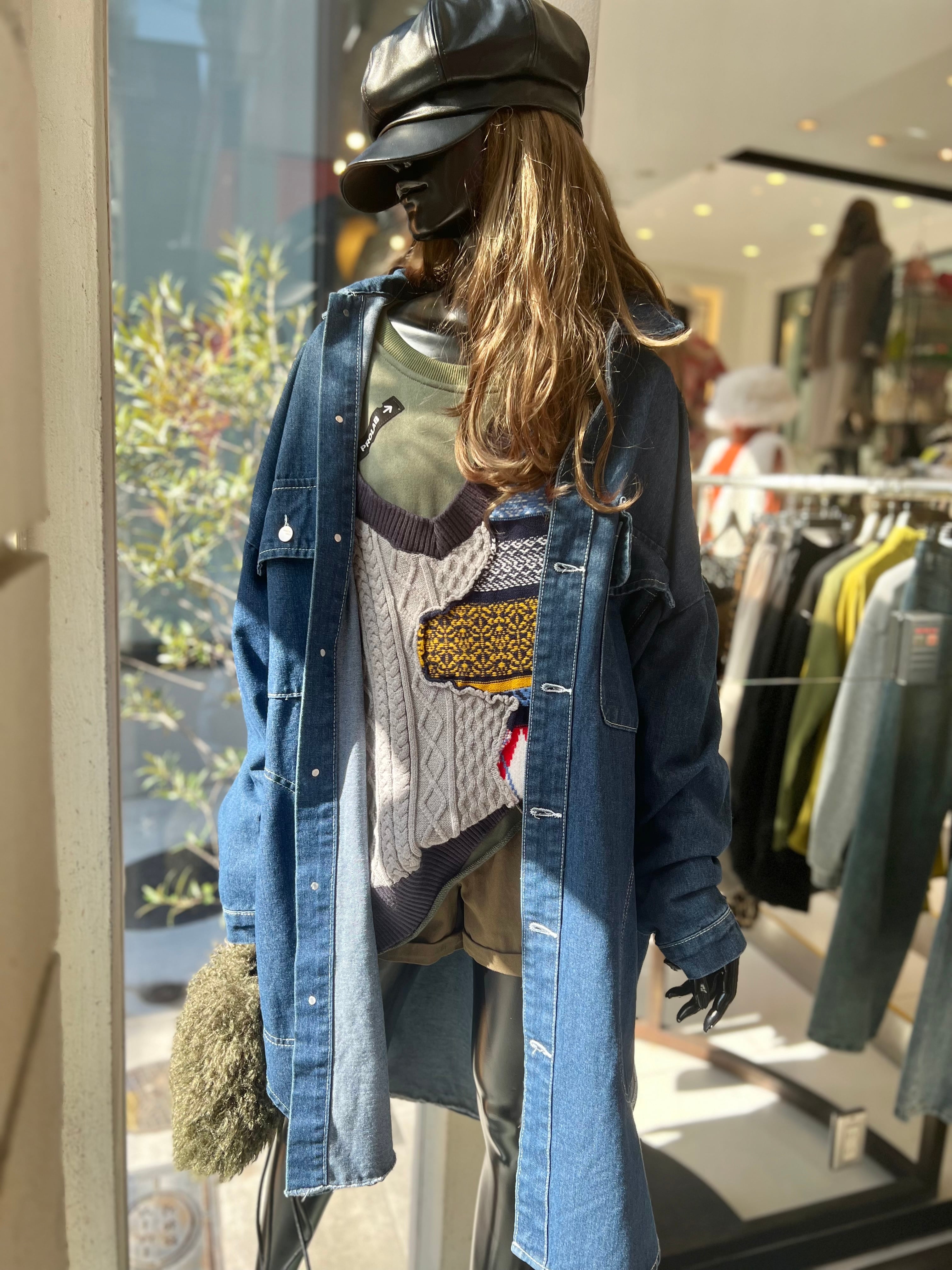 デニムとニットが組み合わさった、カジュアルながらもおしゃれ感を演出するアイテムです。オーバーサイズのサイズ感も今年らしく、着心地も抜群。