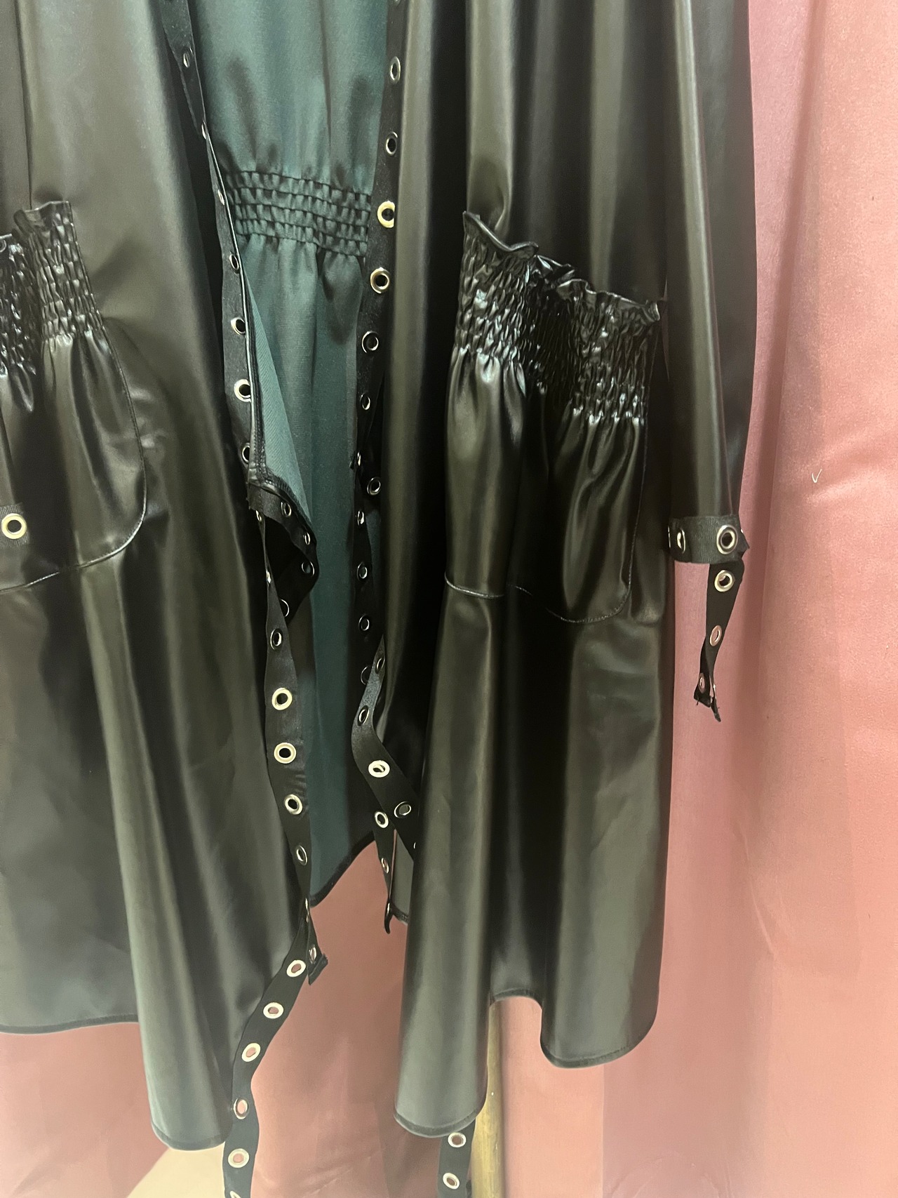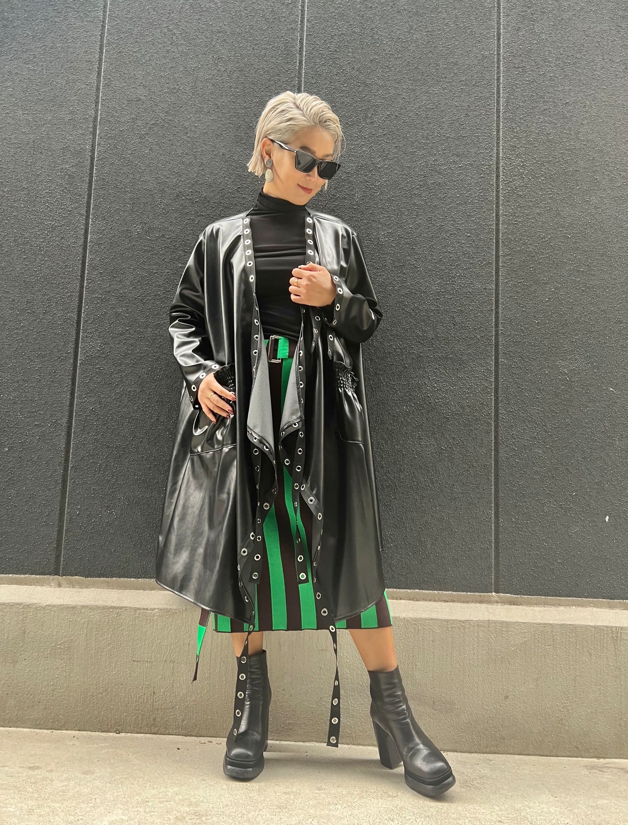 eyelet × tape eco leather design coat コート デザインコート ロングジャケット エコレザー 合皮 フェイクレザー アイレット テープ ブラック 個性的