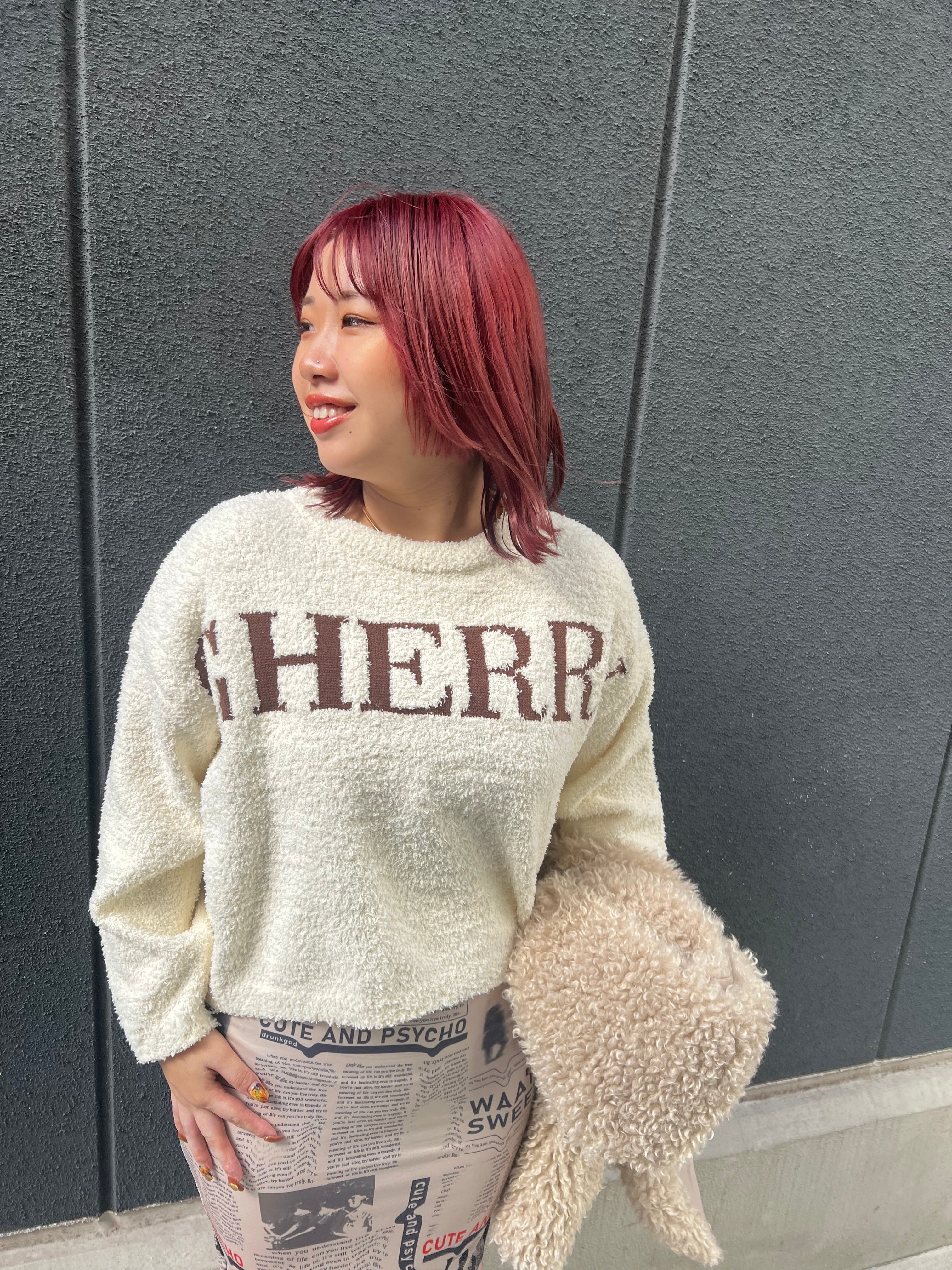 チェリーの文字がアクセントになった、肌触りの良いパイルニットショートトップスです。