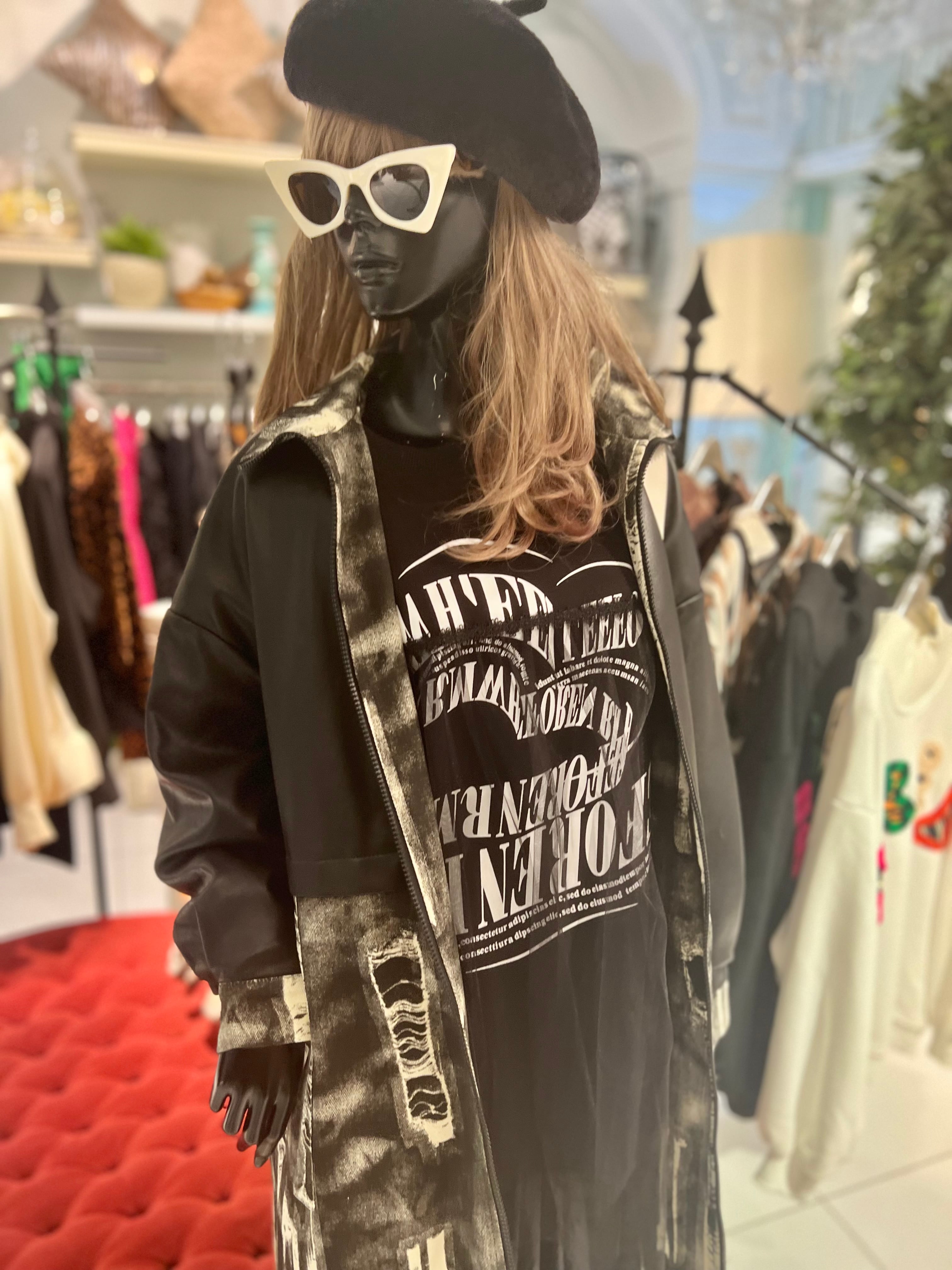 フェイクレザーの質感とダメージ柄のプリントが、モードな雰囲気を演出します。