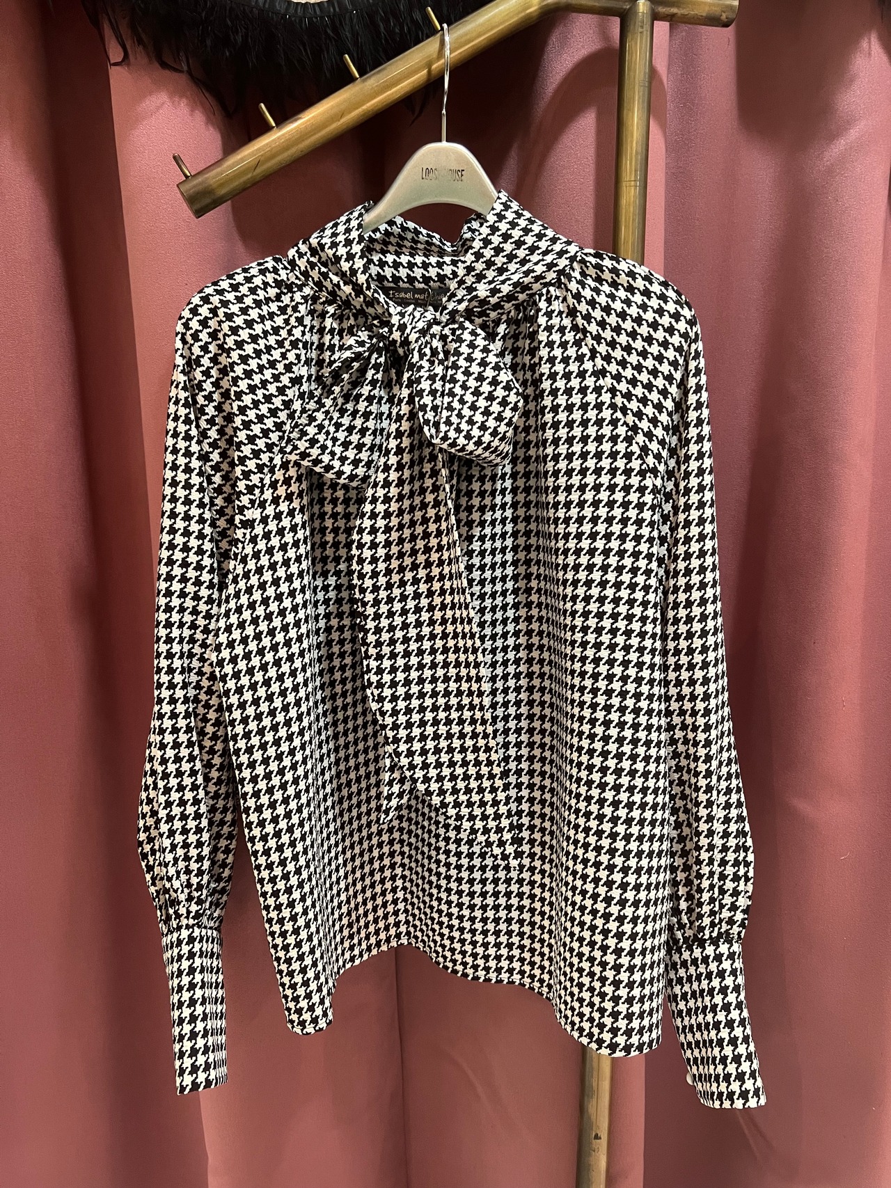 houndstooths pattern bow-tie ribbon blouse ブラウス シャツ ボウタイ リボン 千鳥格子 柄シャツ きれいめ