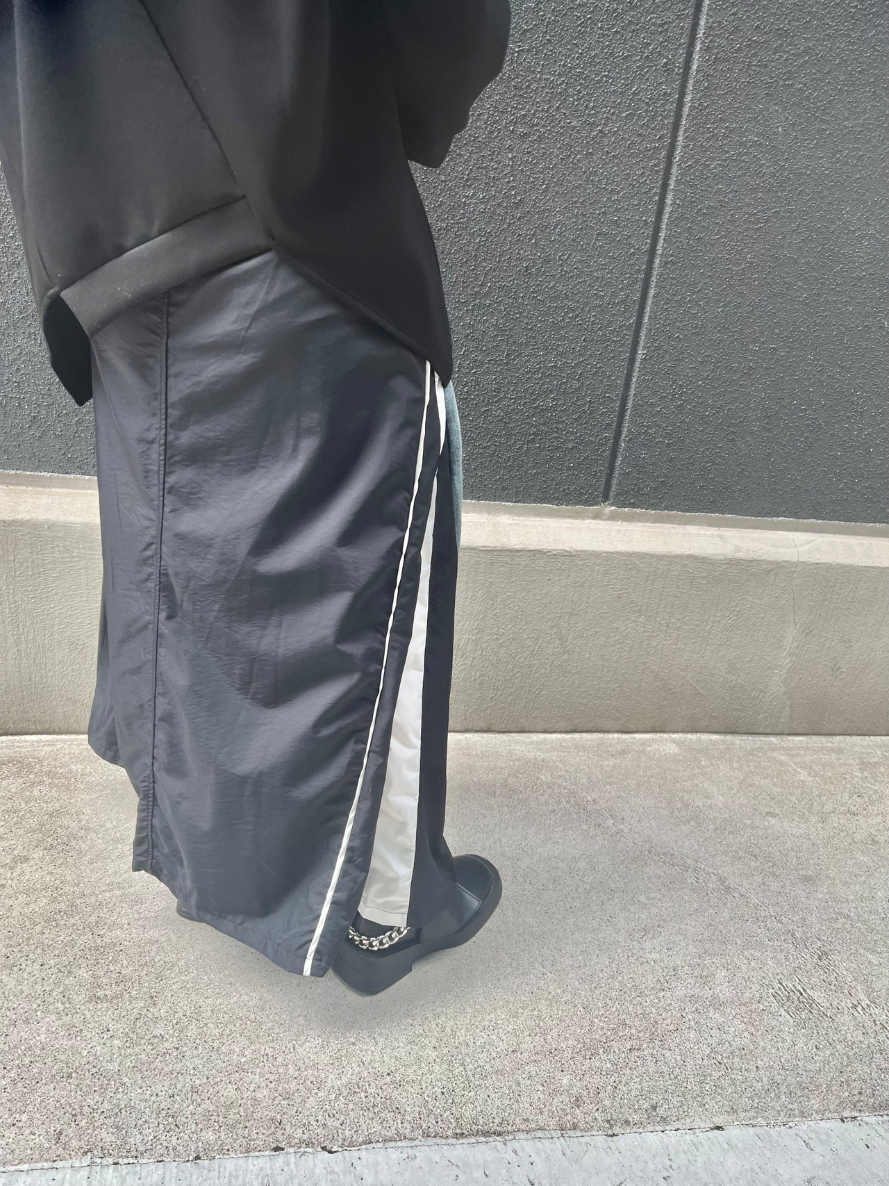 デニム×ナイロンの異素材切替デザインが目を引くカジュアルなスカートです。