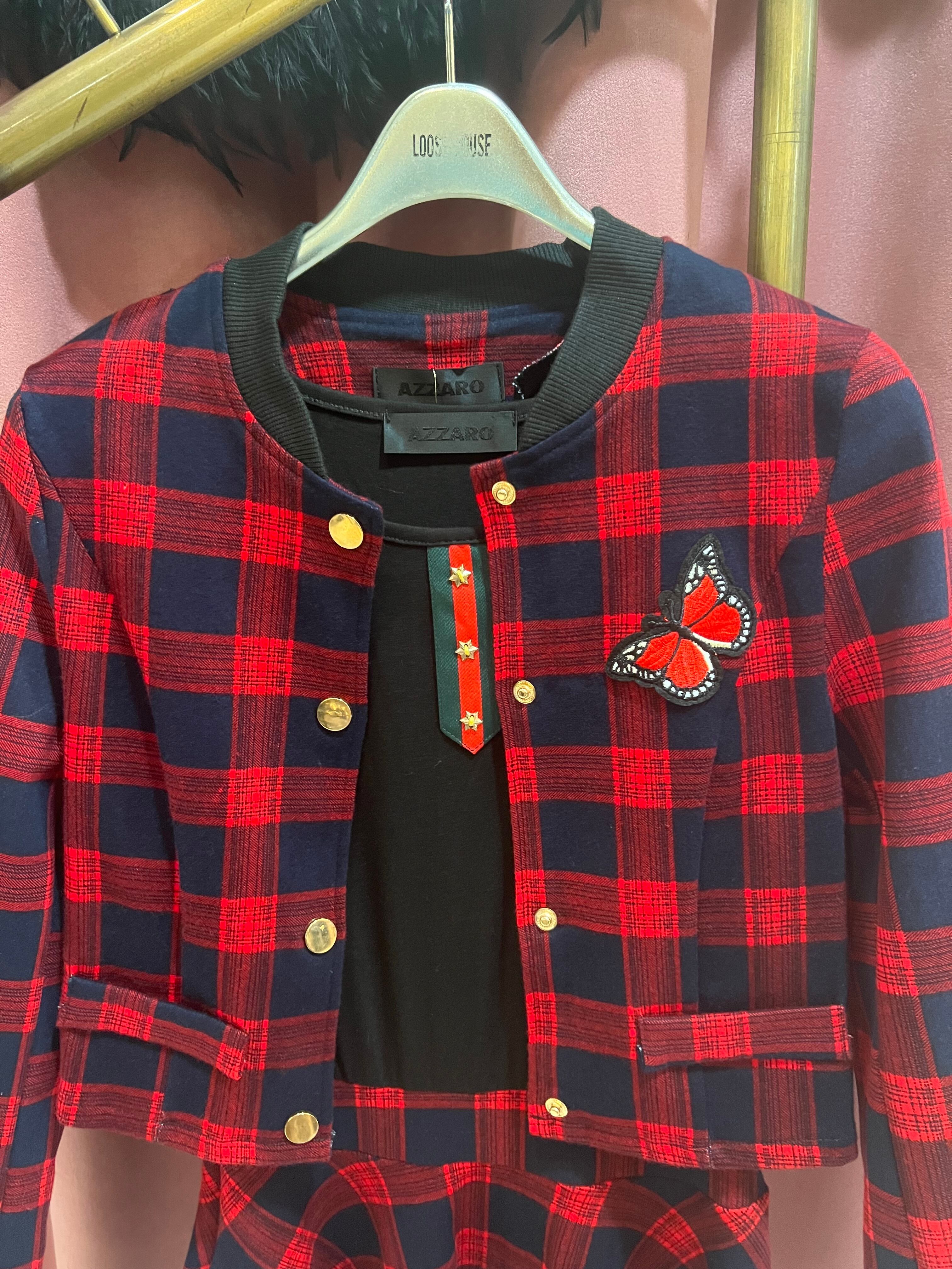 赤を基調としたチェック柄のミニ丈スカートワンピースと、お揃いのチェックジャケットのセットです。