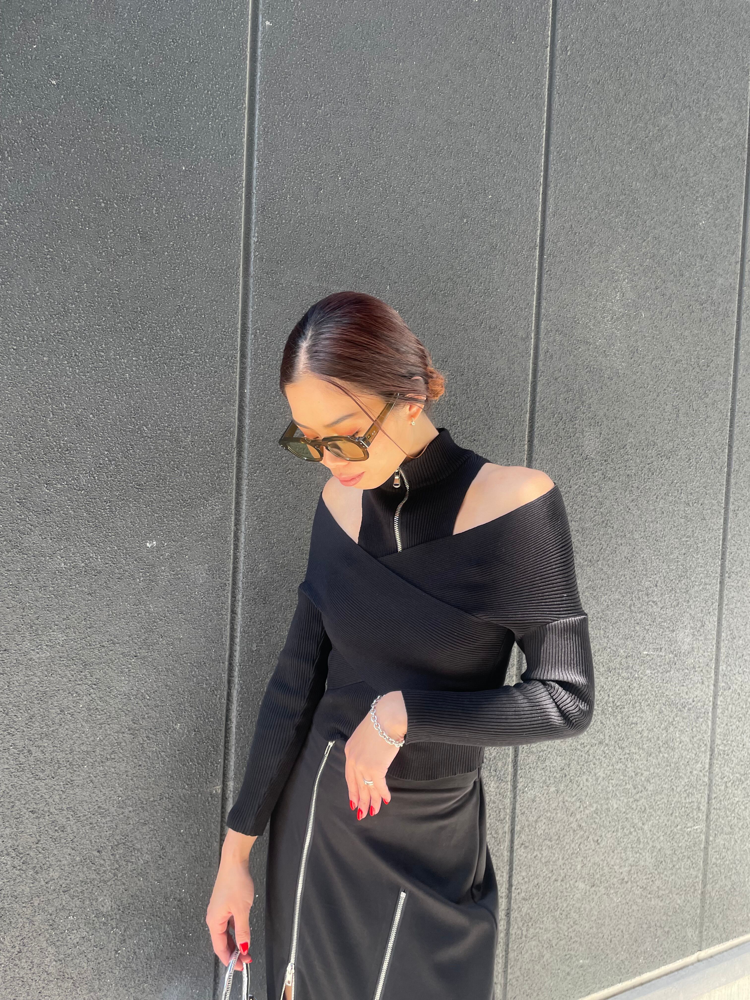 knit docking zip neck open shoulder design tops トップス ニット ジップ 肩開き オープンショルダー タイト