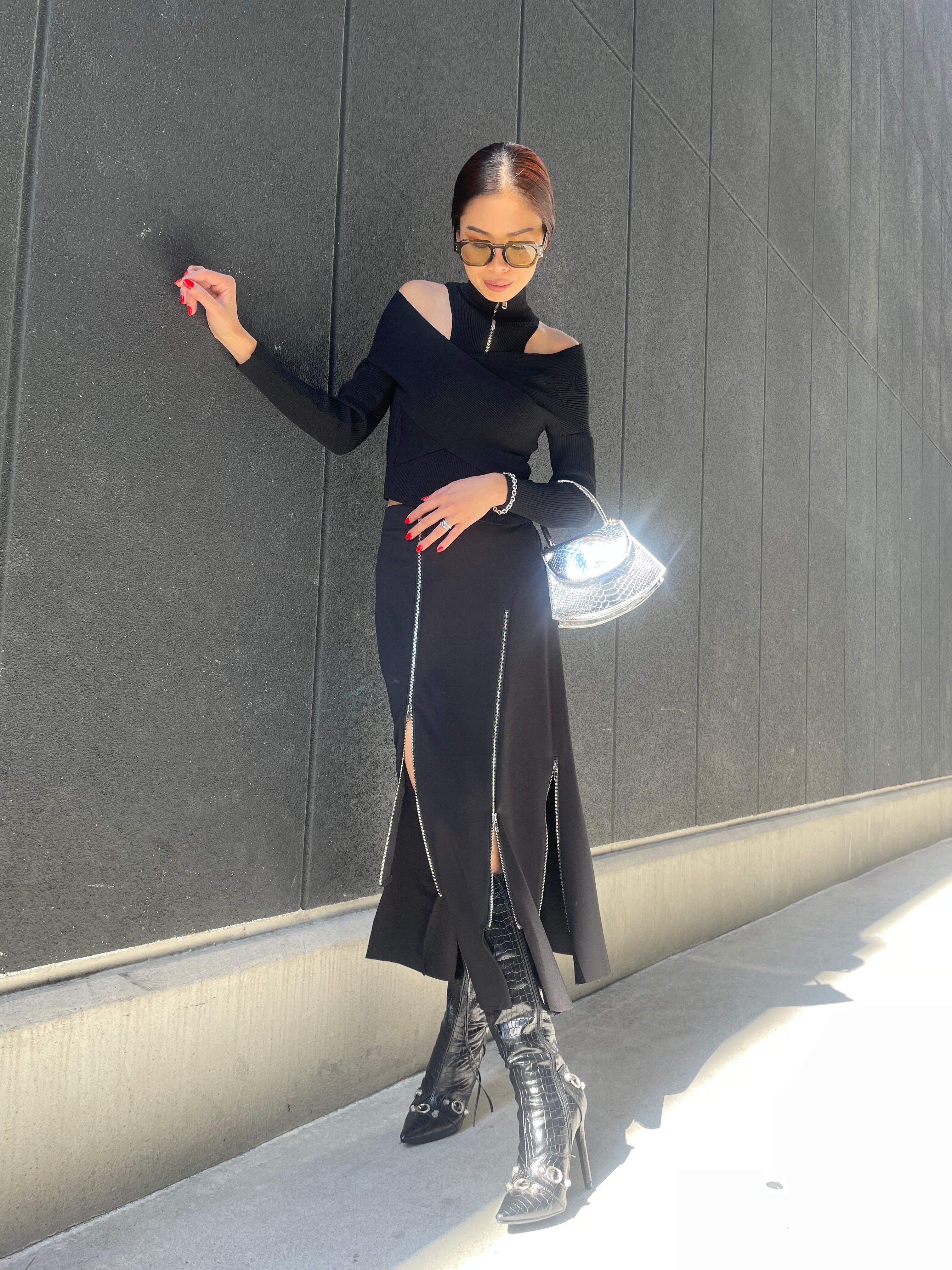 ジップネックがアクセントになり、オープンショルダーが肌見せ感を演出します。