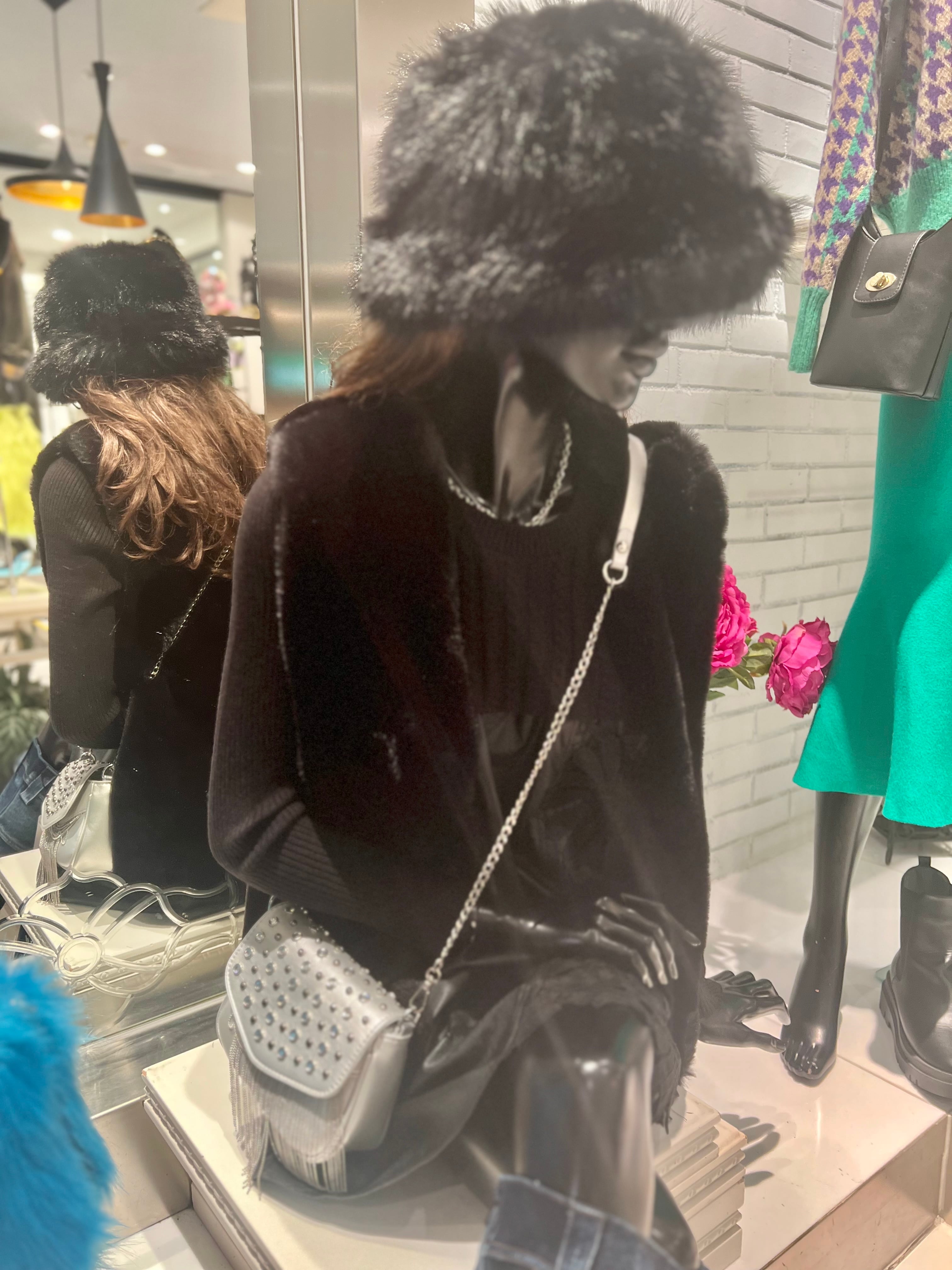 ニット素材の上品な光沢感と、エコレザーとレースの組み合わせが大人っぽい印象を与えます。