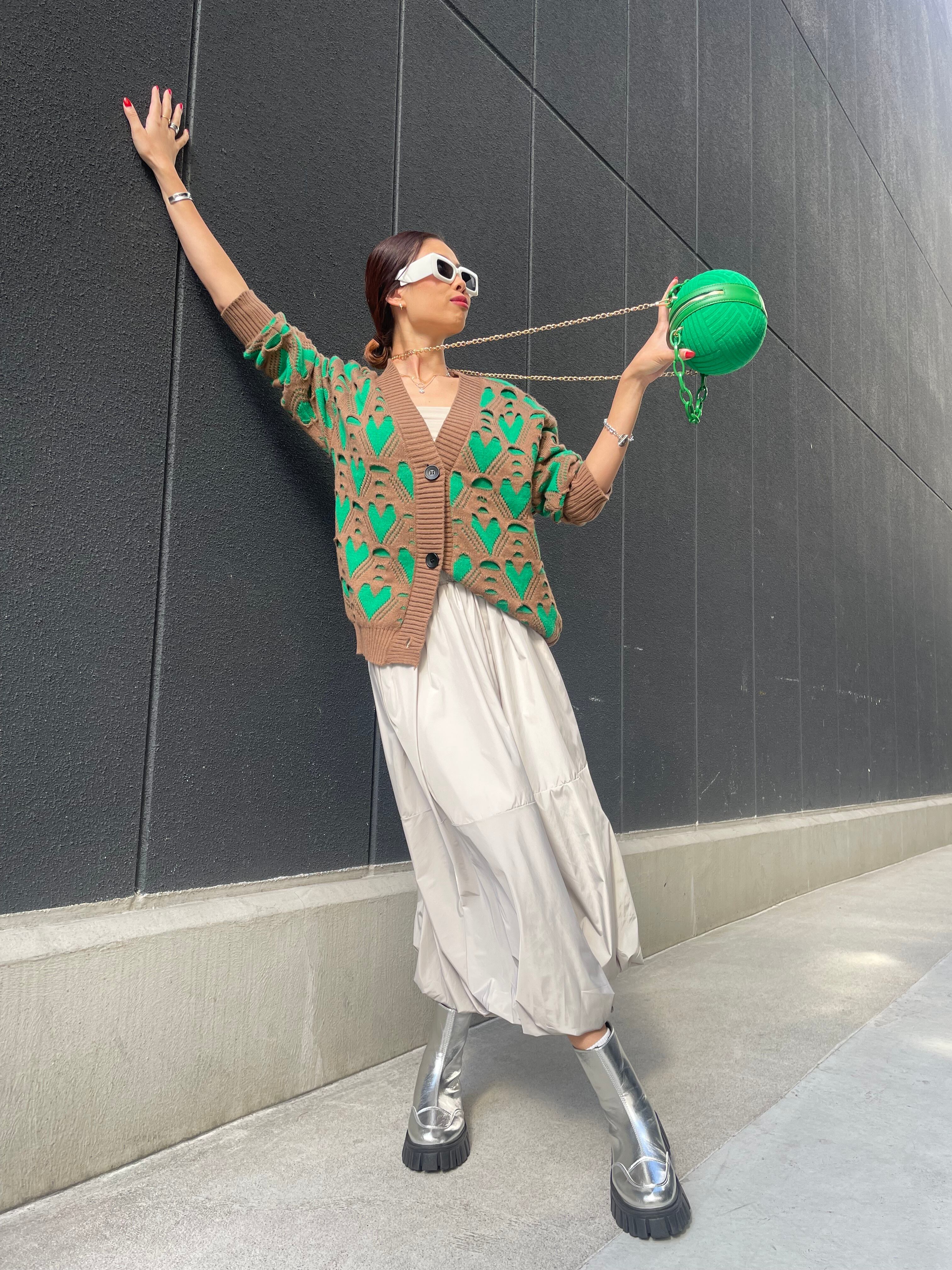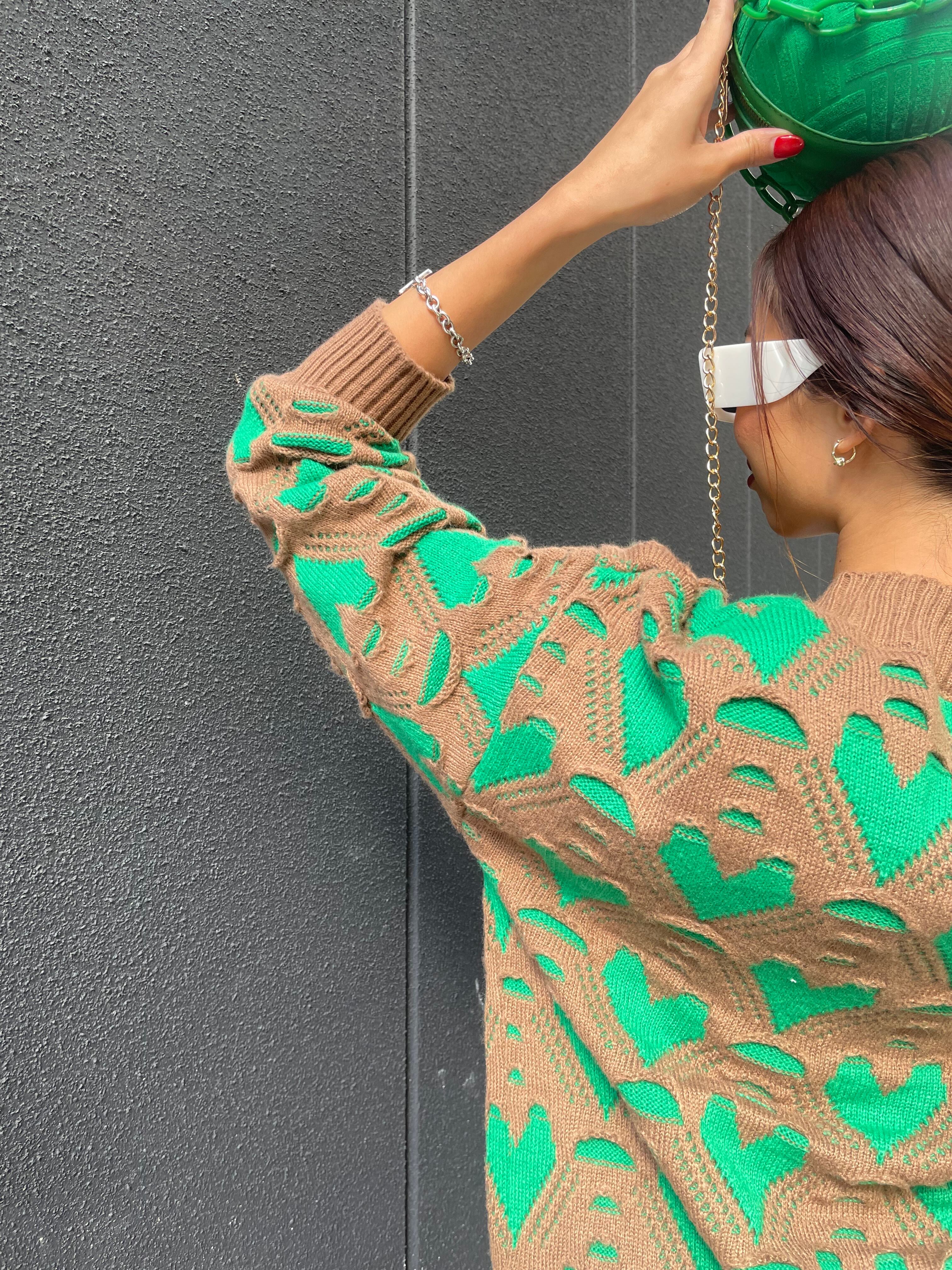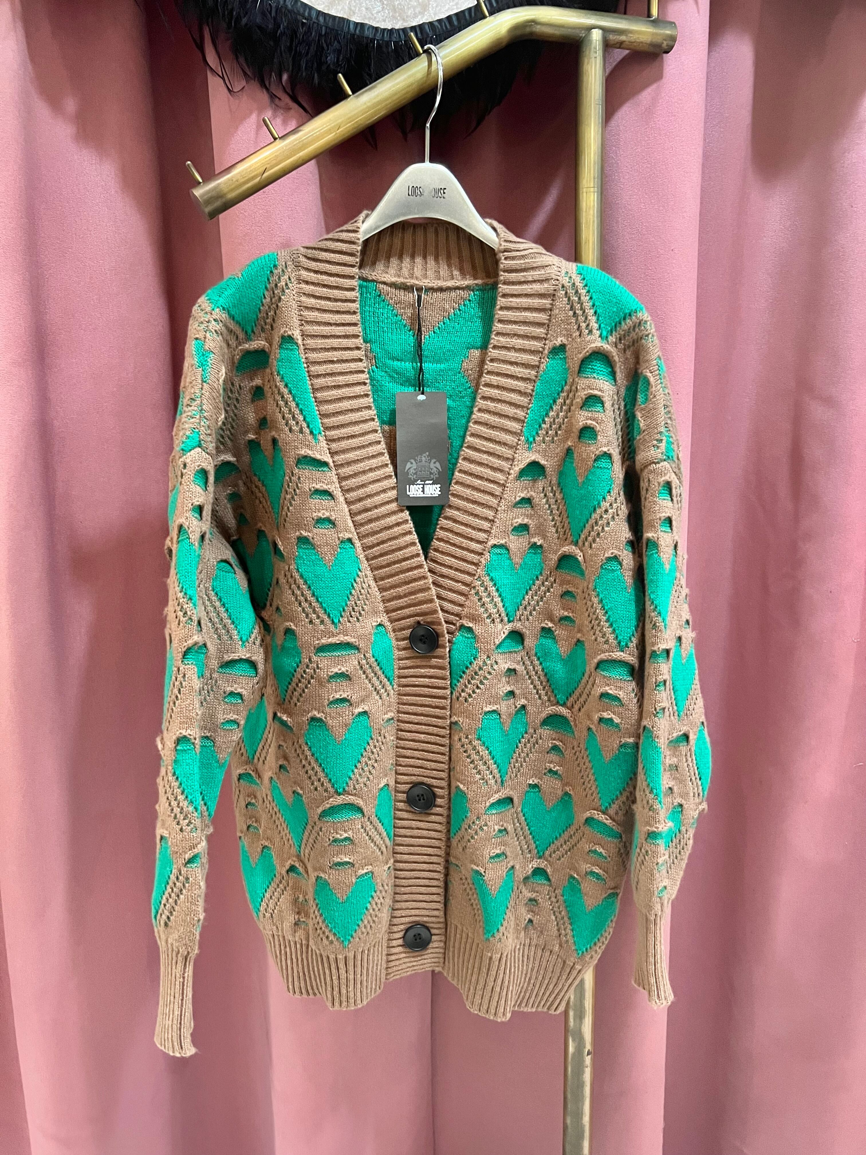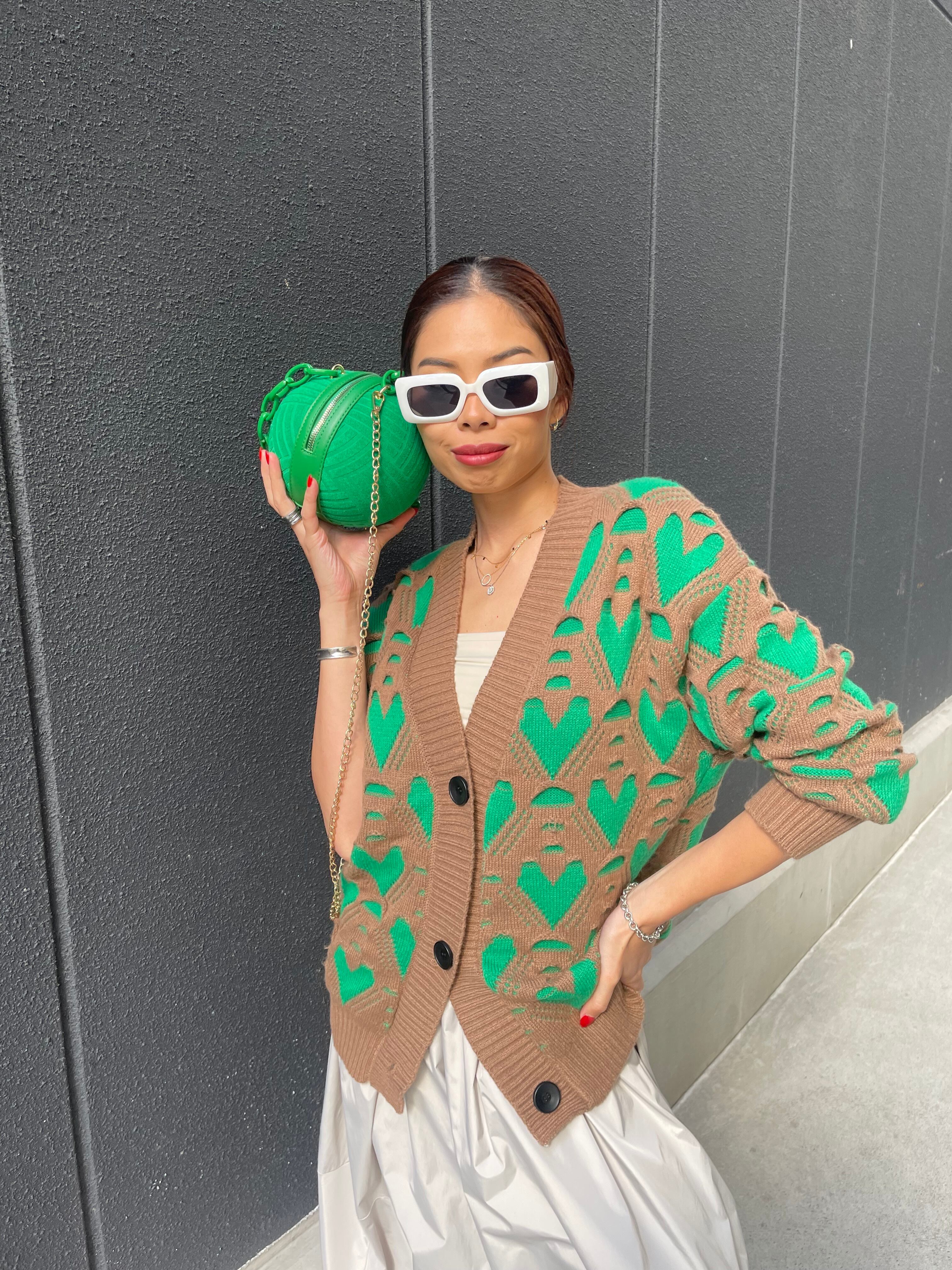green heart knit cardigan ニット カーディガン ニットカーデ ハート 配色 バイカラー Vネック