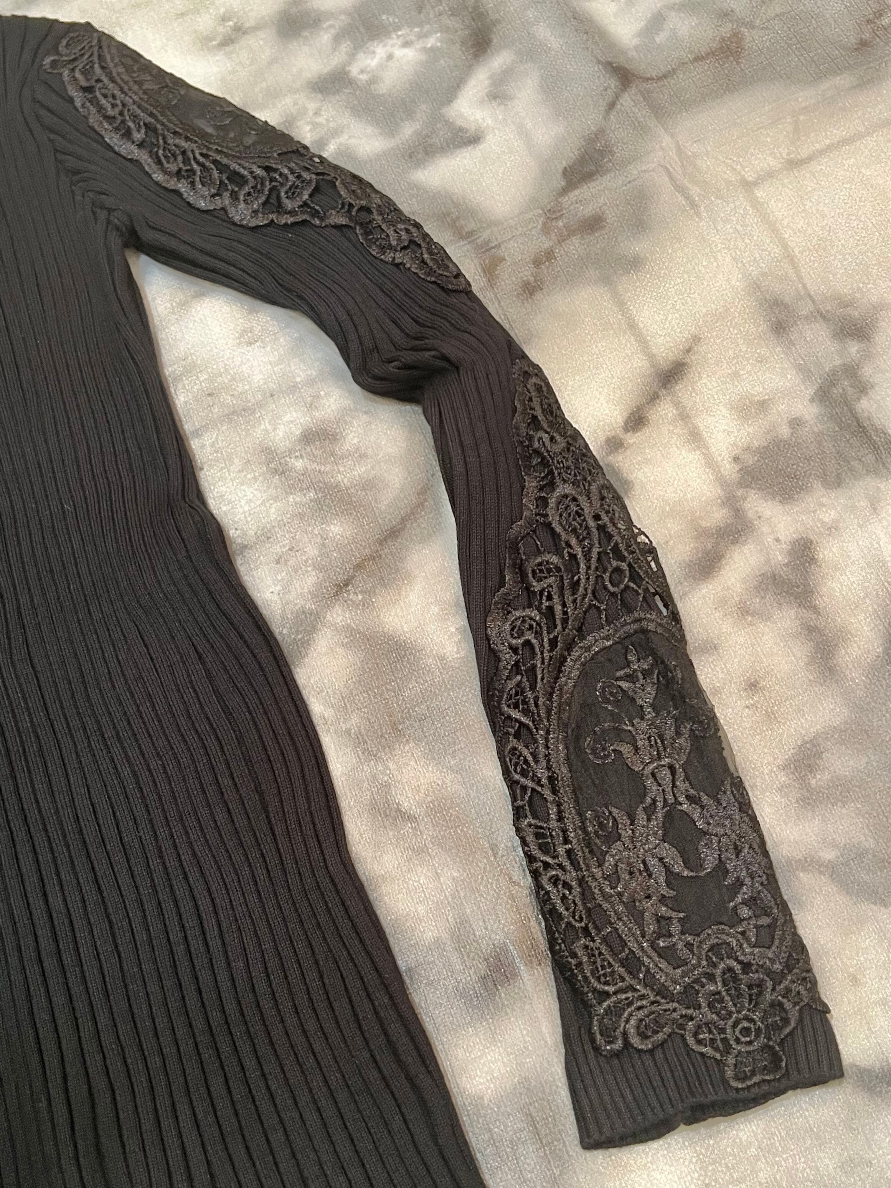 レーススリーブの透け感がオシャレなテレコニットトップス。