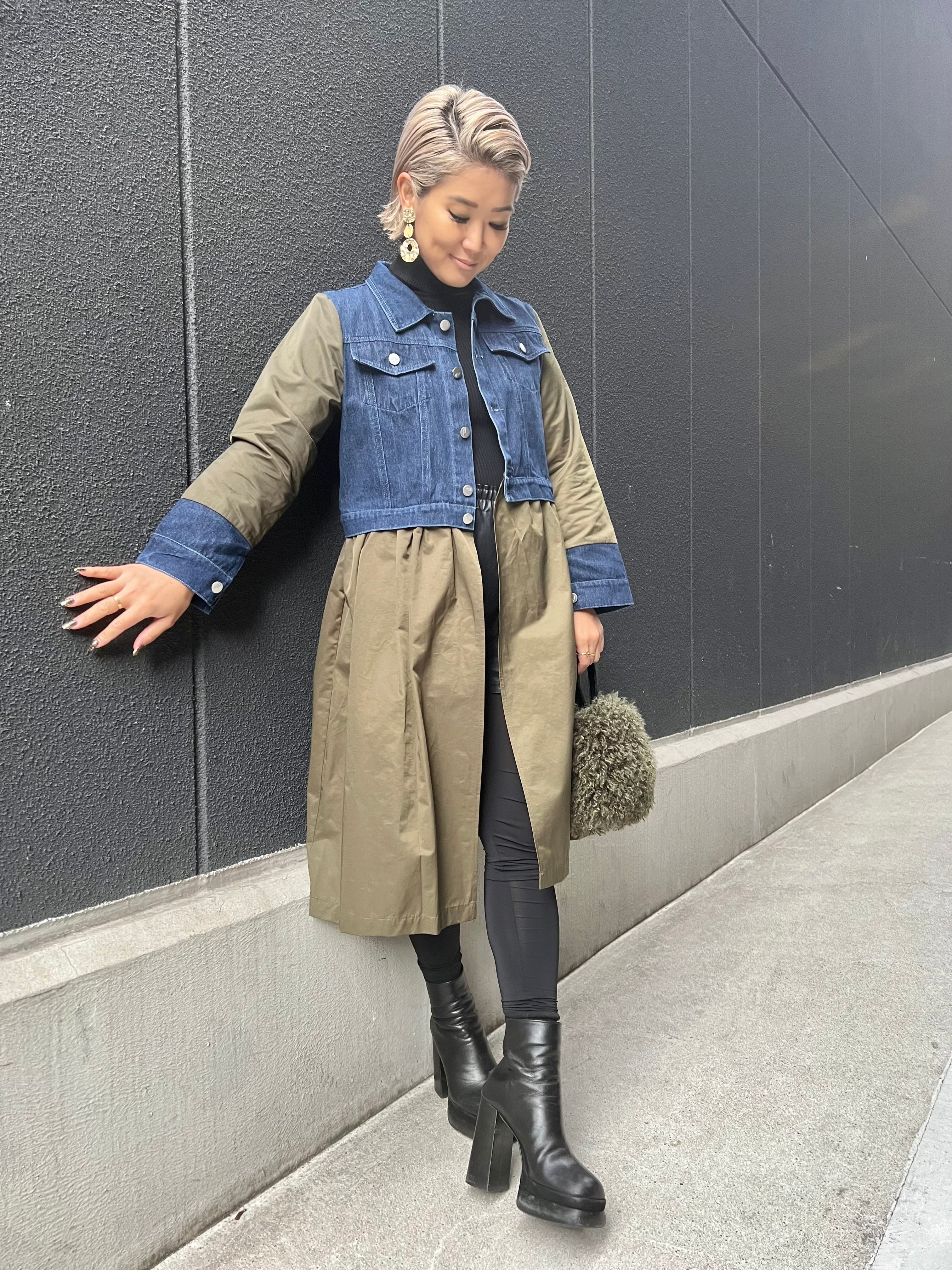 洗練されたカーキ色とデニムの組み合わせが特徴的な一枚で、異素材切替がおしゃれなアクセントになっています♪